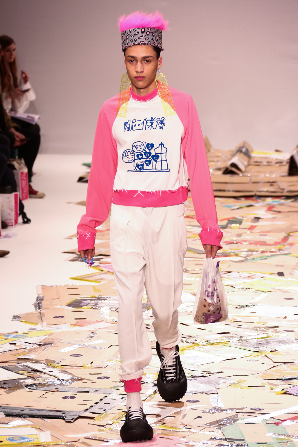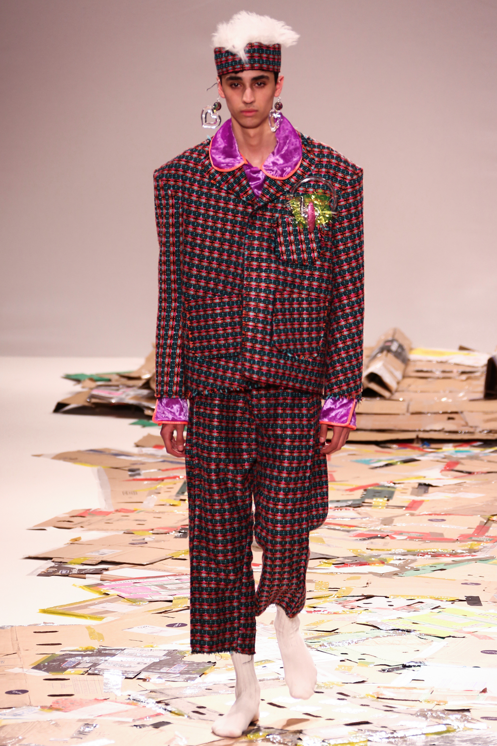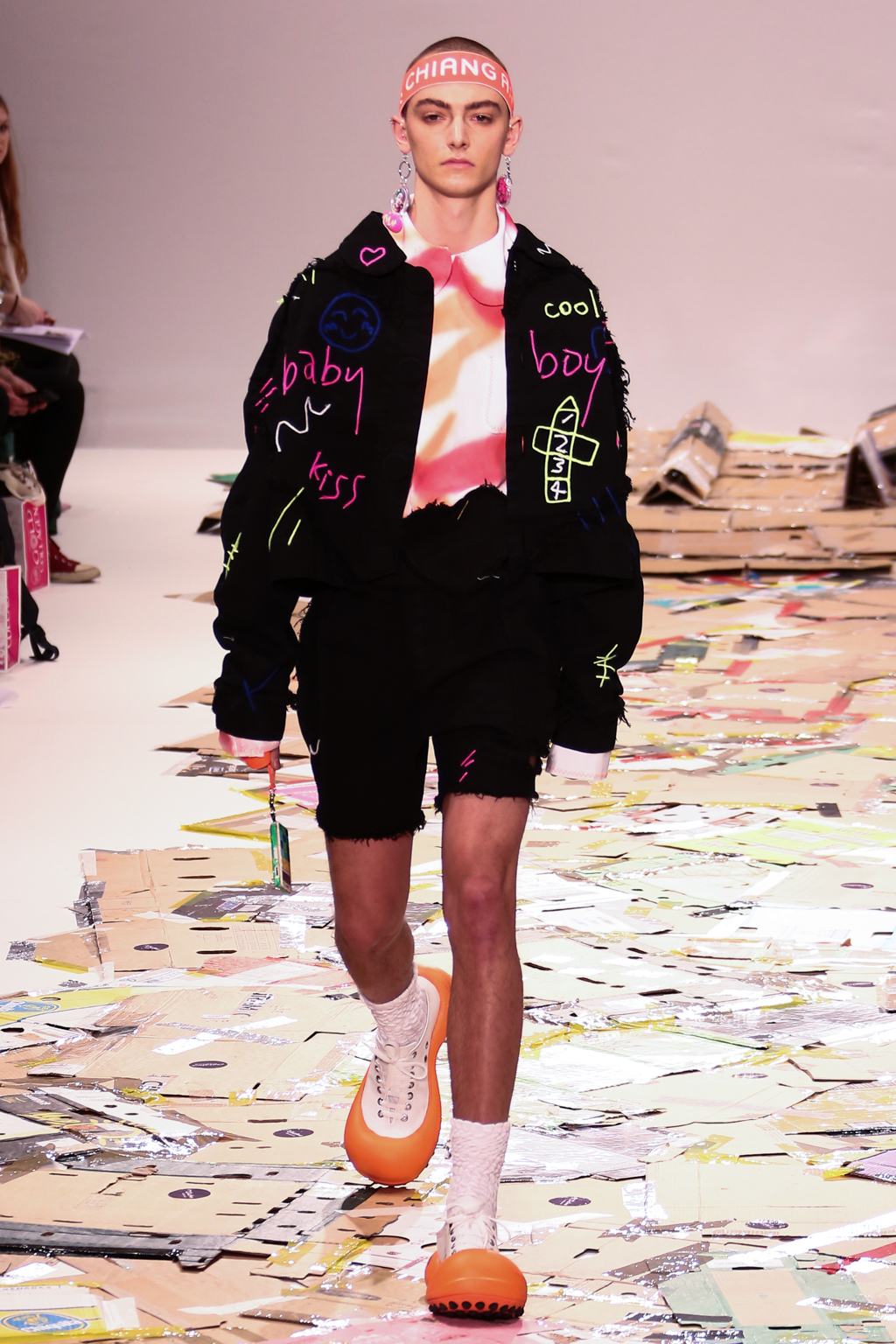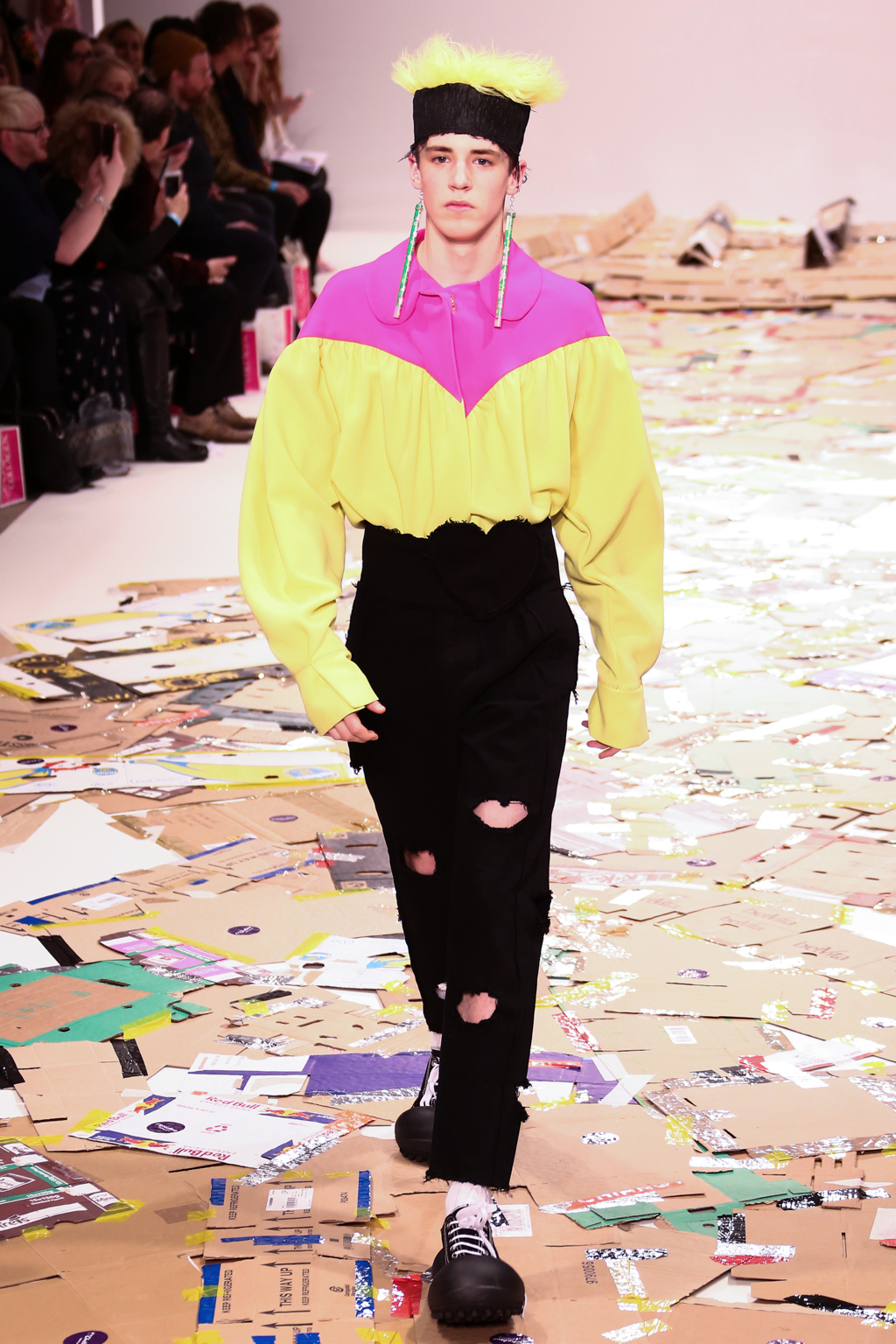 Angus Chiang’s collection Credit Sheet took the audience back to the schoolyard. Continuing his playful take on menswear, Chiang’s models walked out onto a cardboard catwalk in his signature oversized rubber shoes in colourful outfits inspired by 90s electronic music and hip-hop culture. The runway, held together by neon tape, juxtaposed beautifully with the grand setting at the Freemason’s Hall.