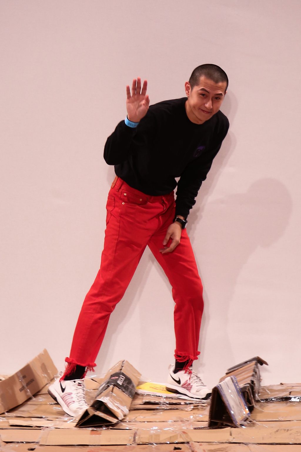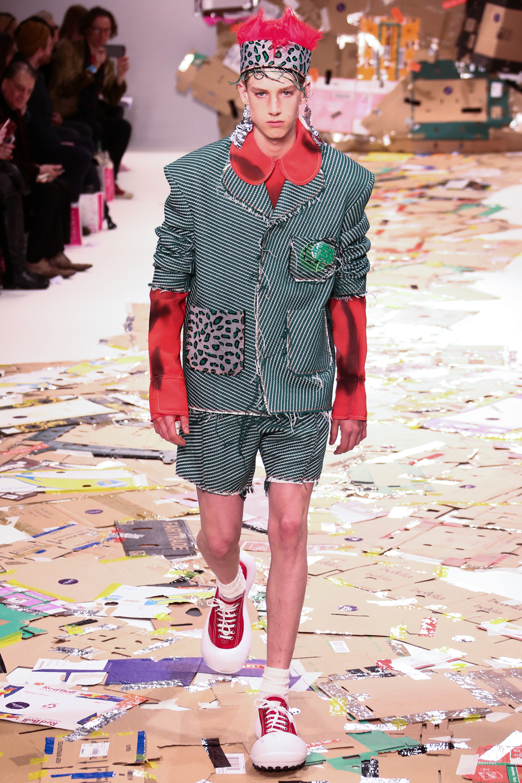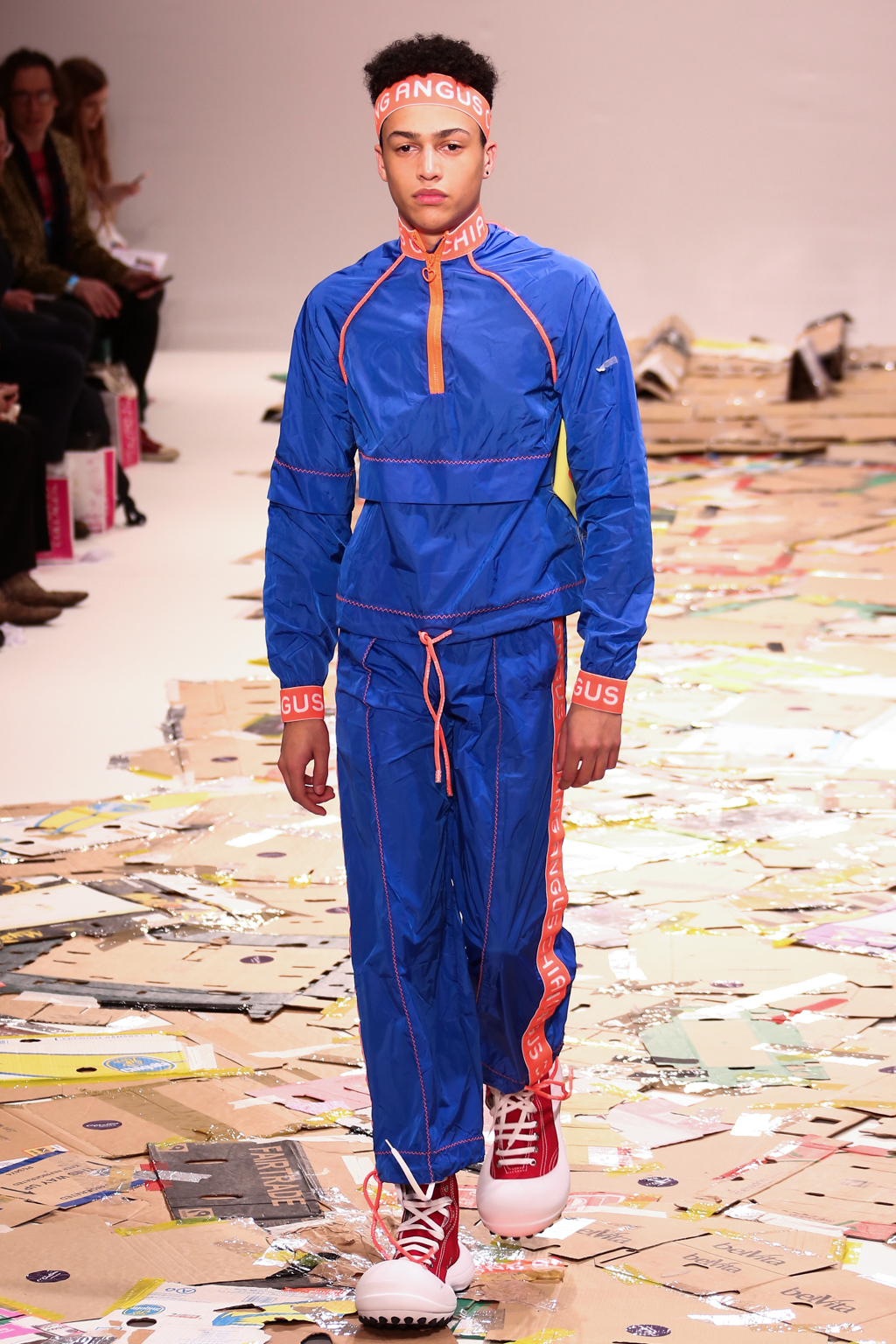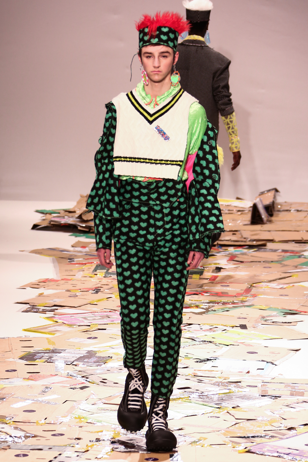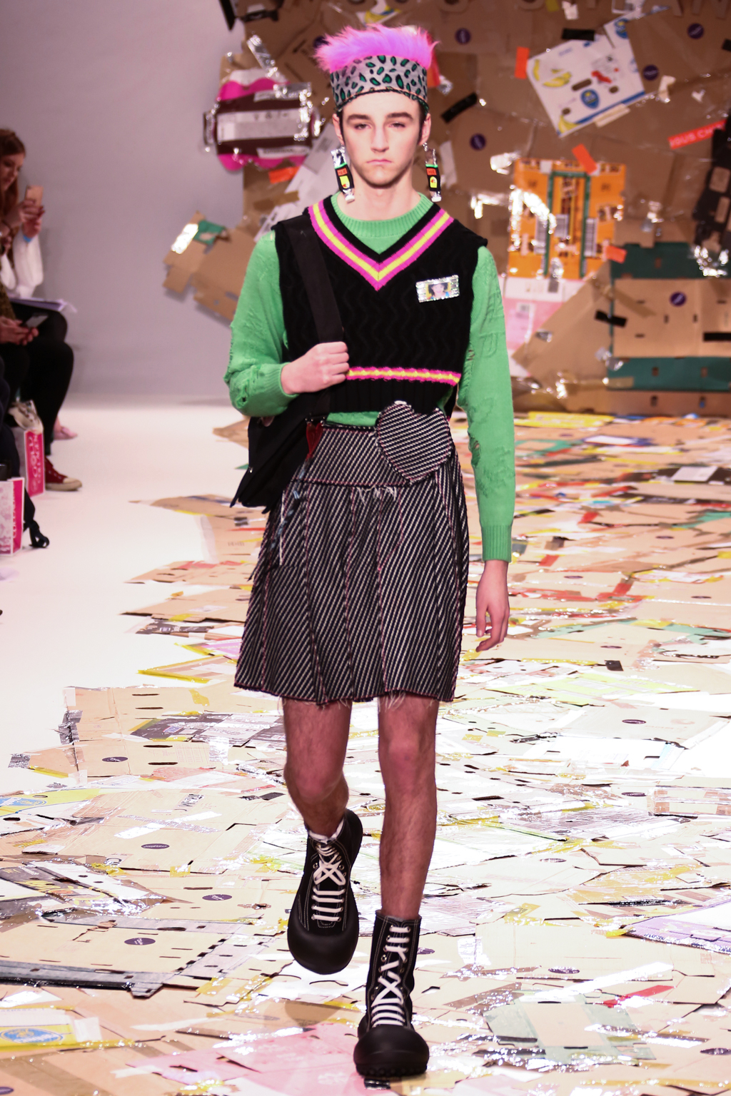 Angus Chiang’s collection Credit Sheet took the audience back to the schoolyard. Continuing his playful take on menswear, Chiang’s models walked out onto a cardboard catwalk in his signature oversized rubber shoes in colourful outfits inspired by 90s electronic music and hip-hop culture. The runway, held together by neon tape, juxtaposed beautifully with the grand setting at the Freemason’s Hall.