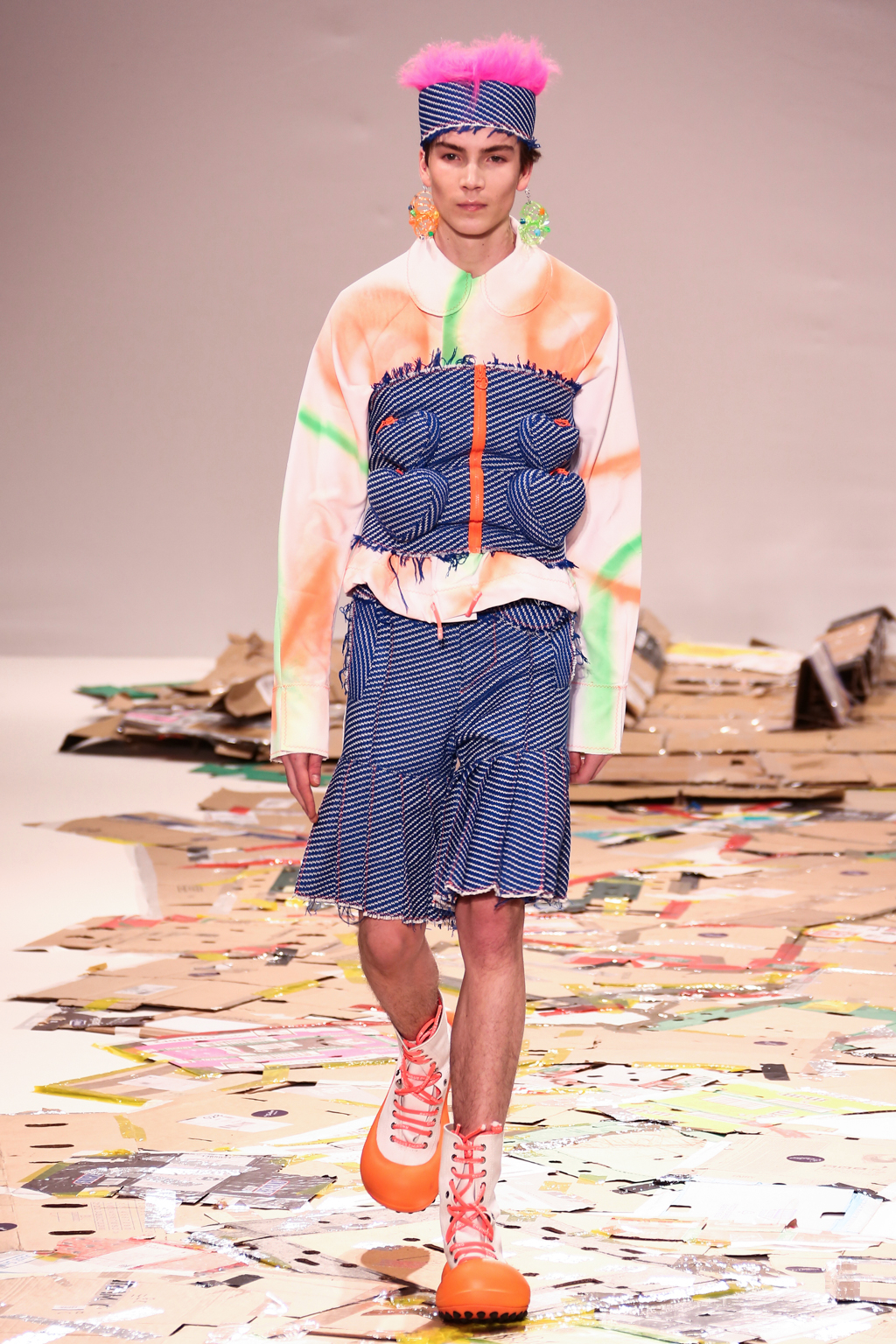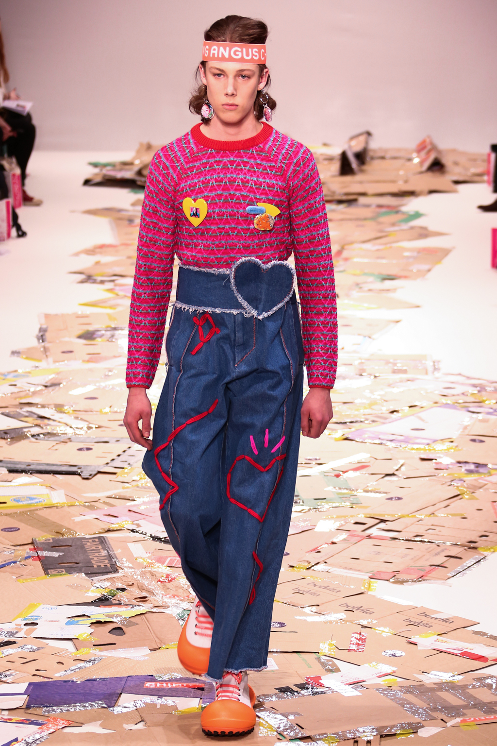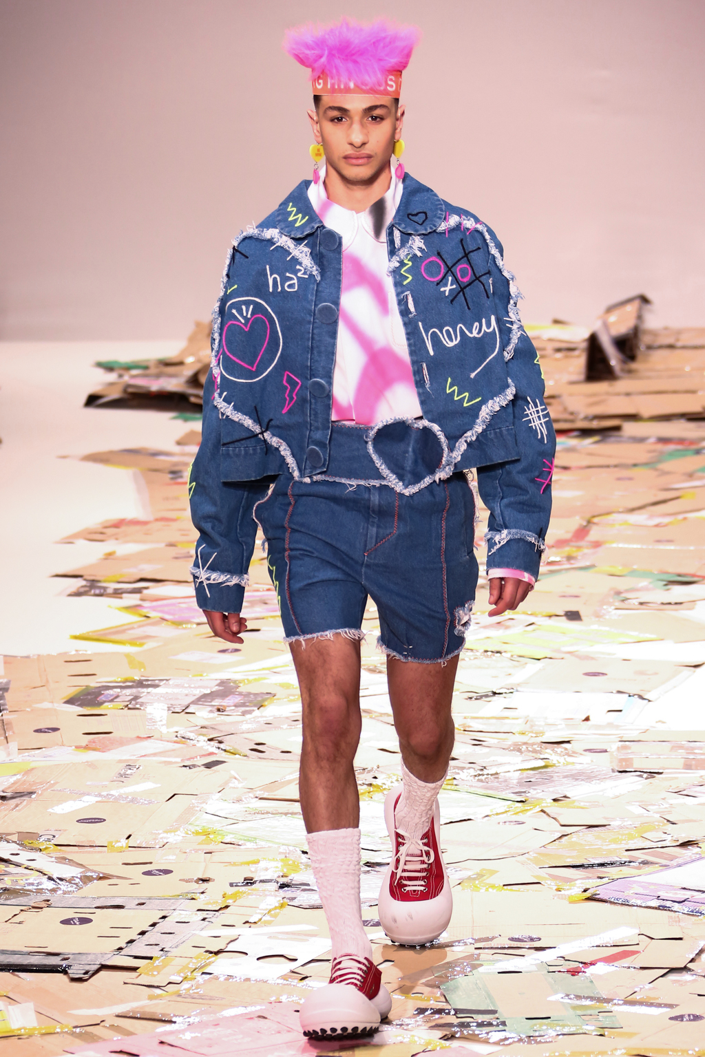 Breaking up the rough denim were bright pinks, greens and blues, along with orange headbands that featured the designer’s name in white lettering. He used classic stripes and gingham for his suits, but also a small heart print that tied into the many heart prints and shapes that could be seen throughout the entire collection. Adding another playful edge and nod to days spent in classrooms were the bold earrings and accessories, fashioned out of acrylic and other things usually used as school supplies.