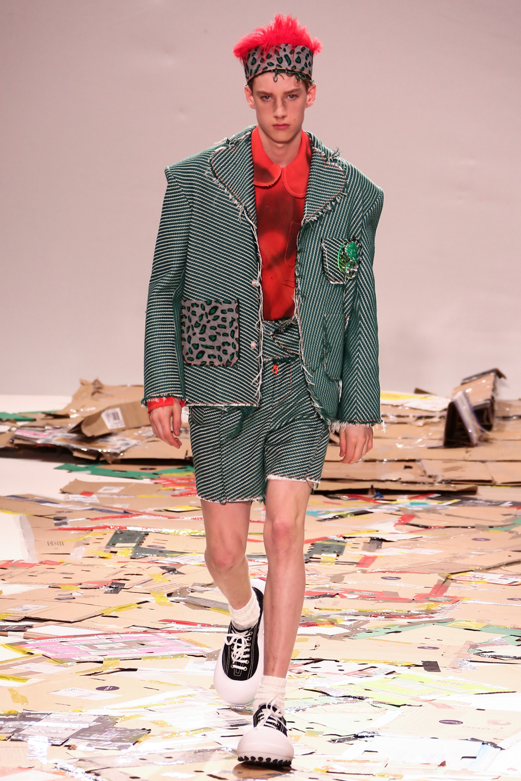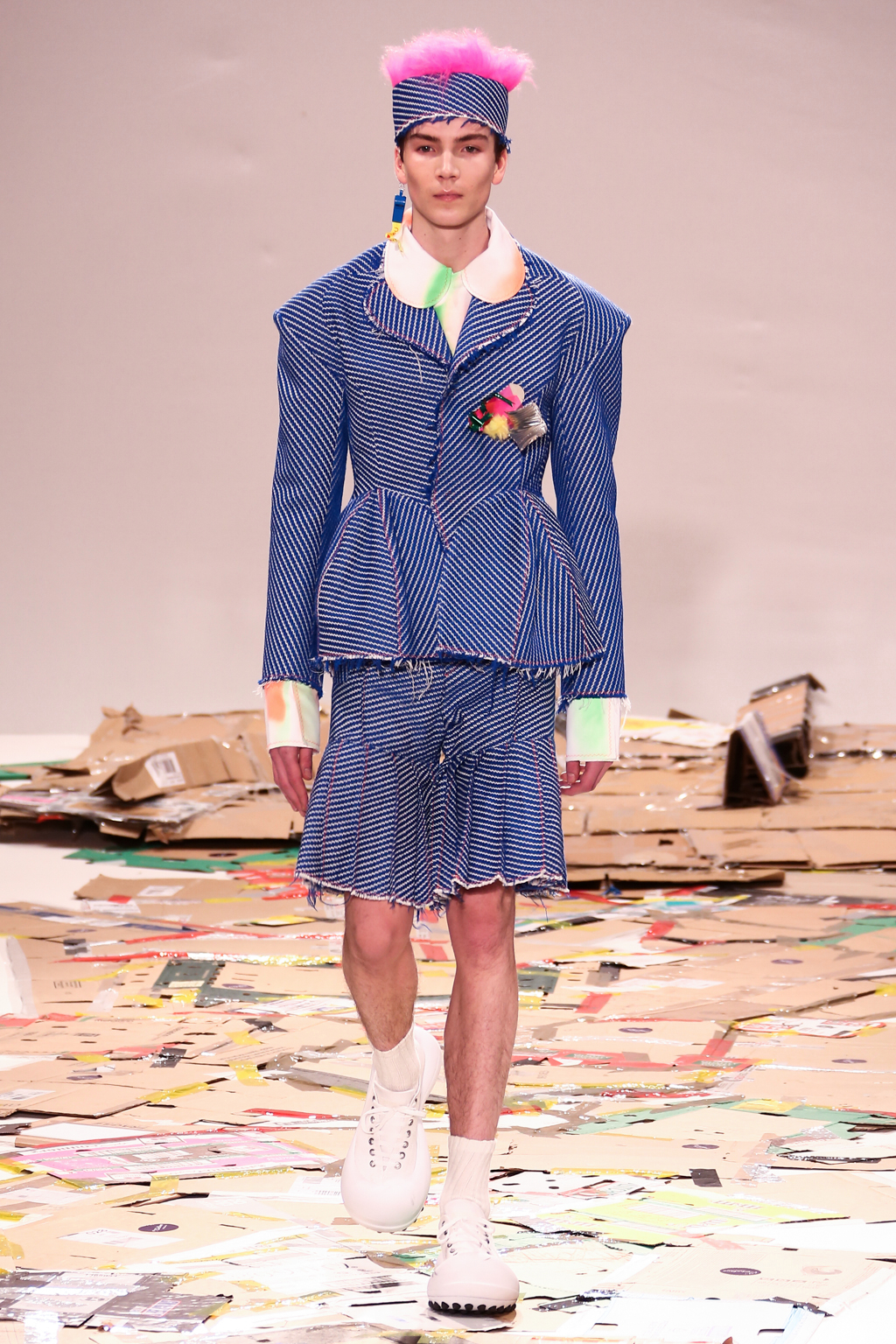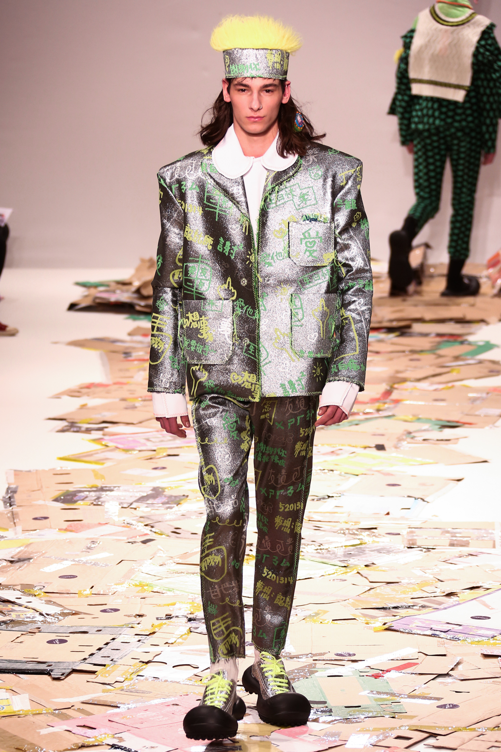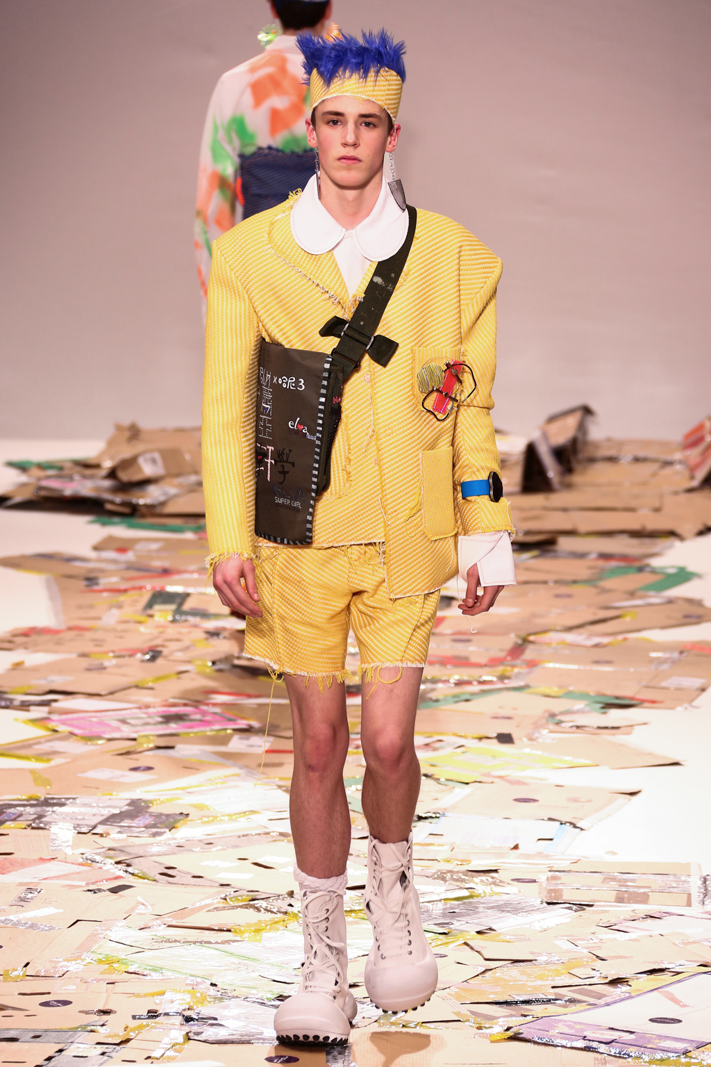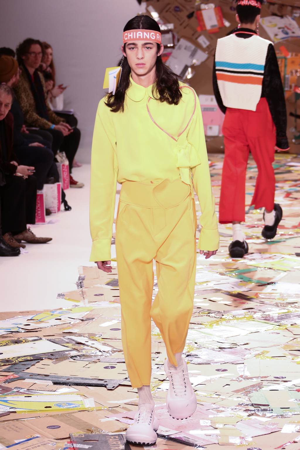 Chiang adopted the same bright colour palette that made his previous collections stand out, but added his very own take on suits to his repertoire. Being inspired by his Taiwanese heritage, Chiang utilized many techniques used by Taiwanese students to personalise their uniforms. He shortened the trousers and added playful knife pleats, and exaggerated the shoulders of the jackets, leaving the edges raw.