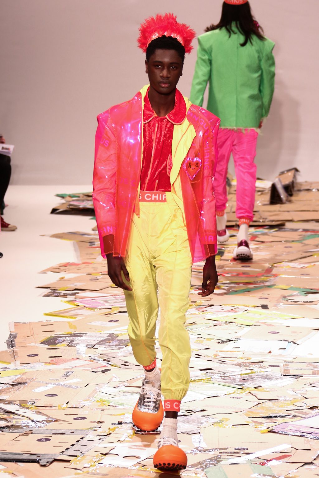 Angus Chiang’s collection Credit Sheet took the audience back to the schoolyard. Continuing his playful take on menswear, Chiang’s models walked out onto a cardboard catwalk in his signature oversized rubber shoes in colourful outfits inspired by 90s electronic music and hip-hop culture. The runway, held together by neon tape, juxtaposed beautifully with the grand setting at the Freemason’s Hall.