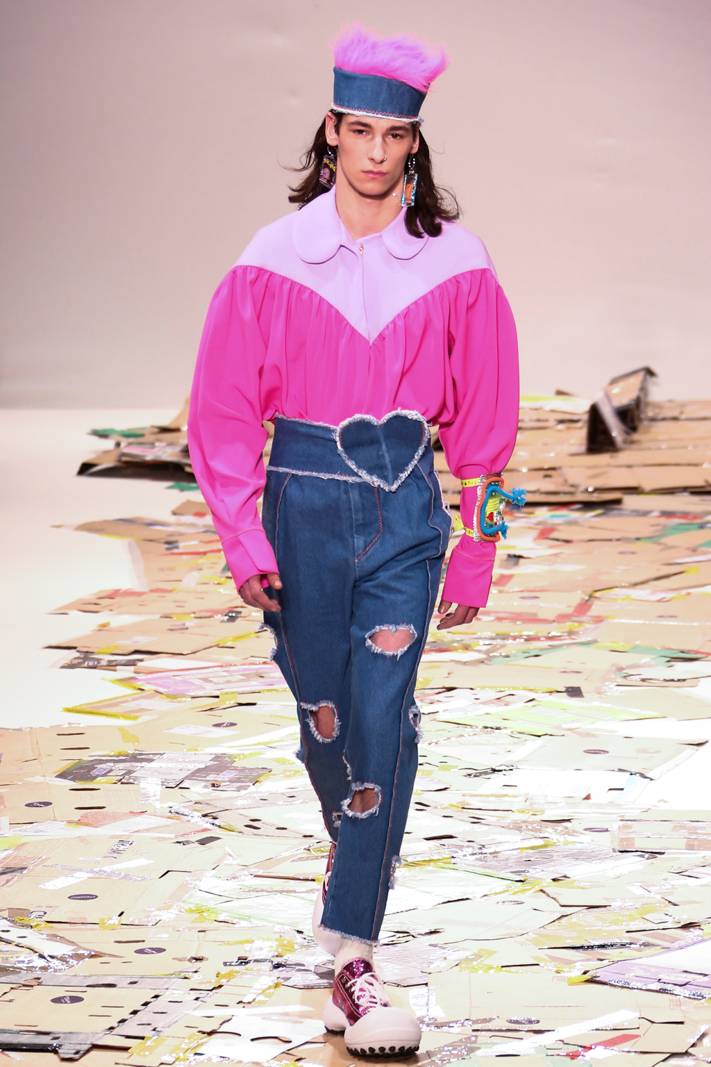 Breaking up the rough denim were bright pinks, greens and blues, along with orange headbands that featured the designer’s name in white lettering. He used classic stripes and gingham for his suits, but also a small heart print that tied into the many heart prints and shapes that could be seen throughout the entire collection. Adding another playful edge and nod to days spent in classrooms were the bold earrings and accessories, fashioned out of acrylic and other things usually used as school supplies.