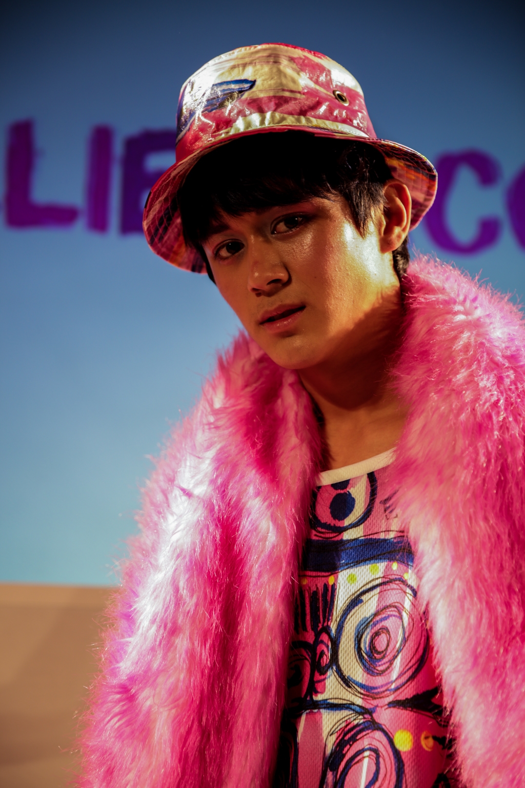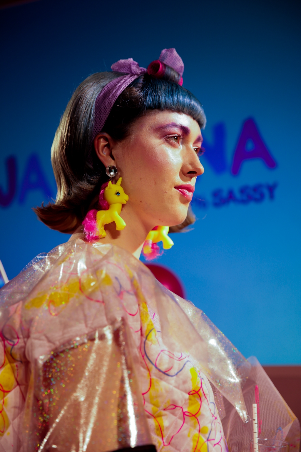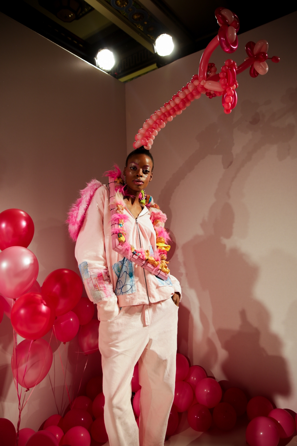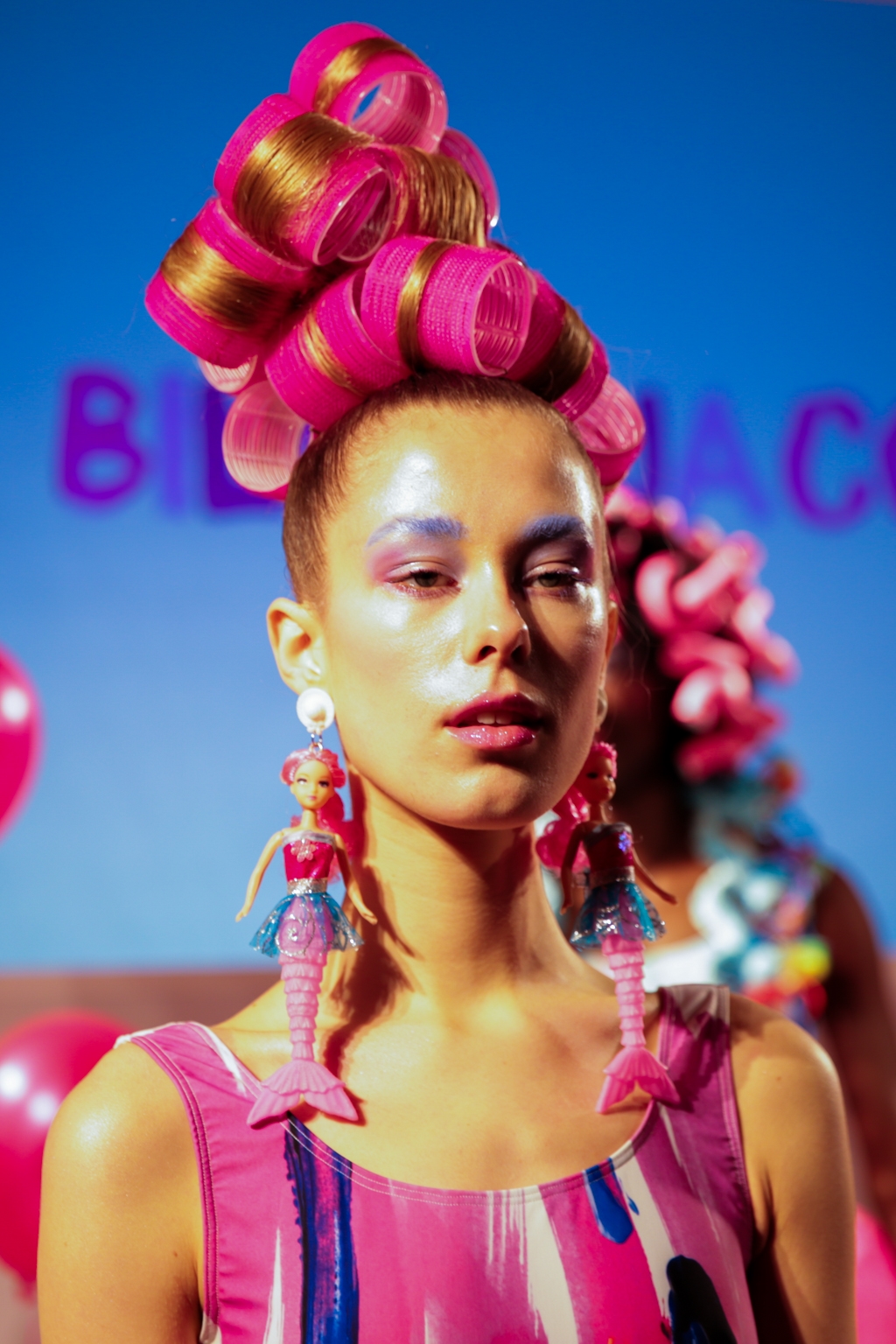 Billie Jacobina’s collection was a pink multicultural gathering where innovation and originality were at the heart of the presentation. Big pink curlers, balloons and multicoloured outfits had primarily drawn the viewer’s attention, only to spot the indigenous details such as mermaid-doll-earings, skateboards or pink hearted cushions as a substitute for handbags, afterwards.