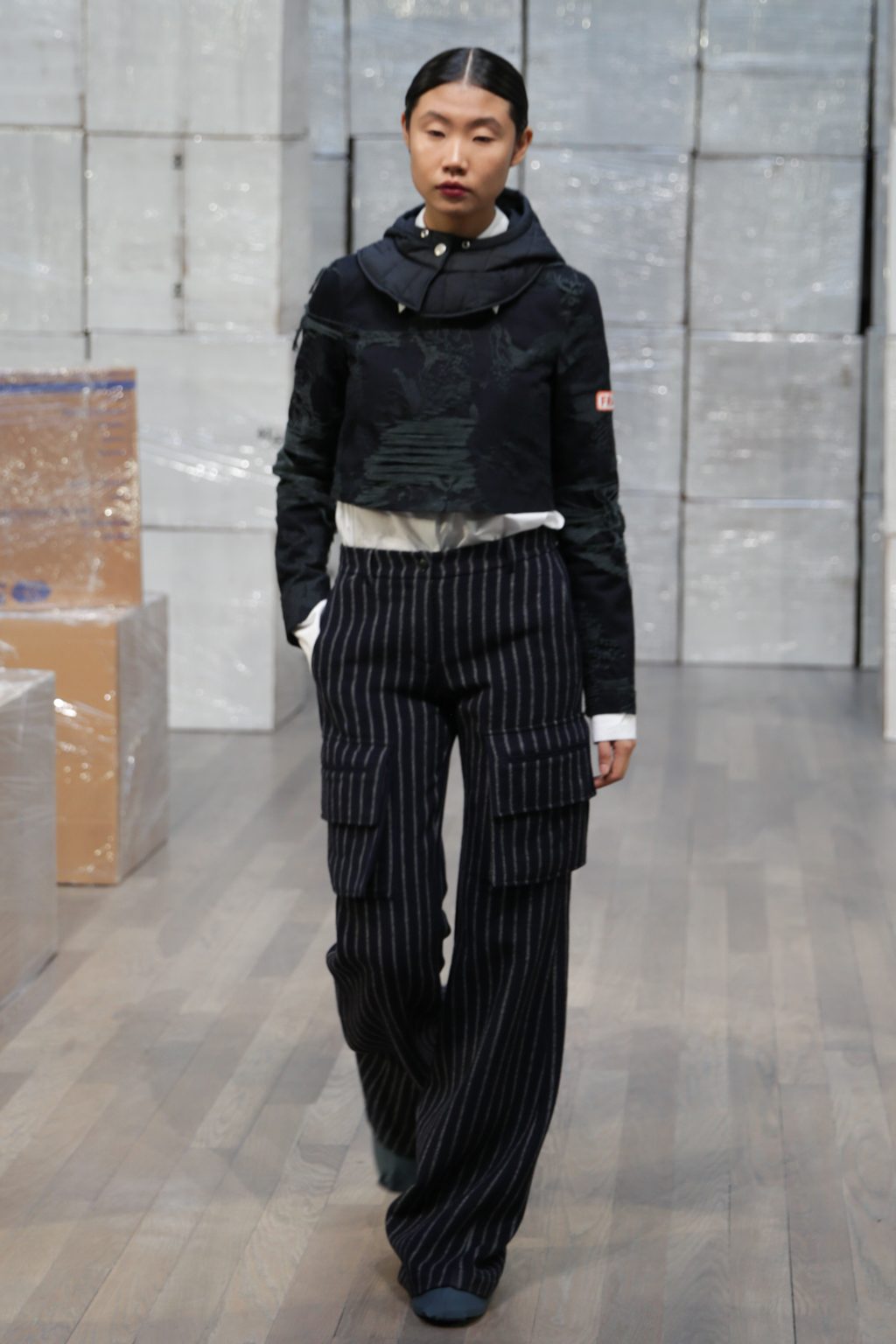 The jacquard fabric featured as a heavy coat, but also a whimsical shrug hanging off of one shoulder to counterbalance the sharp collars of Wang’s tailored shirts. His trademark elongated, exaggerated cuffs peeked out of coats and jacket in clean white and dark grey pinstripe. Breaking up his clean tailoring were peplum corsets fashion from padded nylon, worn over outerwear pieces and pinched in at the waist.