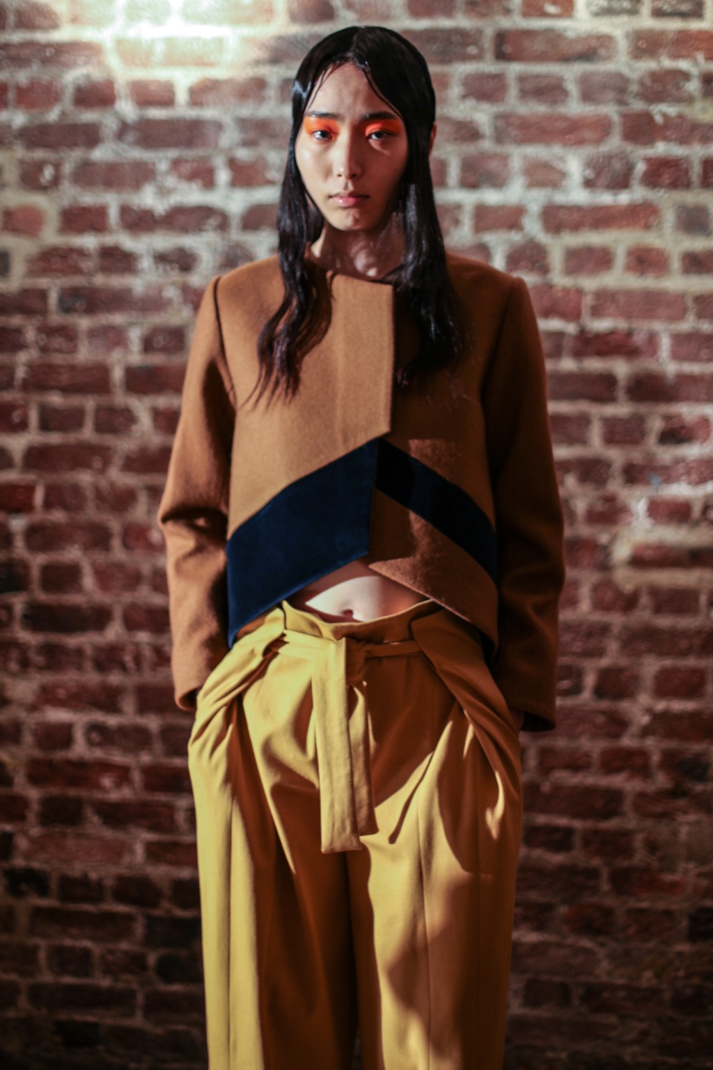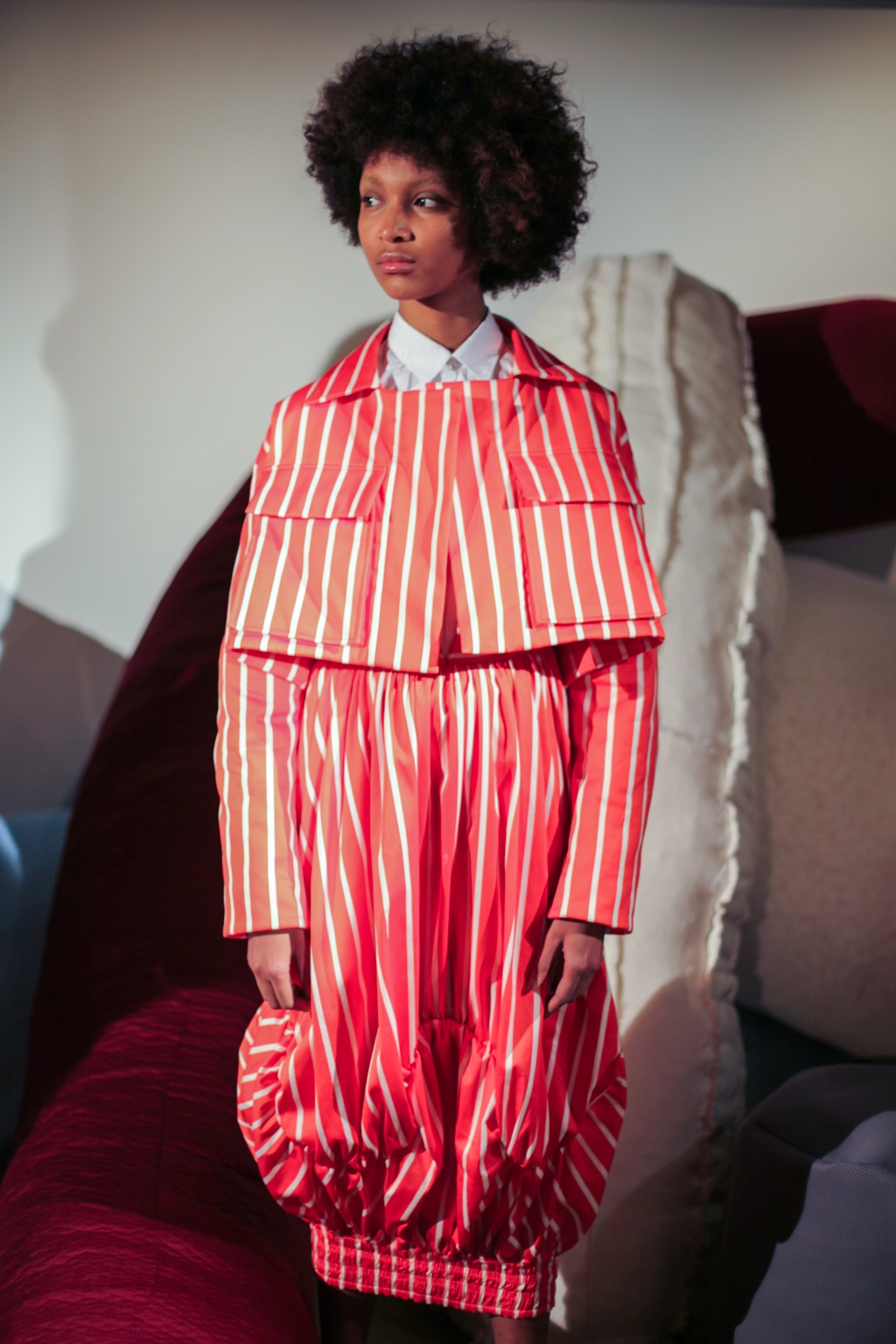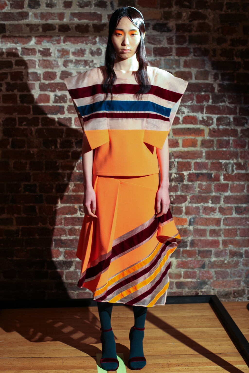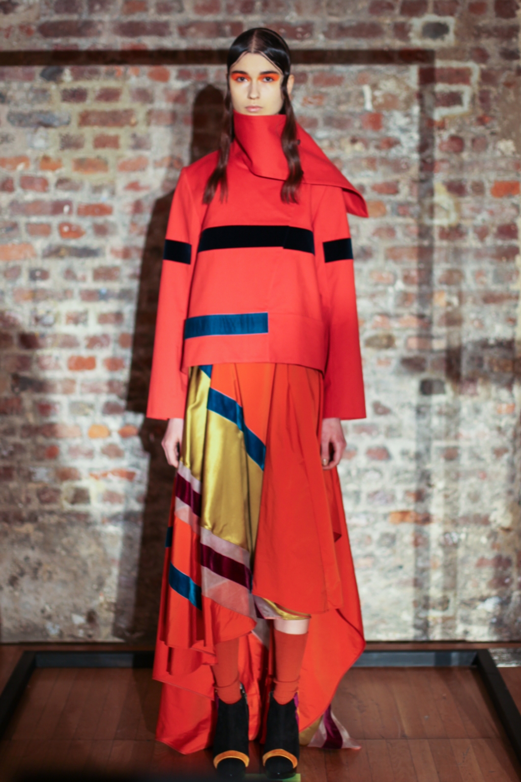Inspired by neo-futurist architecture, there was a marriage between asymmetric pleats and hemlines and autumnal earth tones of golden ochre and vermillion. Thick stripes of burgundy and forest green stretched across sophisticated structures and streamlined forms, bringing emphasis to the crafted shape of each piece.