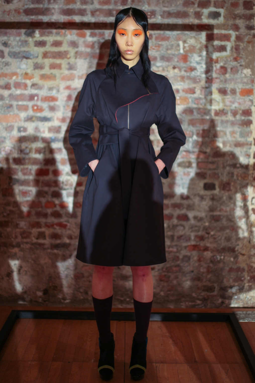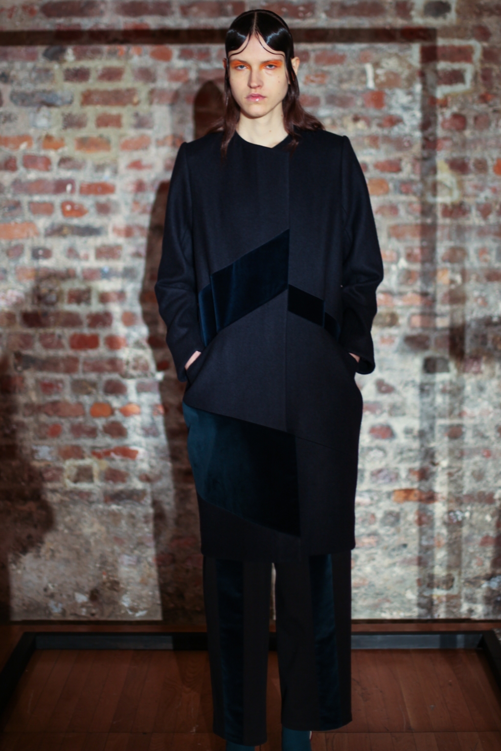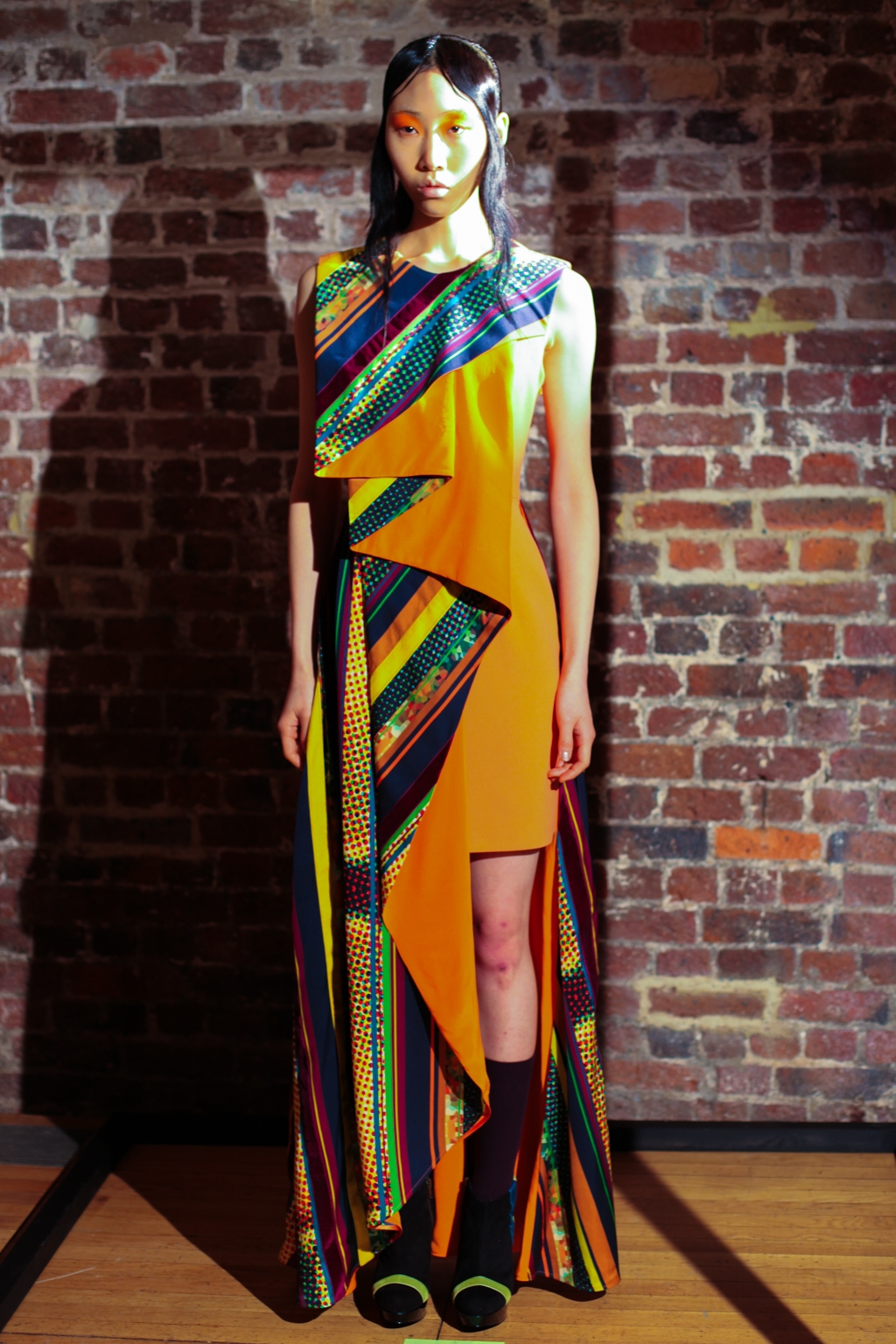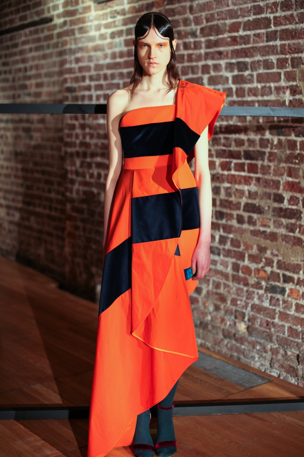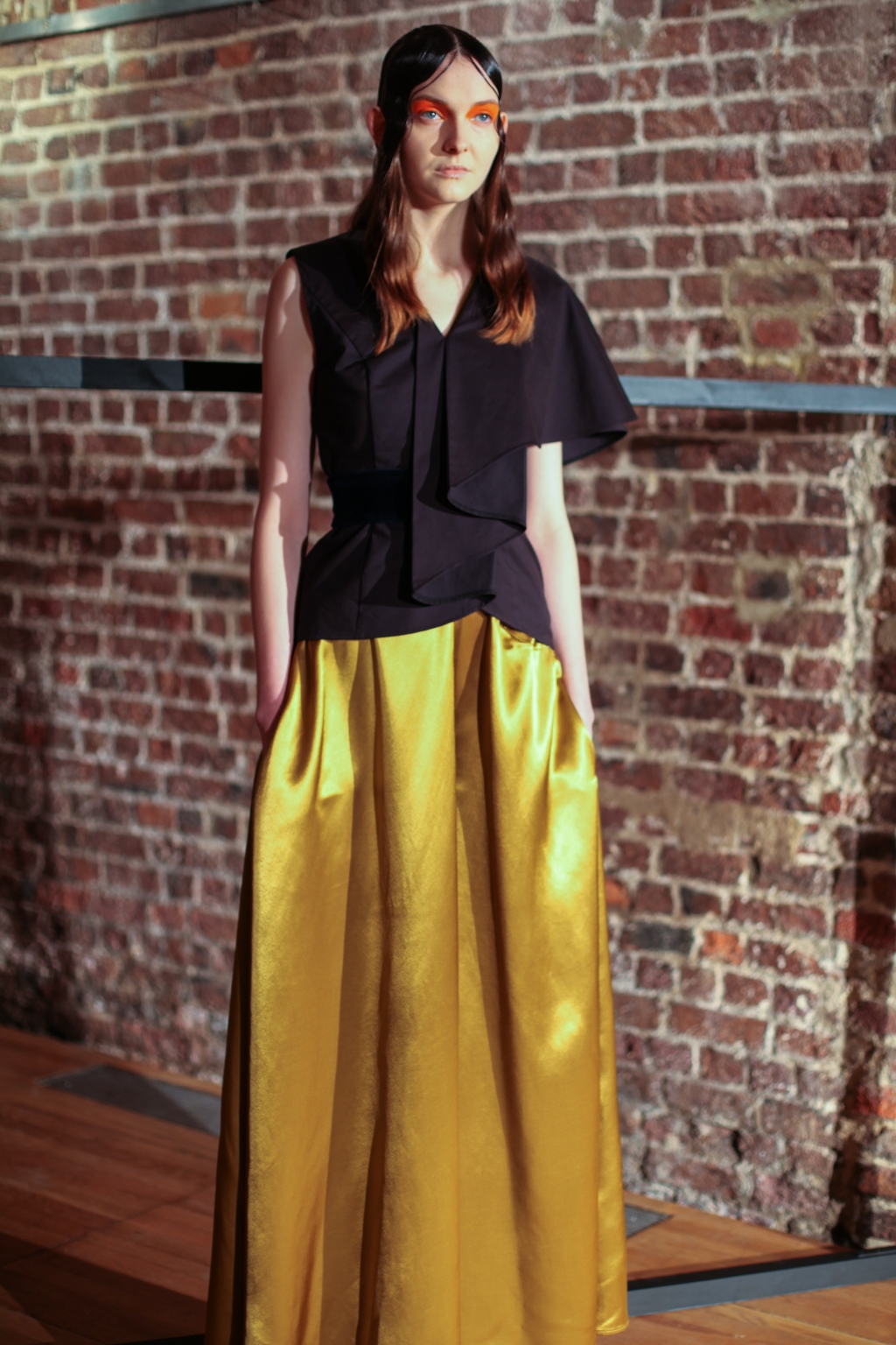 Inspired by neo-futurist architecture, there was a marriage between asymmetric pleats and hemlines and autumnal earth tones of golden ochre and vermillion. Thick stripes of burgundy and forest green stretched across sophisticated structures and streamlined forms, bringing emphasis to the crafted shape of each piece.