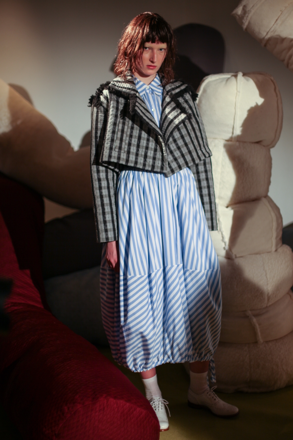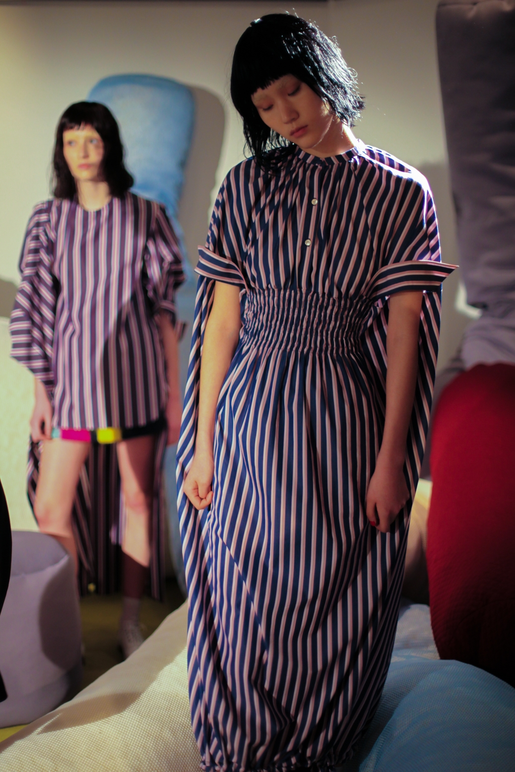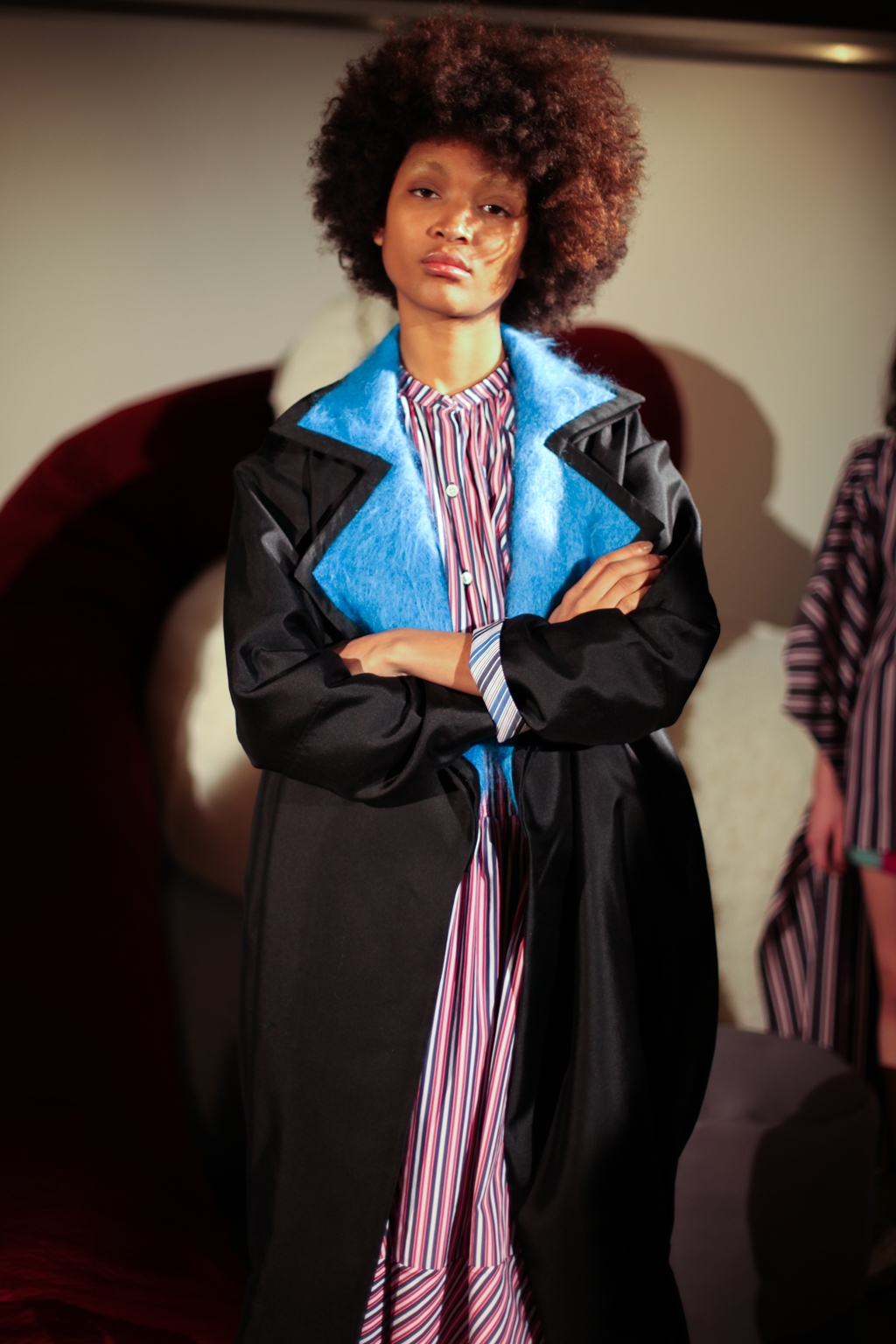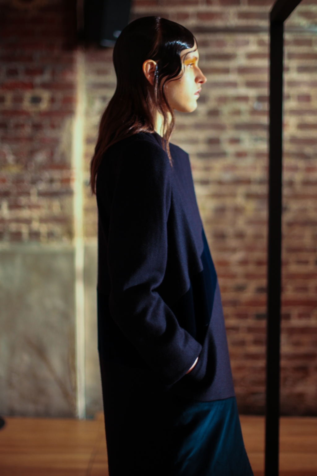 Inspired by neo-futurist architecture, there was a marriage between asymmetric pleats and hemlines and autumnal earth tones of golden ochre and vermillion. Thick stripes of burgundy and forest green stretched across sophisticated structures and streamlined forms, bringing emphasis to the crafted shape of each piece.