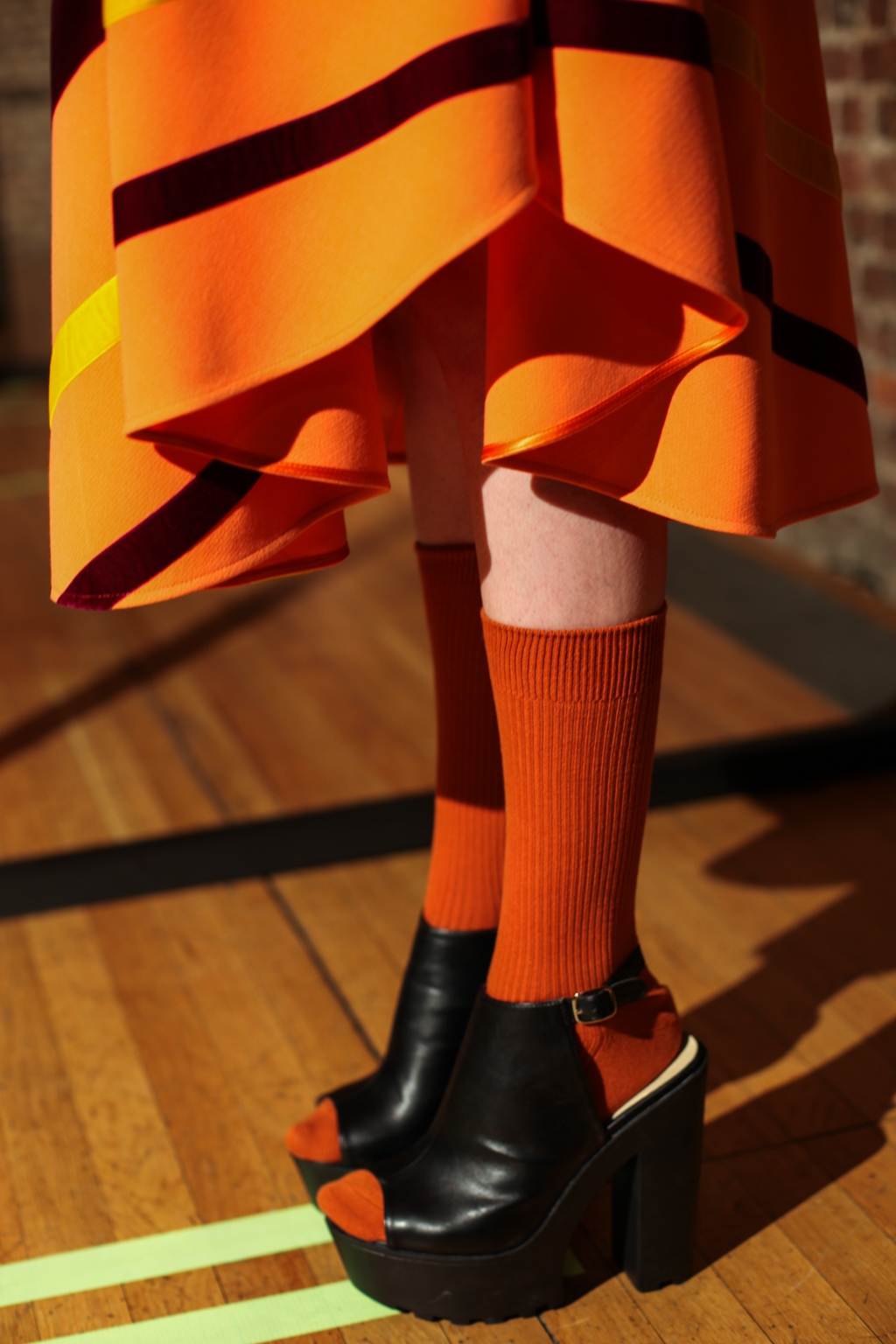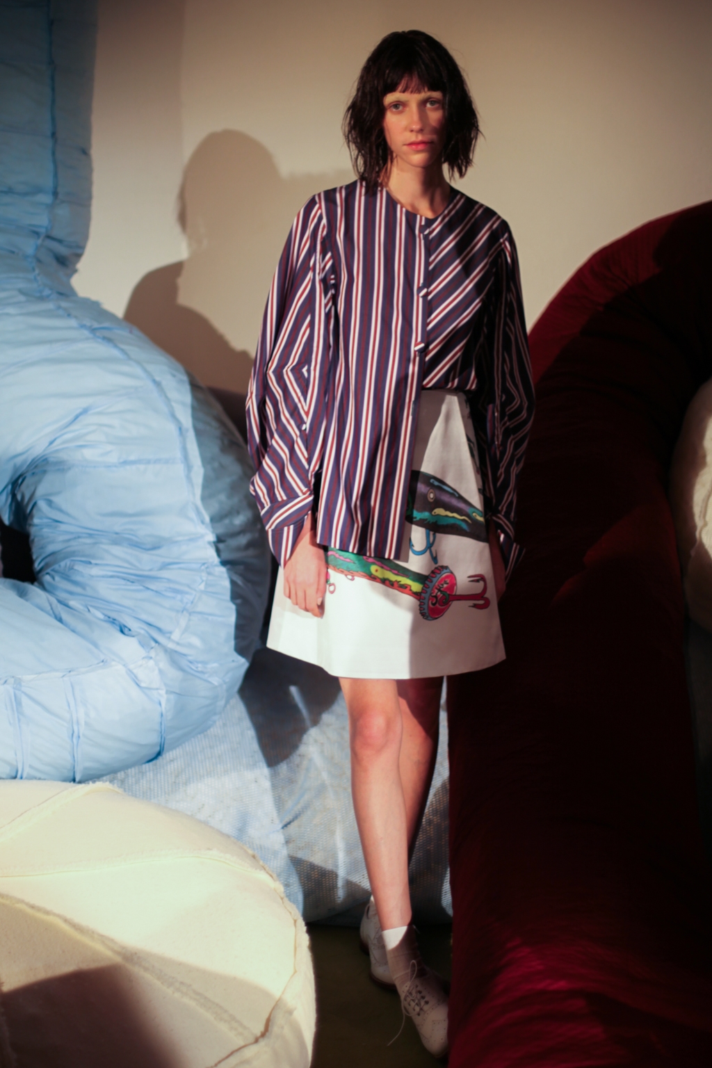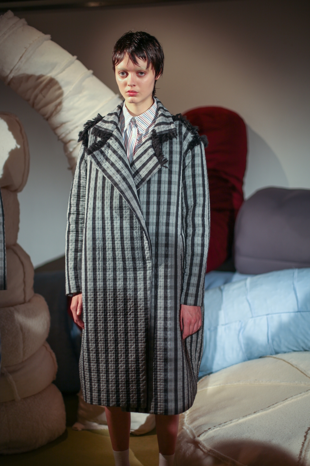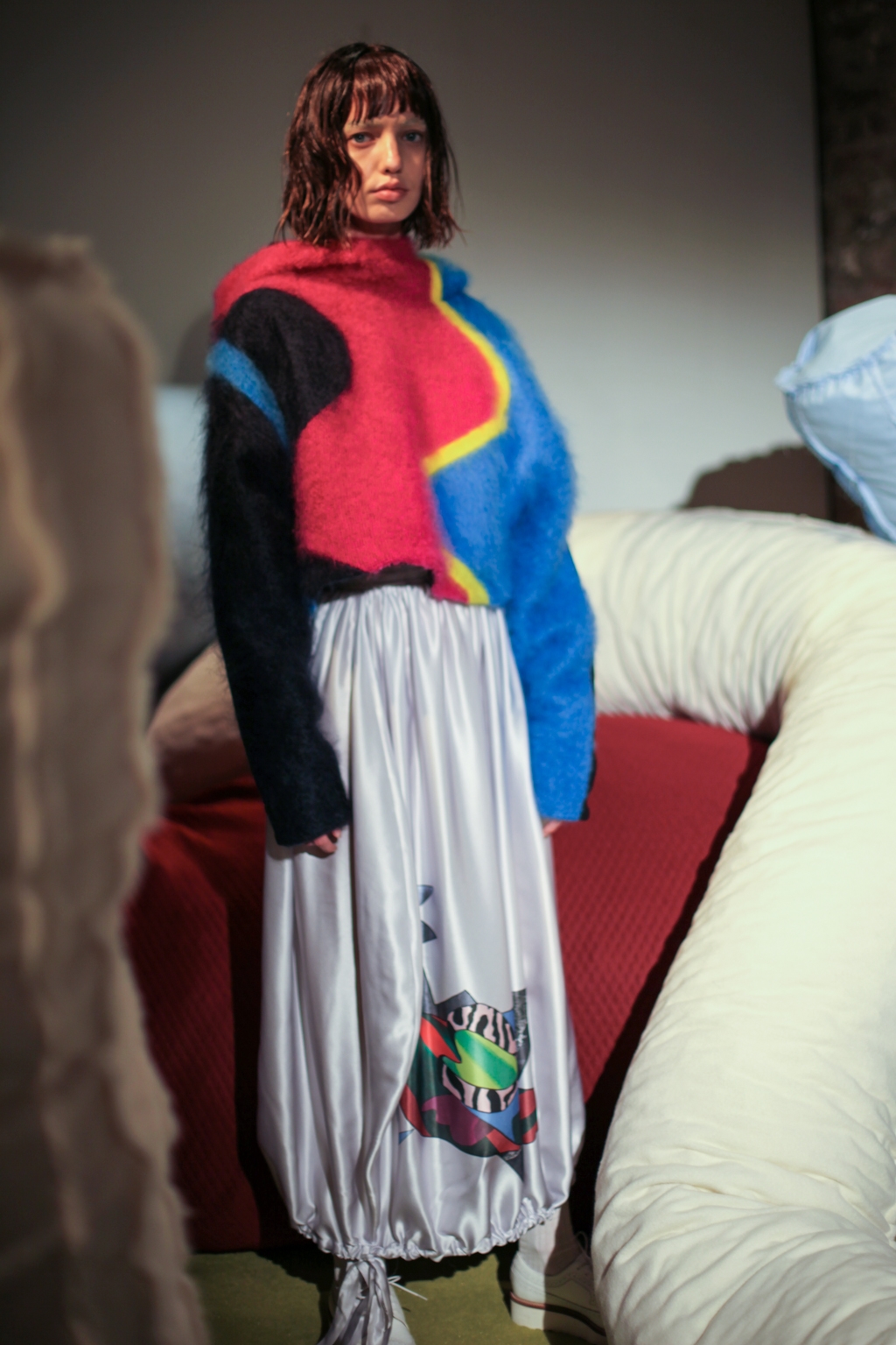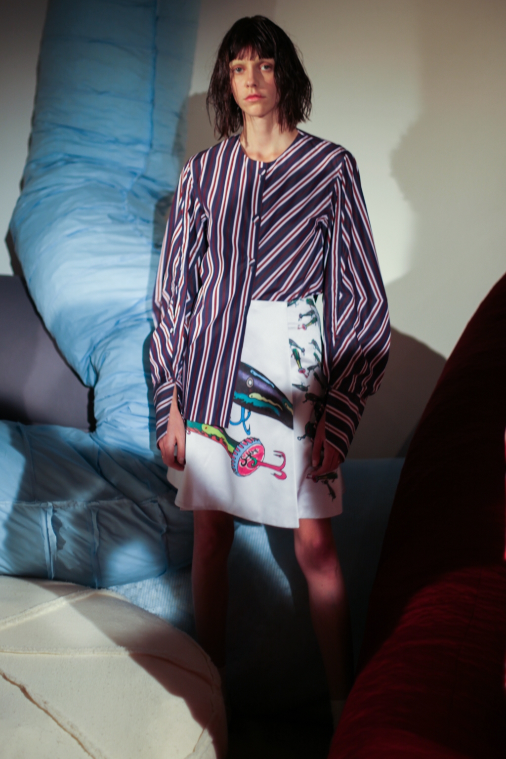 Inspired by neo-futurist architecture, there was a marriage between asymmetric pleats and hemlines and autumnal earth tones of golden ochre and vermillion. Thick stripes of burgundy and forest green stretched across sophisticated structures and streamlined forms, bringing emphasis to the crafted shape of each piece.