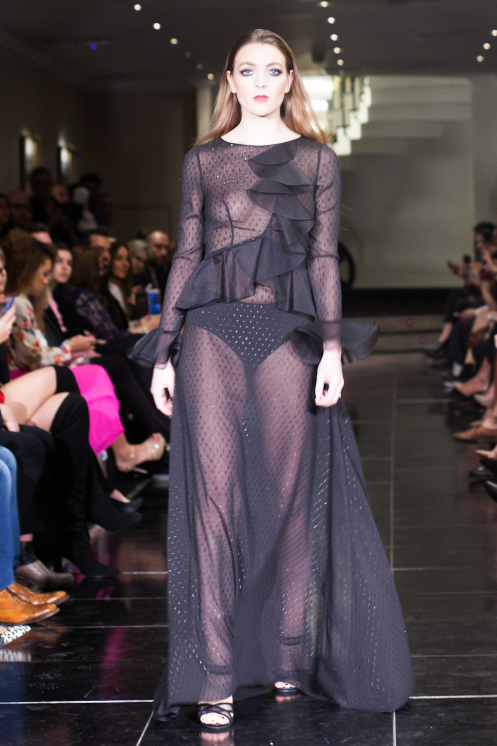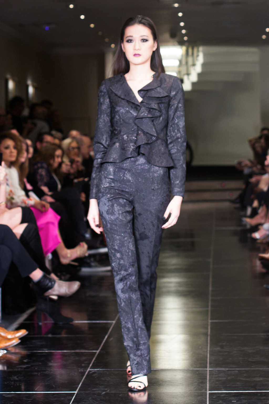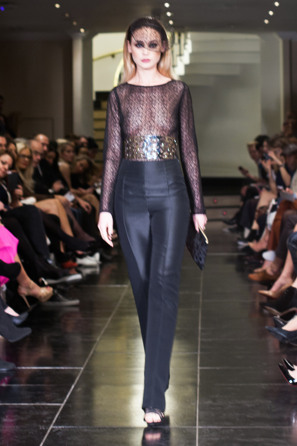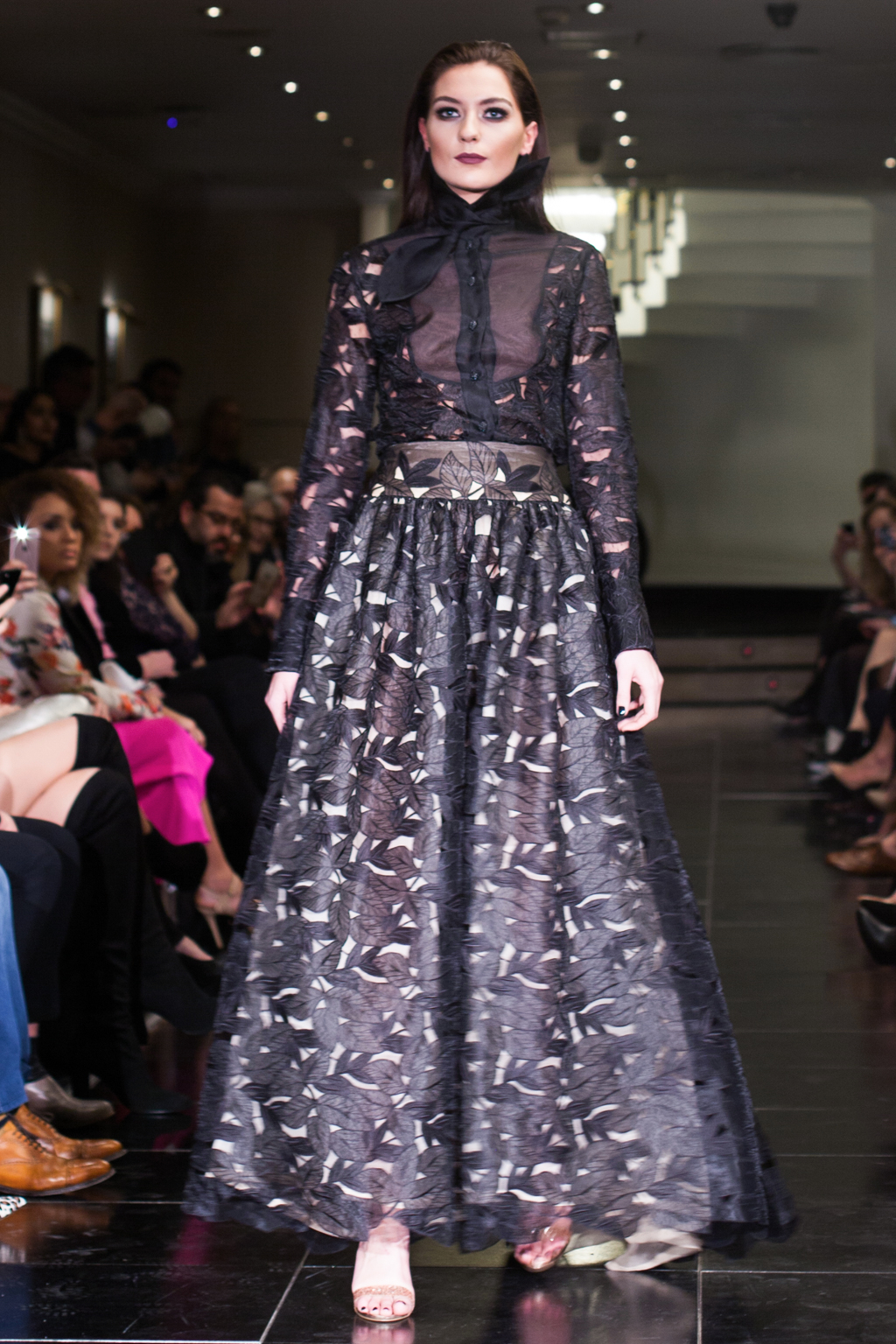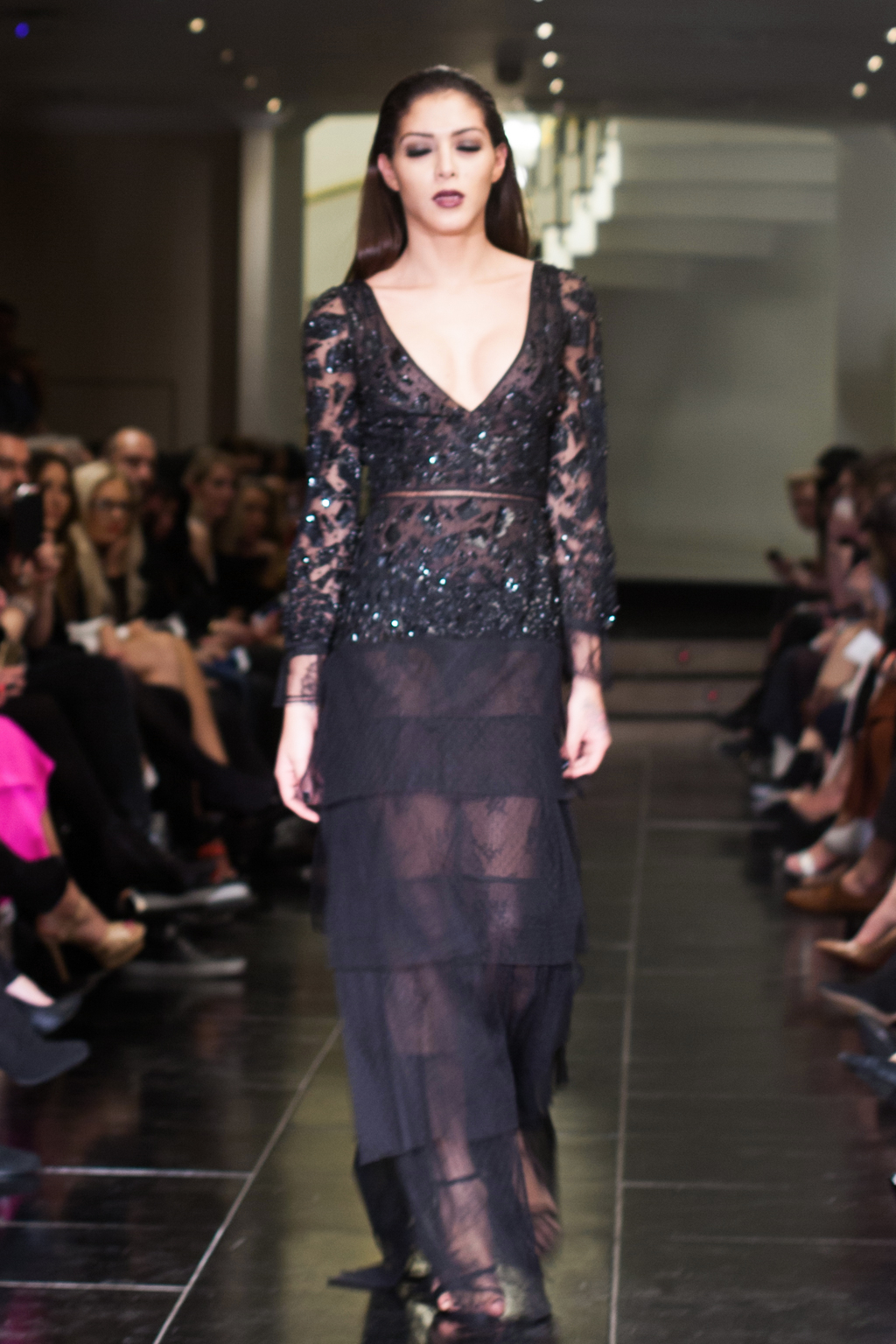 Made up of beautifully detailed garments, from blazer to ball gowns to palazzo trousers, the focus of this show was on the texture of the clothing. With an array of lace dresses, translucent panel tops, black jewel detailing, fringing and silver belts, the show proceeded smoothly and every outfit made sense. The clientele of the collection was clear to the viewer from the first glance.