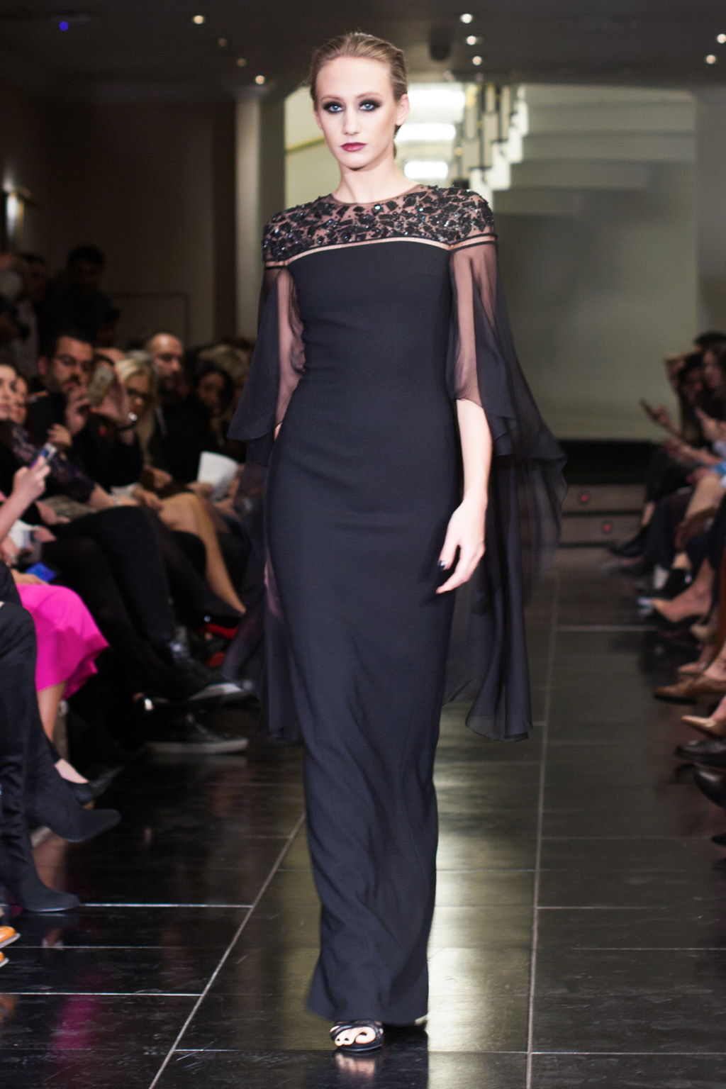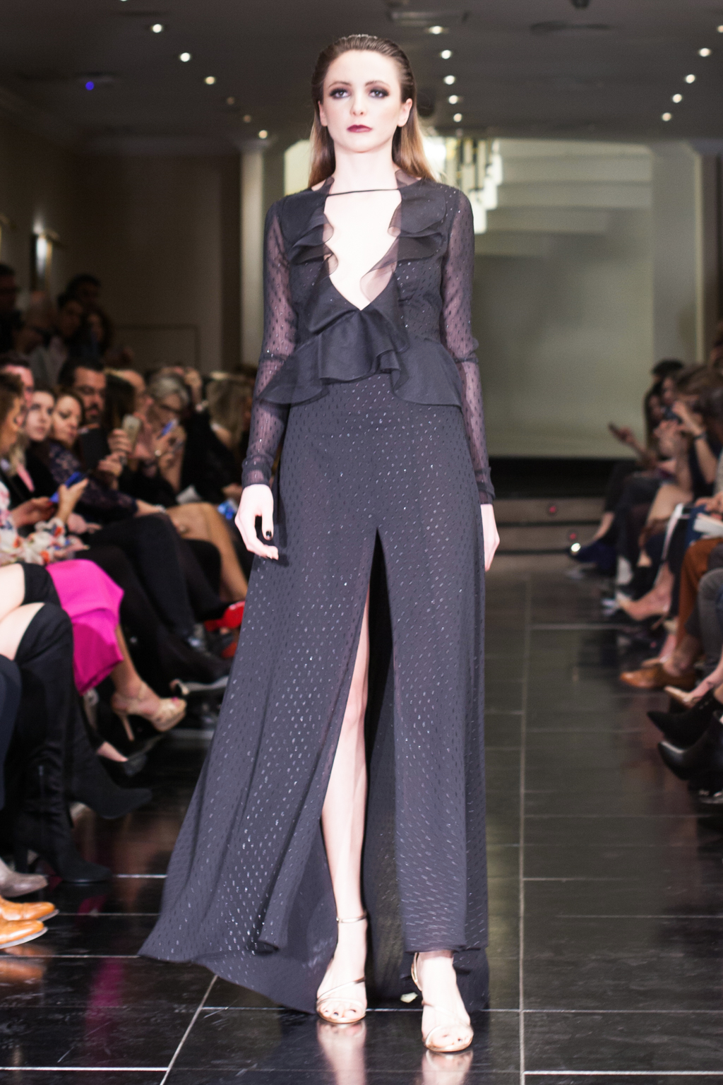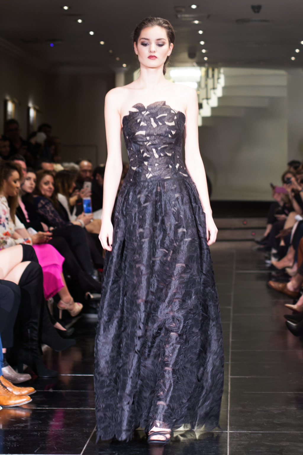 Mostly comprised of form-fitting gowns, the Kolchagov Barba show was a wardrobe made for a confident, striking woman. With only hints of silver detail here and there, it was an all-black collection, referencing the highly sought-after black coral. The garments had regal details such as jewel embellishment, silver emblazement and Victorian style collars.
