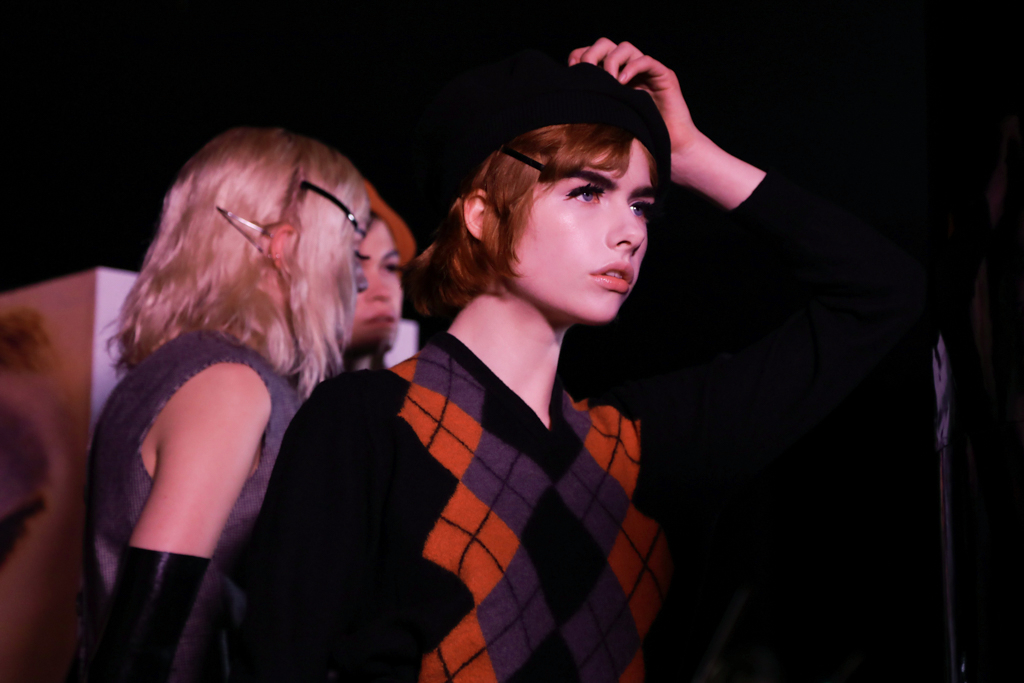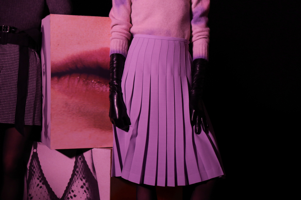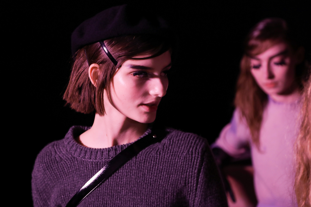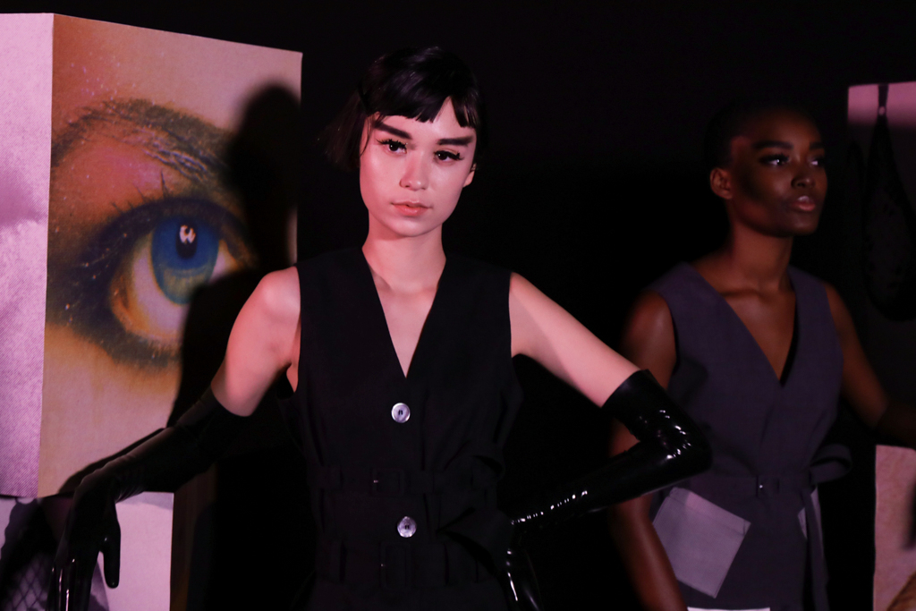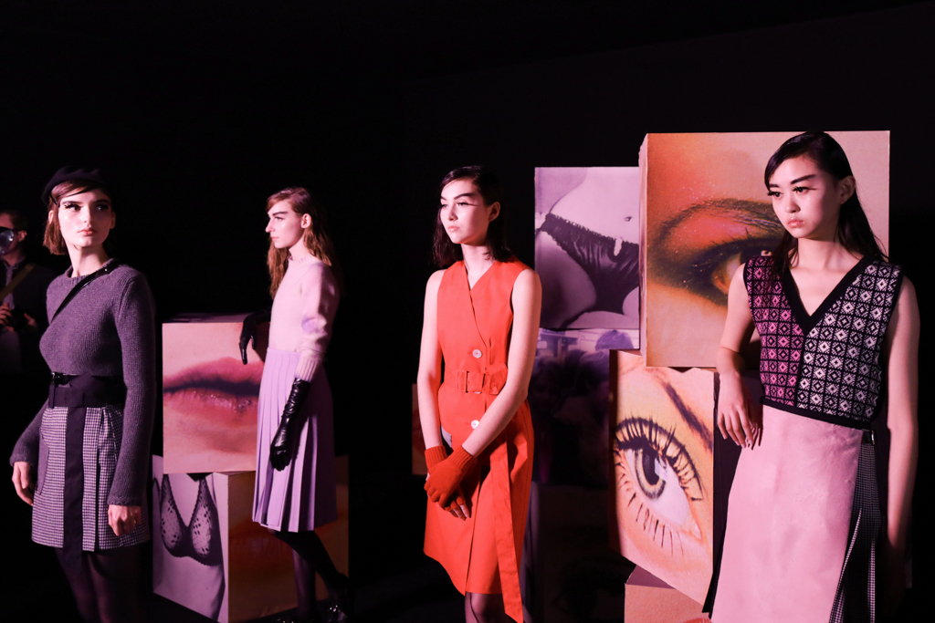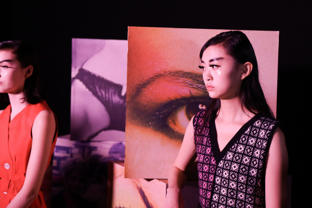 McCouch decided to offer two lengths of skirts, mini and knee-length, which fitted beautifully with the Mod-inspired styling of the presentation. The models stood like heroines with eyeliner and berets, surrounded by stacks of cubes that showed eyes, lips and other facial features. The rose lighting added to the feel of being in a Wes Anderson film set in London of the 1960s.