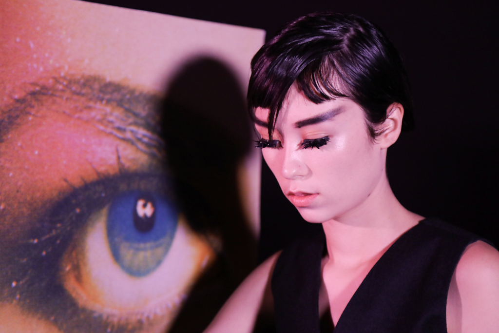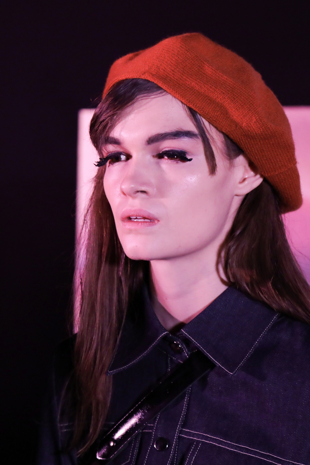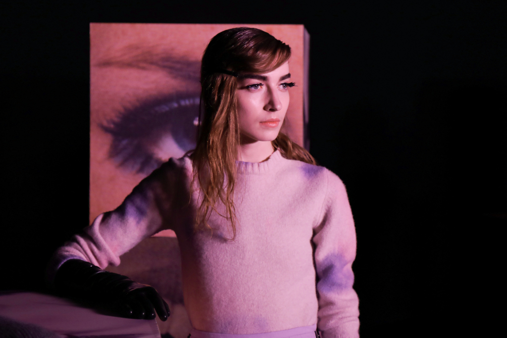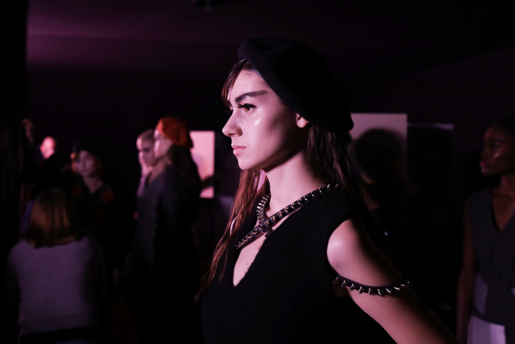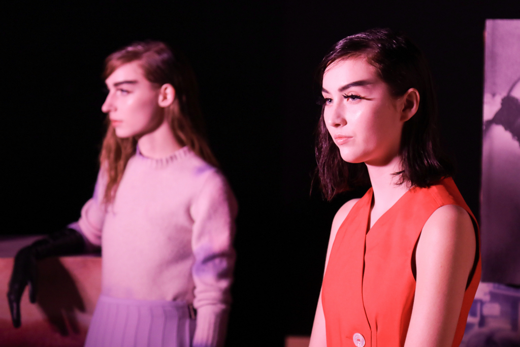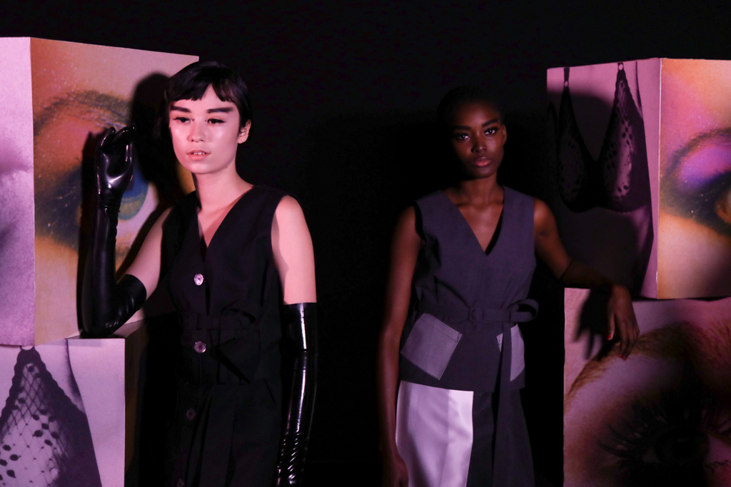 McCouch decided to offer two lengths of skirts, mini and knee-length, which fitted beautifully with the Mod-inspired styling of the presentation. The models stood like heroines with eyeliner and berets, surrounded by stacks of cubes that showed eyes, lips and other facial features. The rose lighting added to the feel of being in a Wes Anderson film set in London of the 1960s.