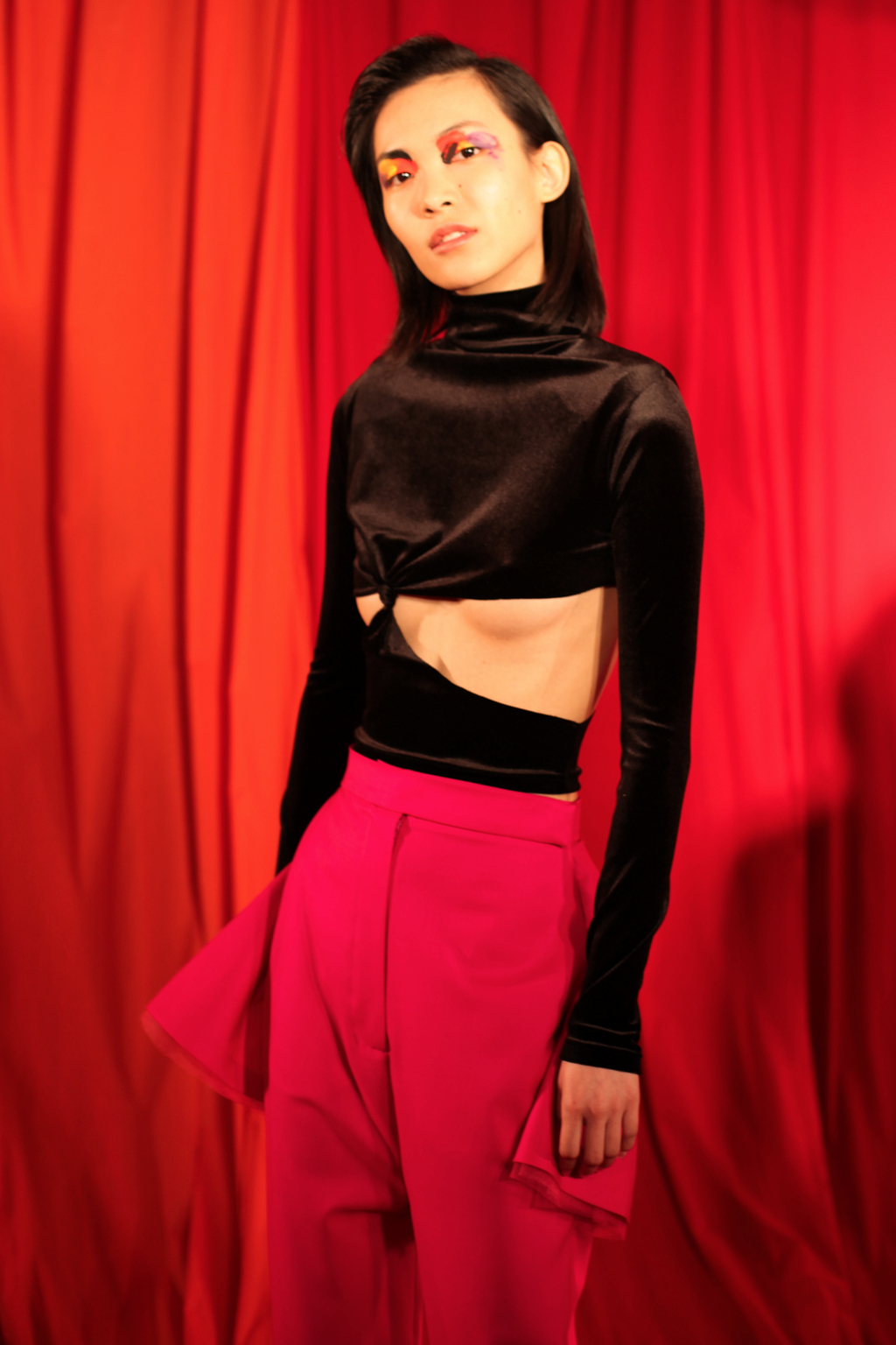 The Royal College of Art graduate introduced fluid tailored and mono-coloured suits in pink and black were that tied at the waist, with voluminous trousers and deep necklines. The same trousers were also paired with velvet turtlenecks that were cropped and tied just below the bust, baring just enough midriff to still be chic rather than overly sexy.