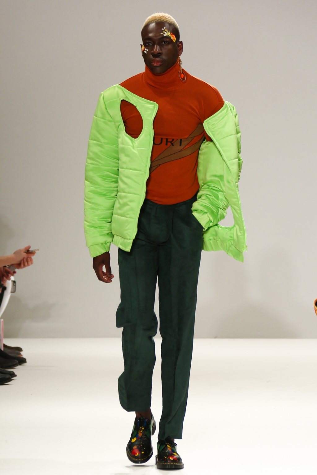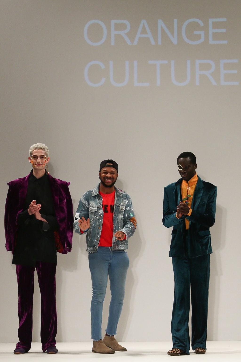 Emerging from the array of jungle tones of khaki, burnt orange and taupe, dapper velvet suits in emerald and royal purple added a touch of dandy to the Orange Culture show. Fluorescent puffer jackets and knitwear with slognas such as “stay true” brought a certain sense of melancholia to the collection.