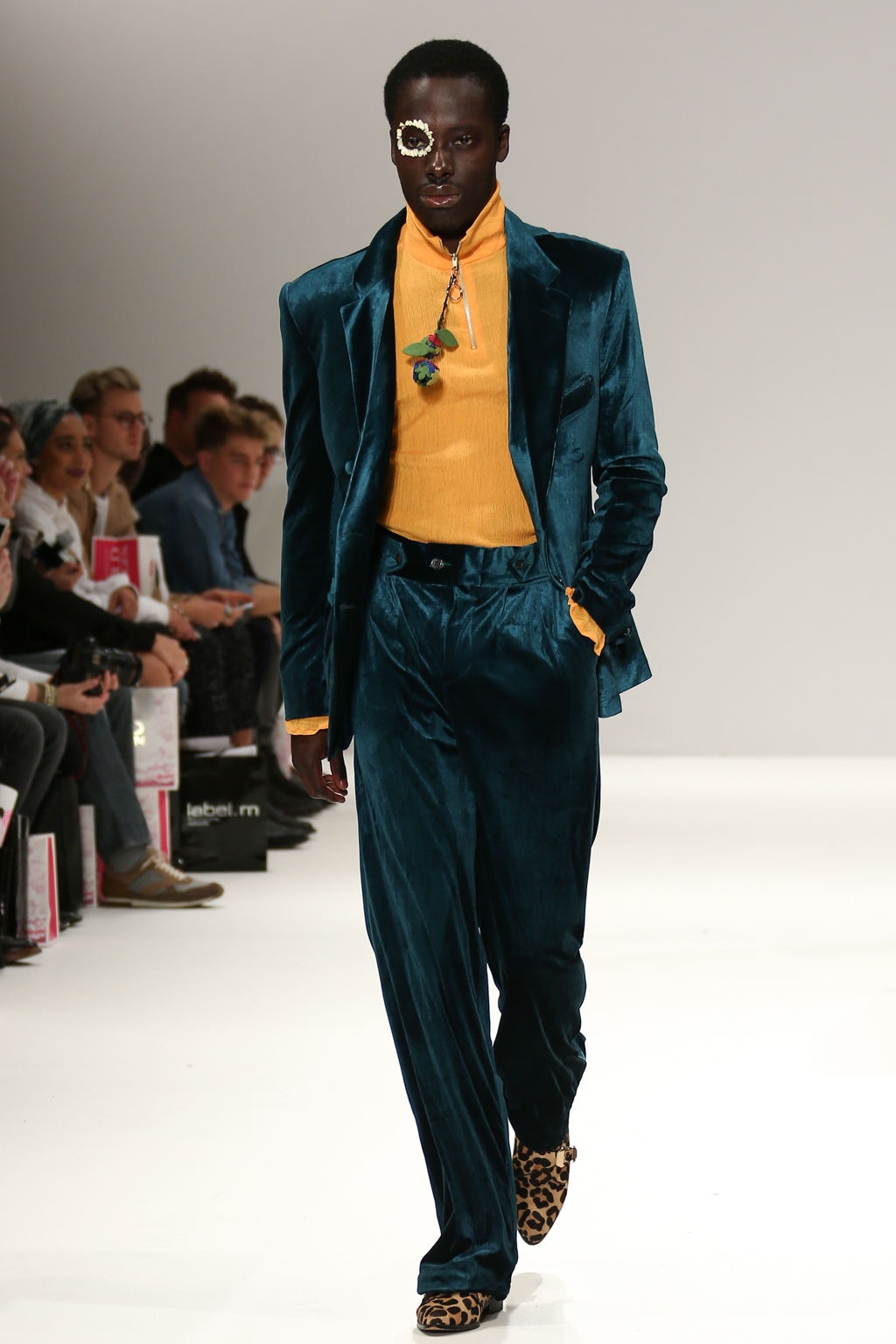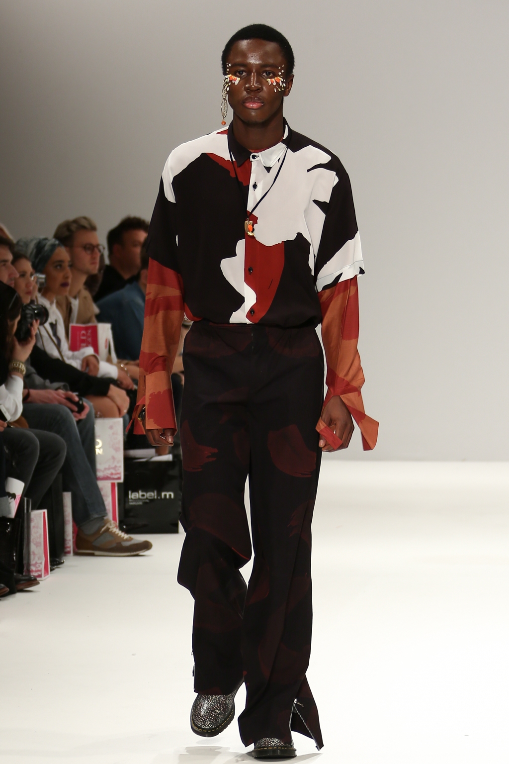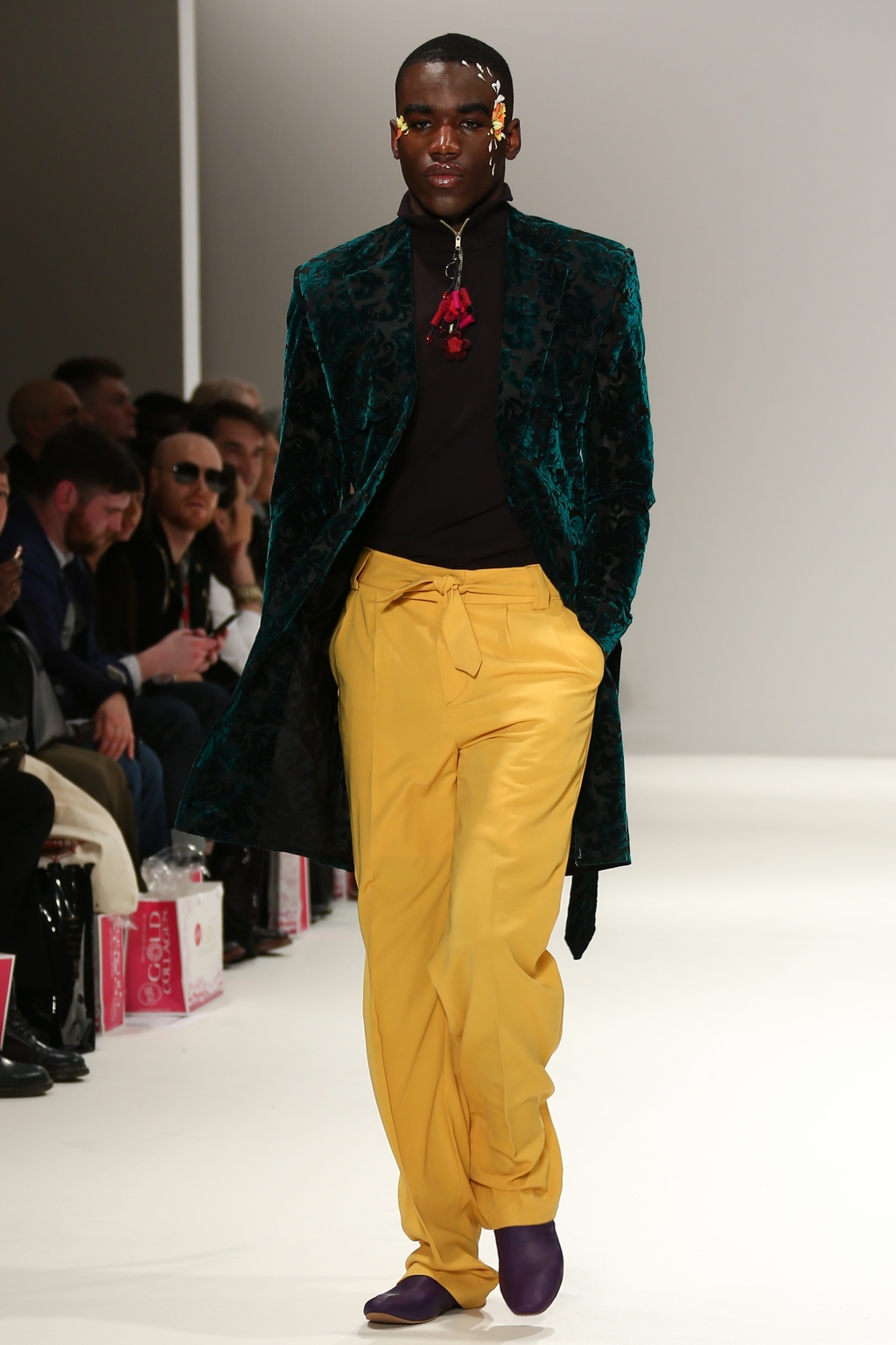 But the focus was on the fringing, nevertheless. It was elemental, featuring in at least half of Stoyneva’s designs. A long-sleeved pink and yellow printed blouse was layered underneath a plunging black waistcoat, paired closely with a dramatically sweeping black skirt. It was at first uncertain whether the look was a dress, but the momentary ponder was distracted by a tail of fringing, bouncing brilliantly not as an afterthought, but as a fundamental component.