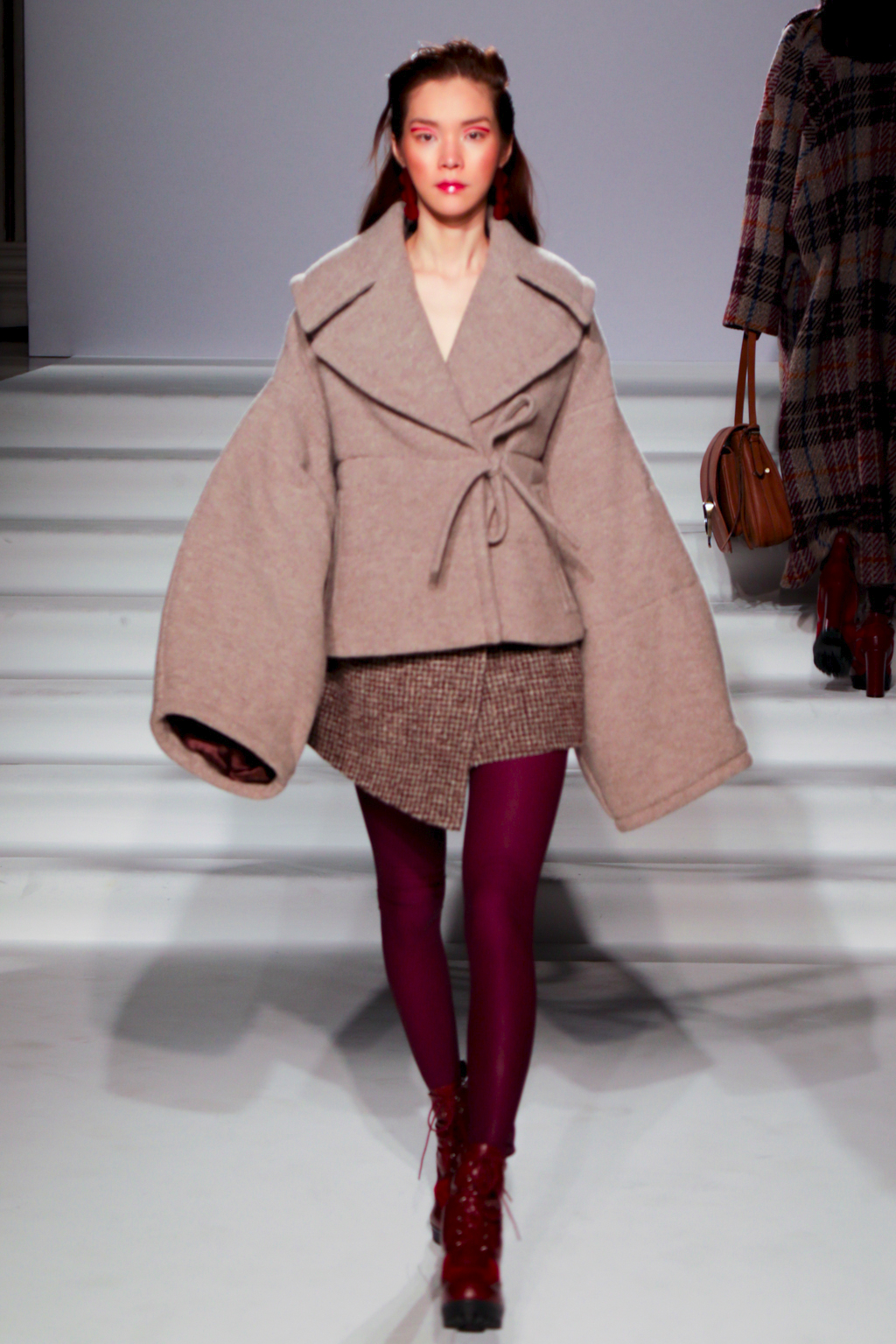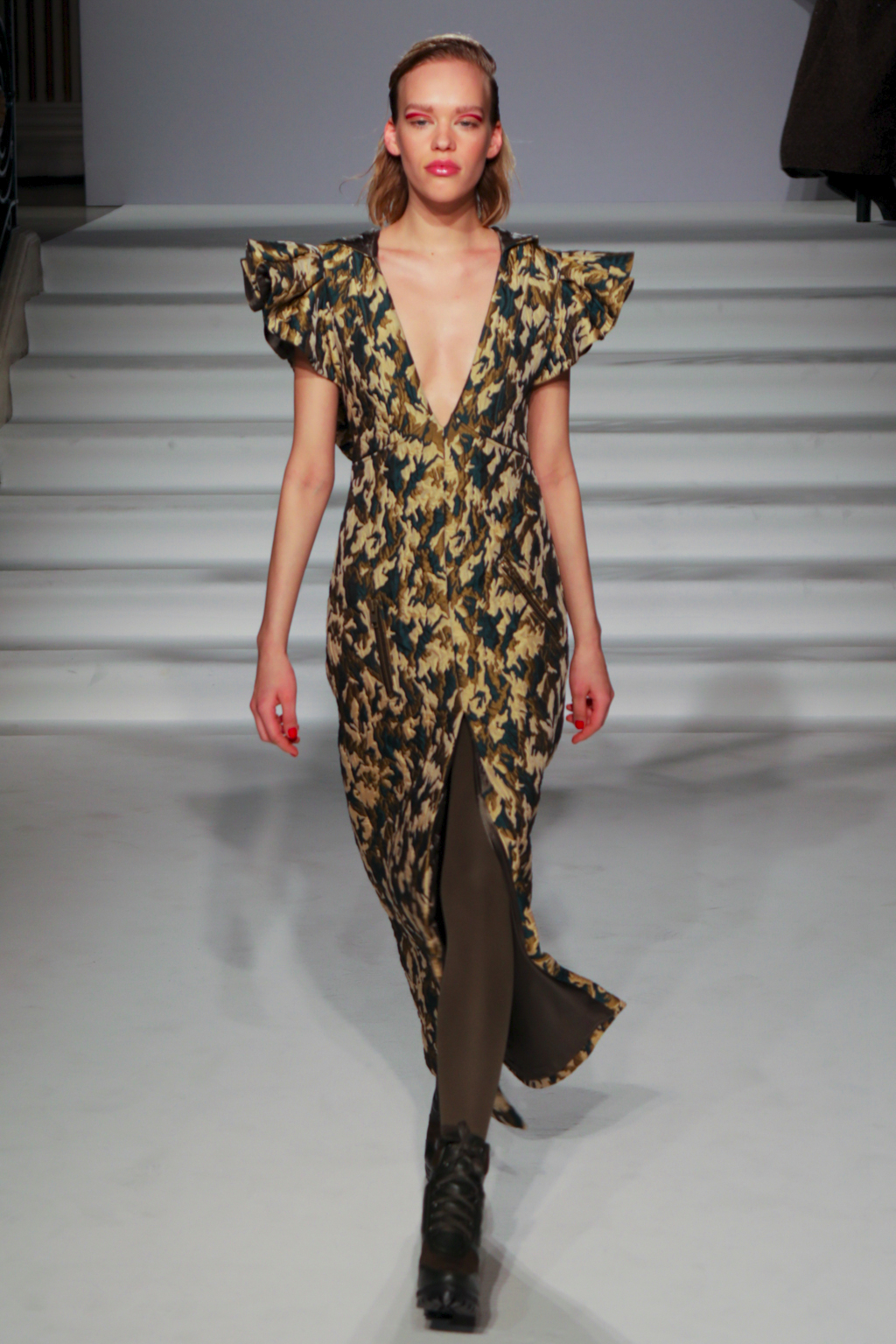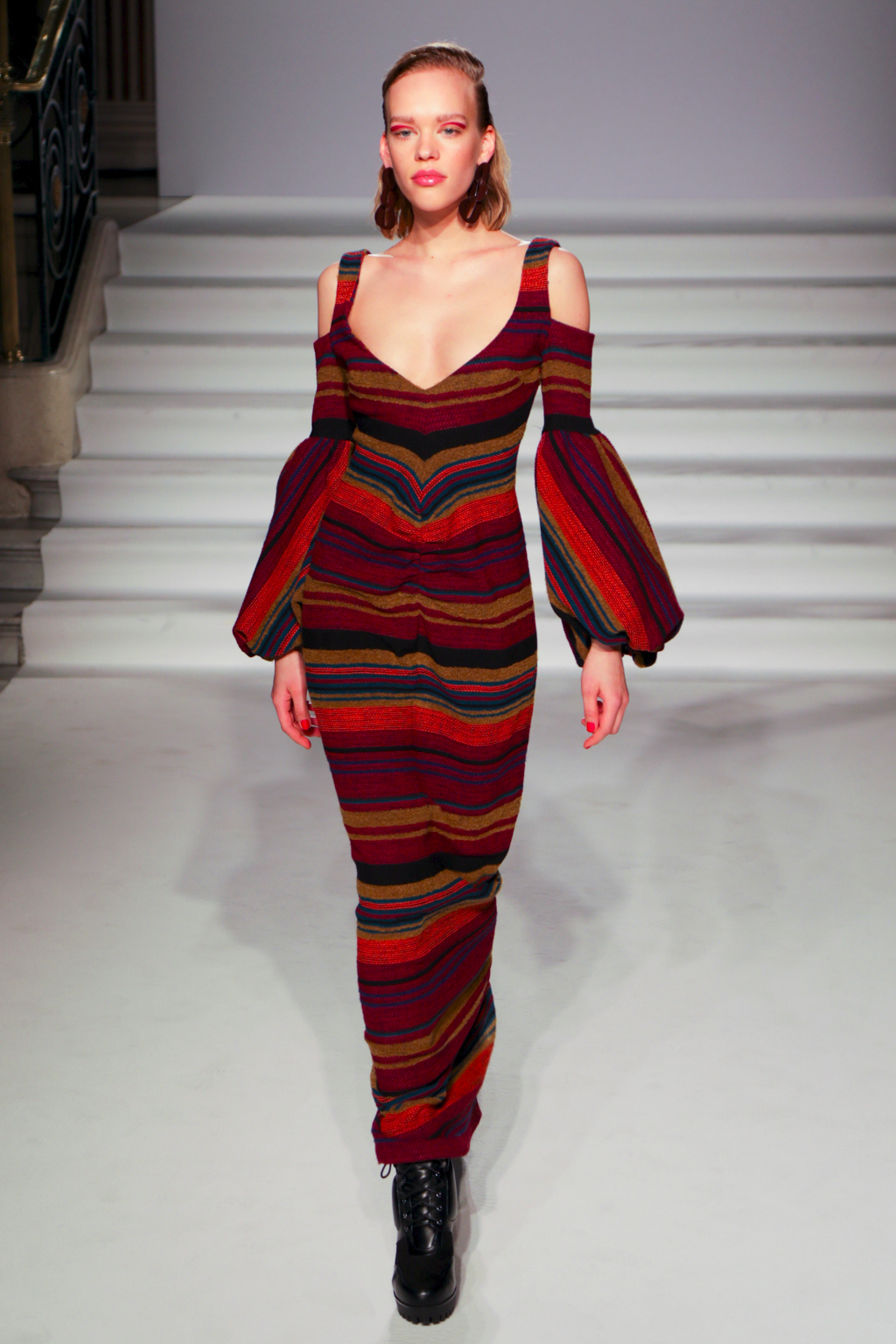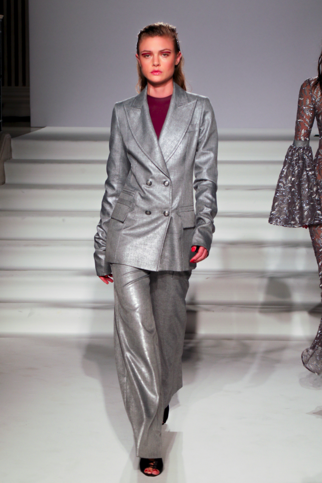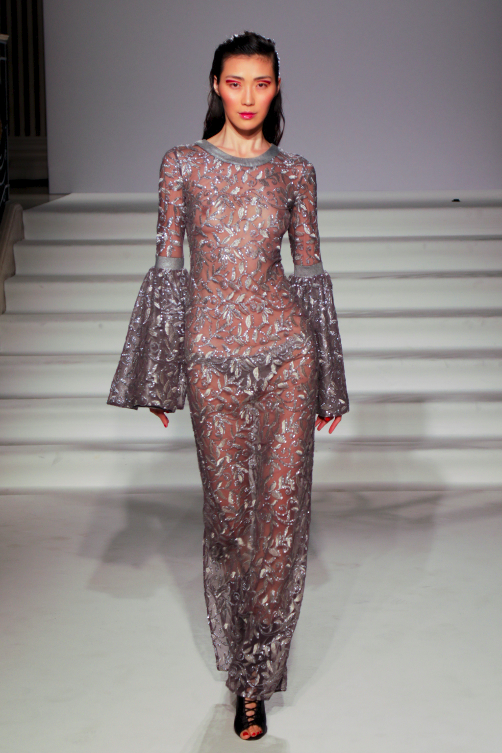 If the first day of LFW was wrapped around tones of soft pink, then Costelloe’s autumn/winter 2017 collection integrated strong shades of burgundy and smoky grey. Moreover, he inserted a dose of feminine allure through full-length, transparent dresses with silver floral patterns, amplified sleeves and paired with high-heeled ankle suede boots.