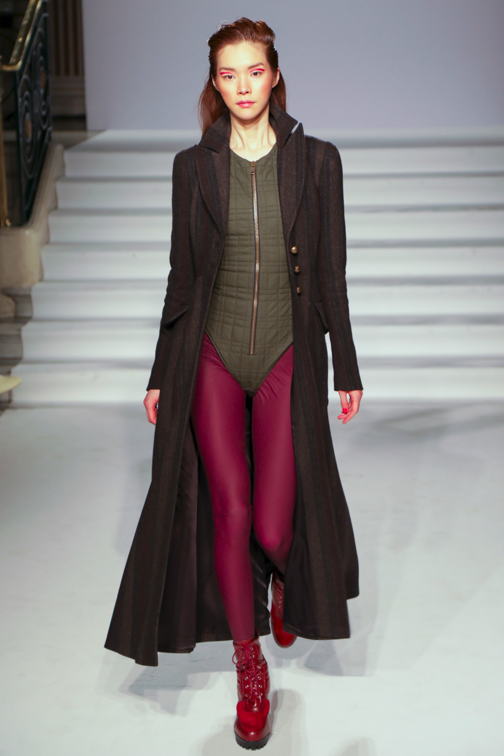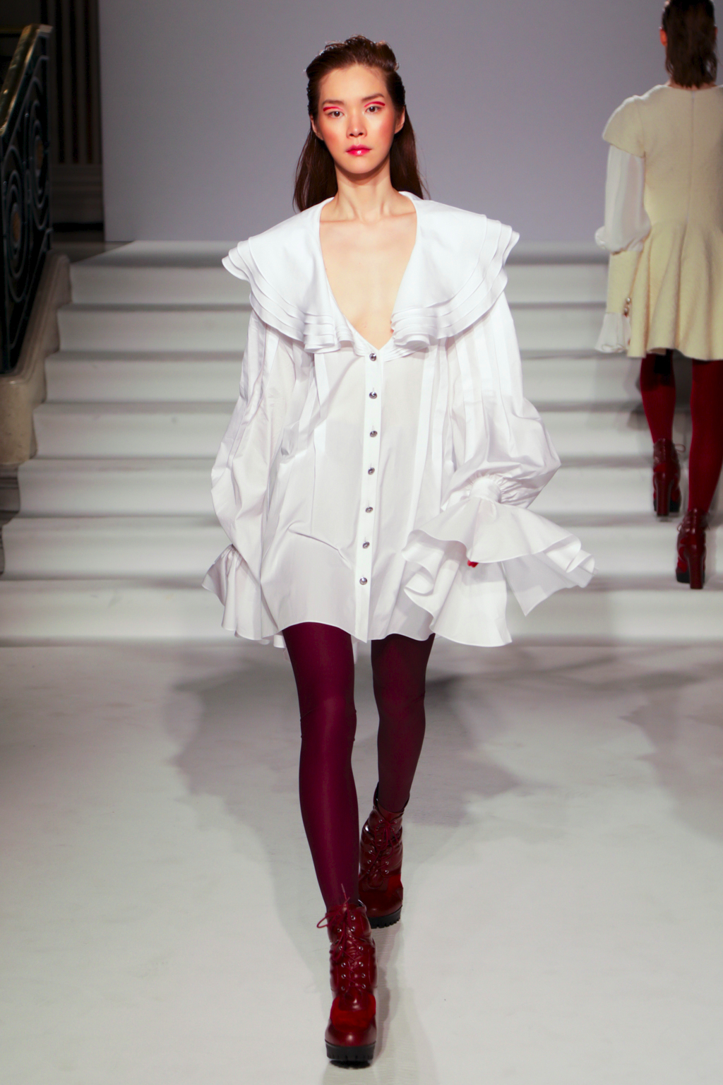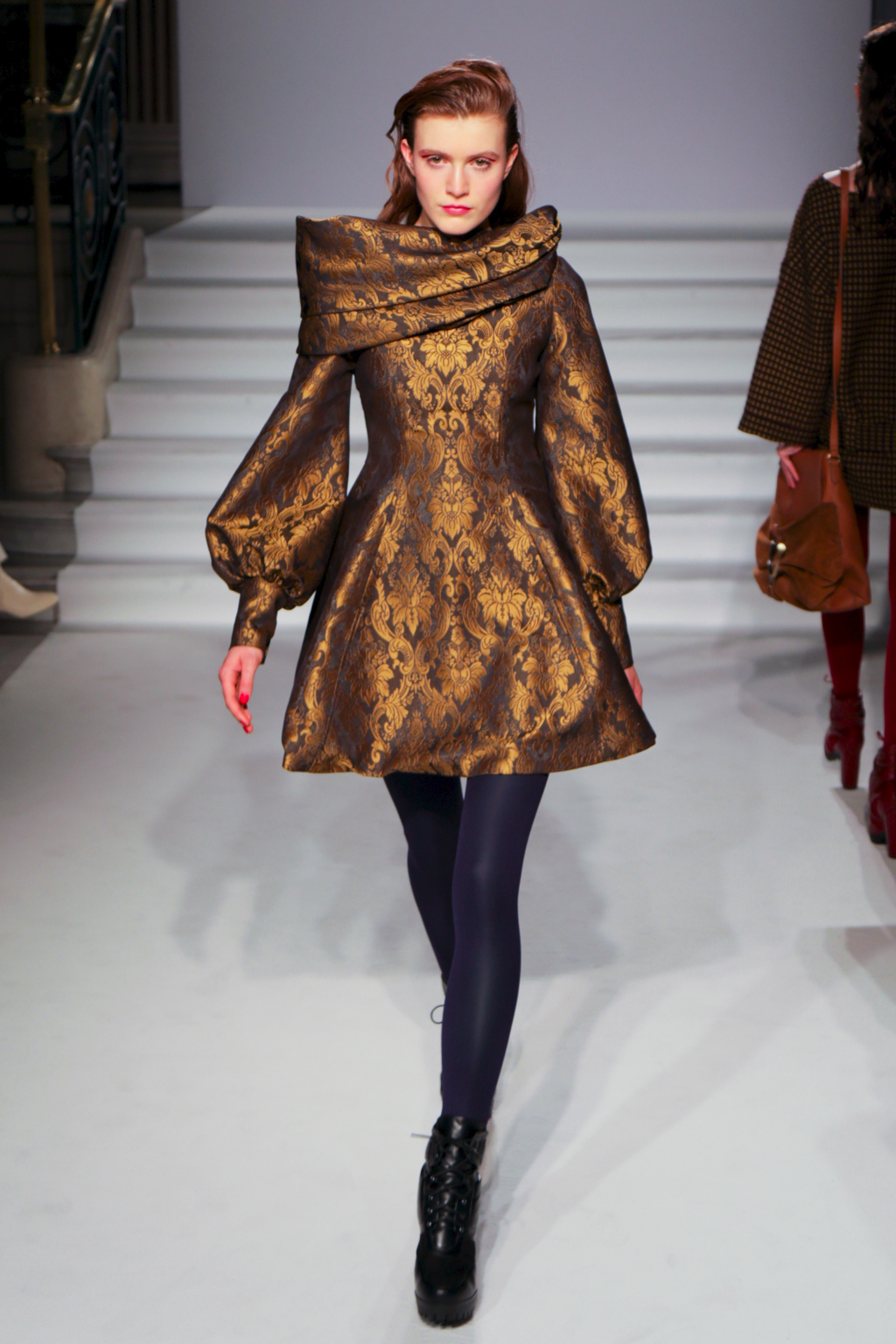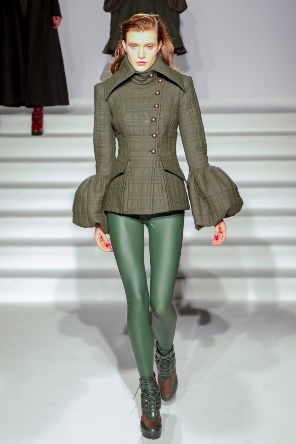 The autumn/winter 2017 was a collection bold in spirit, bringing the forceful look of the Tudor period in the centre of attention, through exaggerated, lavish sleeves. The beautiful tailoring combined with the high-quality materials embodied a dominant, contemporary visual. Beneath the dresses or skirts of diverse lengths, carmine, cobalt blue or emerald leggings made out of English latex added a vigorous glow to the collection.