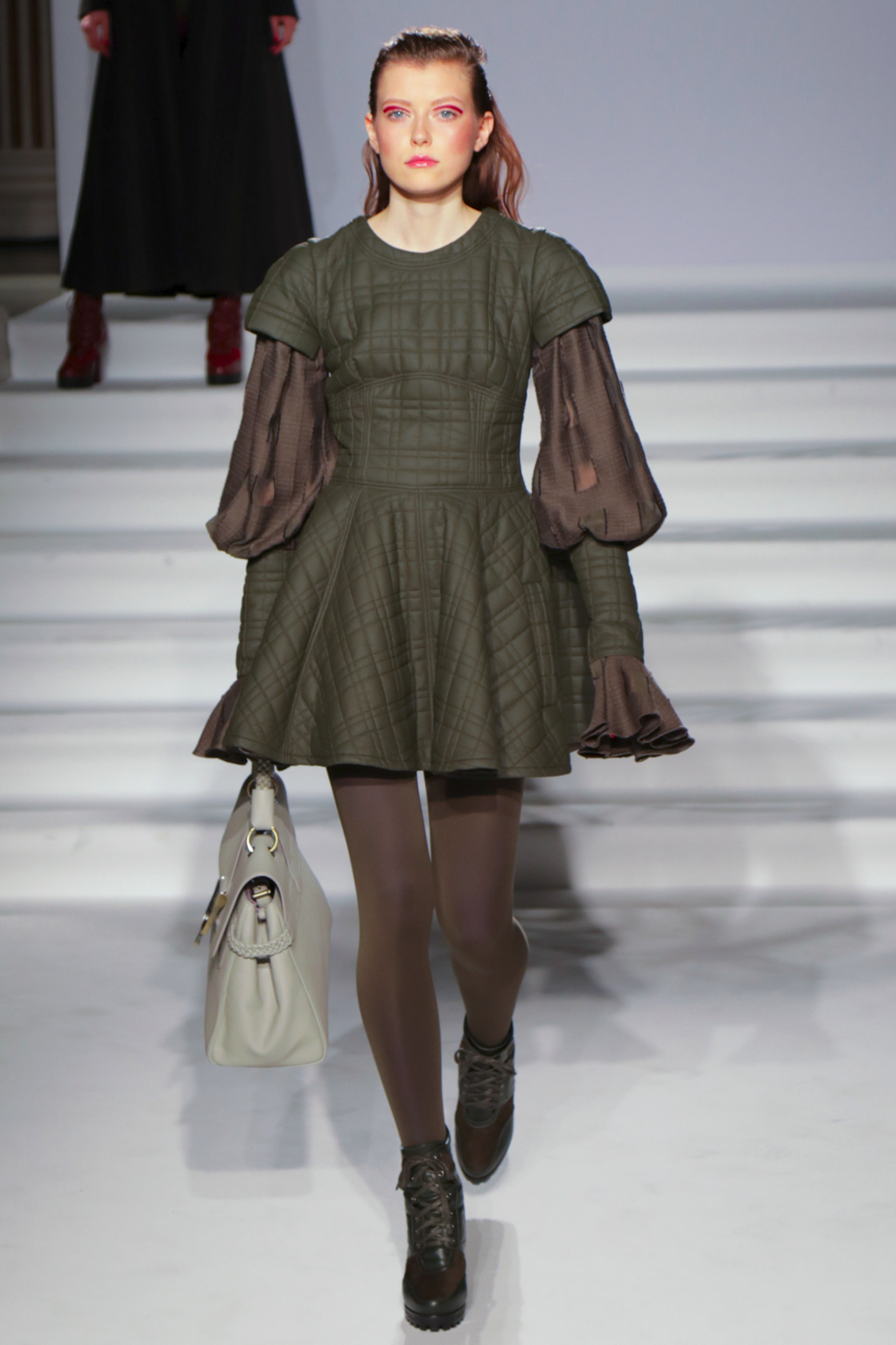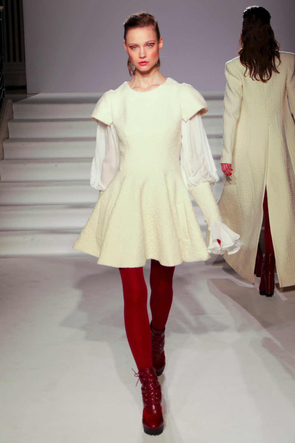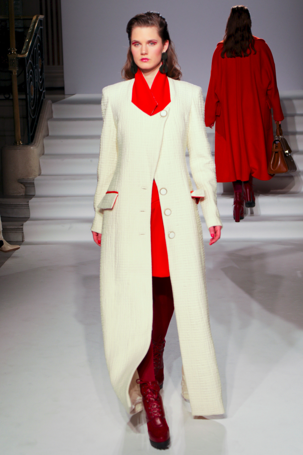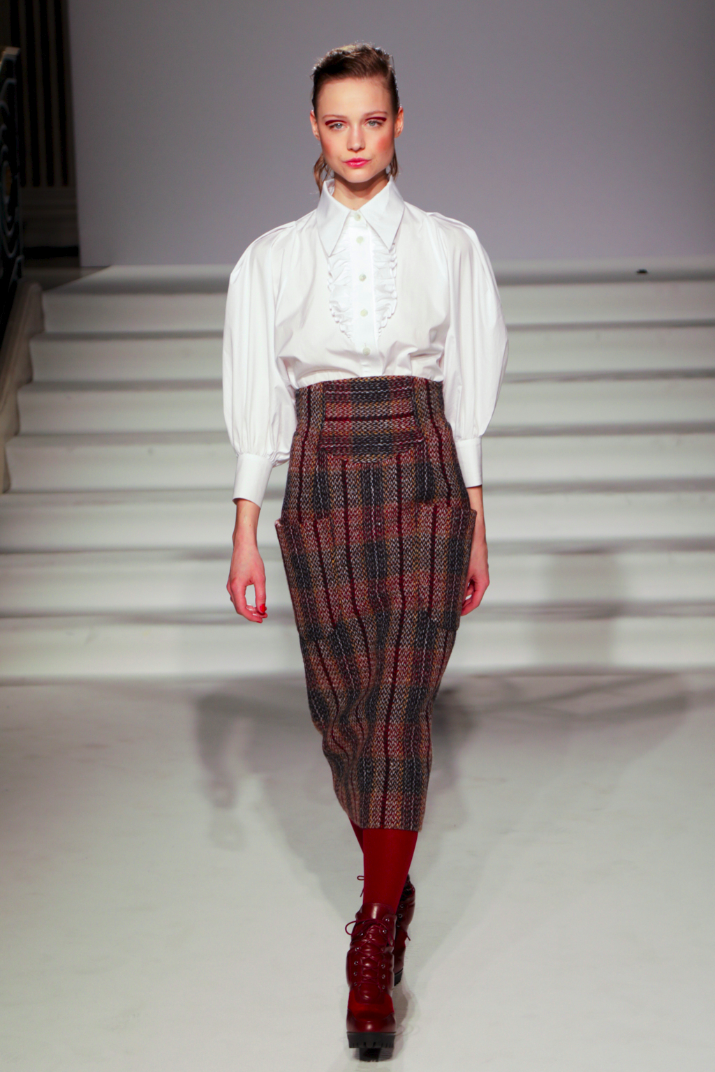The autumn/winter 2017 was a collection bold in spirit, bringing the forceful look of the Tudor period in the centre of attention, through exaggerated, lavish sleeves. The beautiful tailoring combined with the high-quality materials embodied a dominant, contemporary visual. Beneath the dresses or skirts of diverse lengths, carmine, cobalt blue or emerald leggings made out of English latex added a vigorous glow to the collection.
