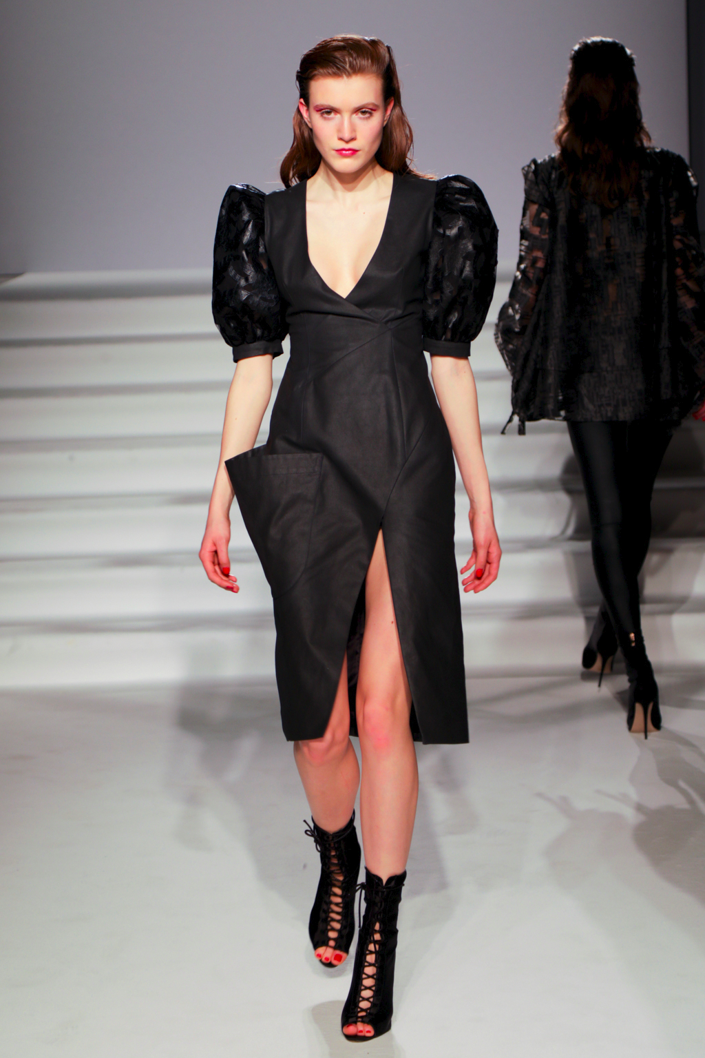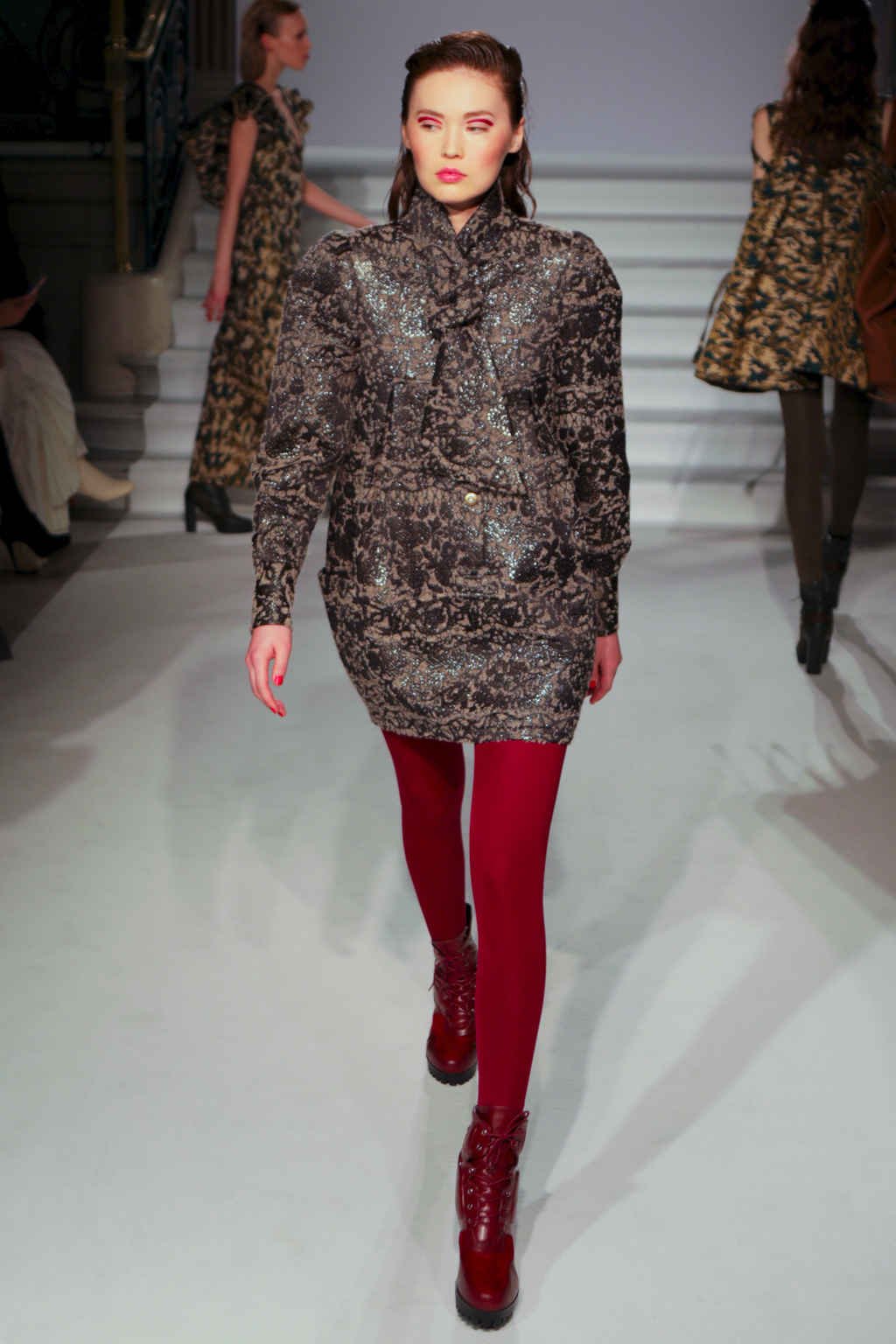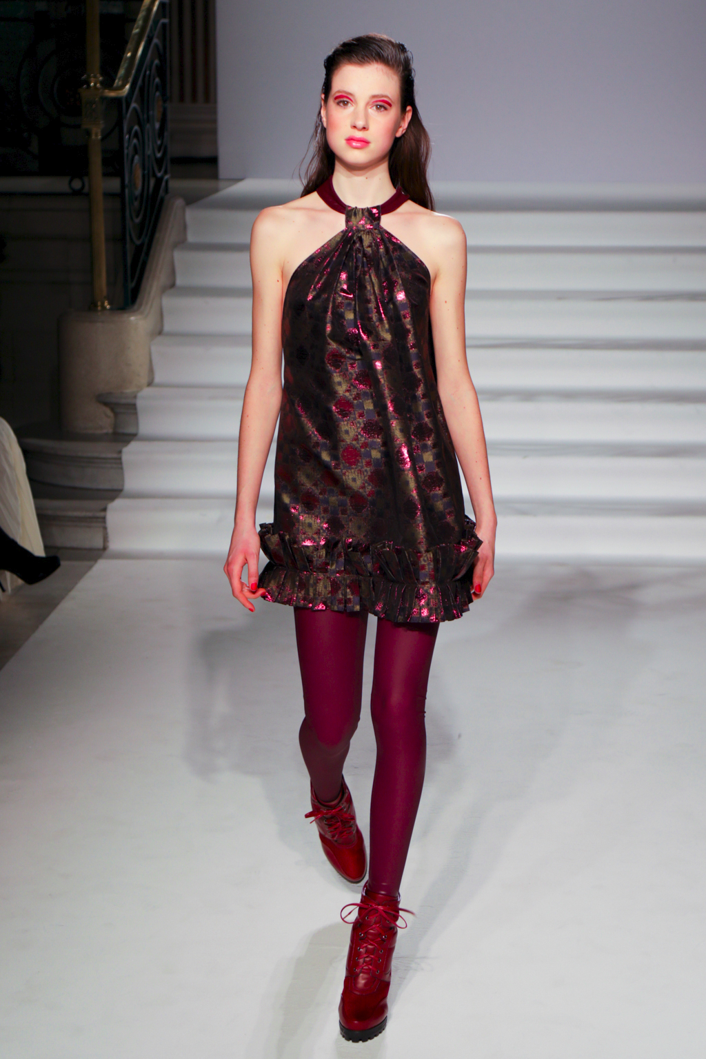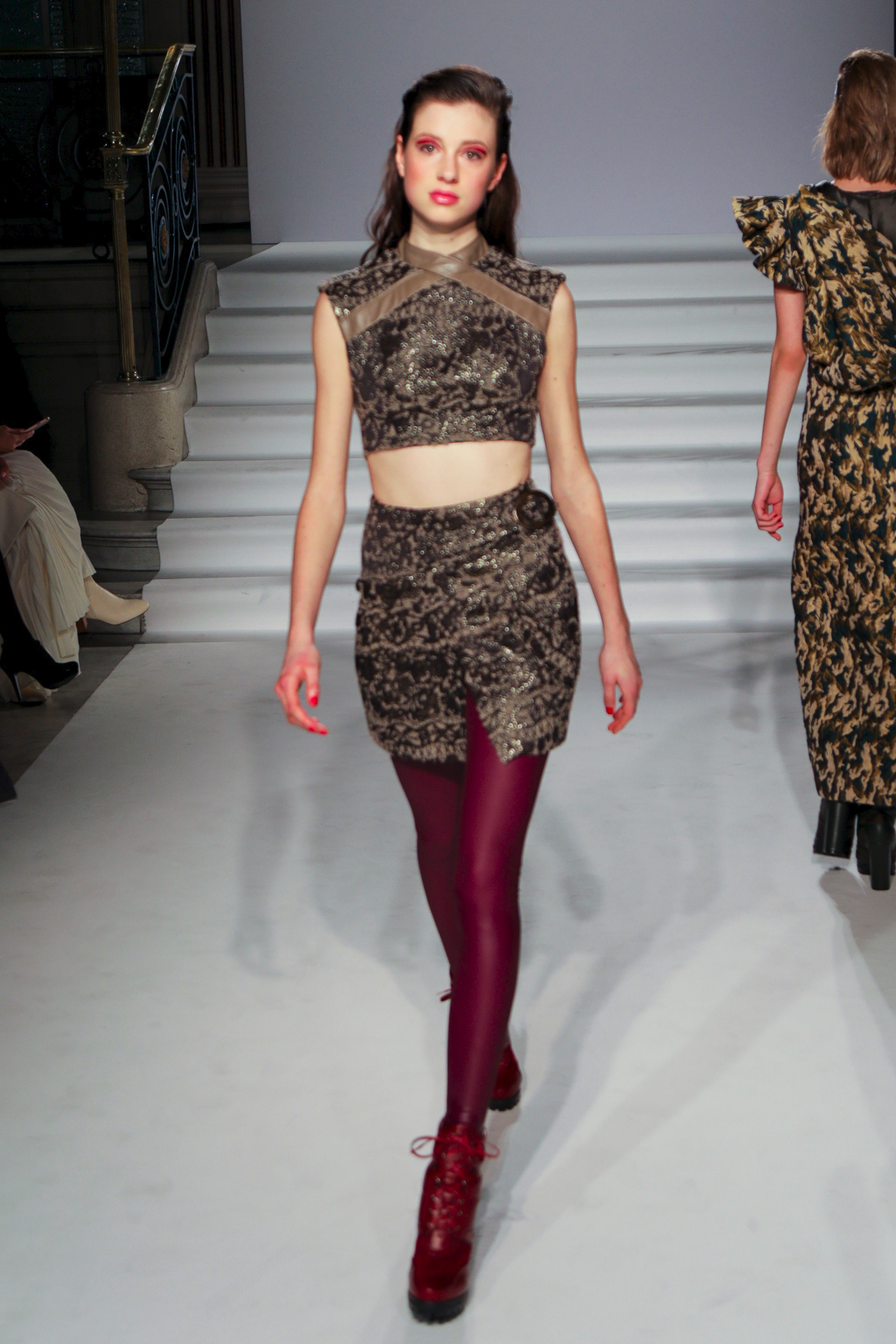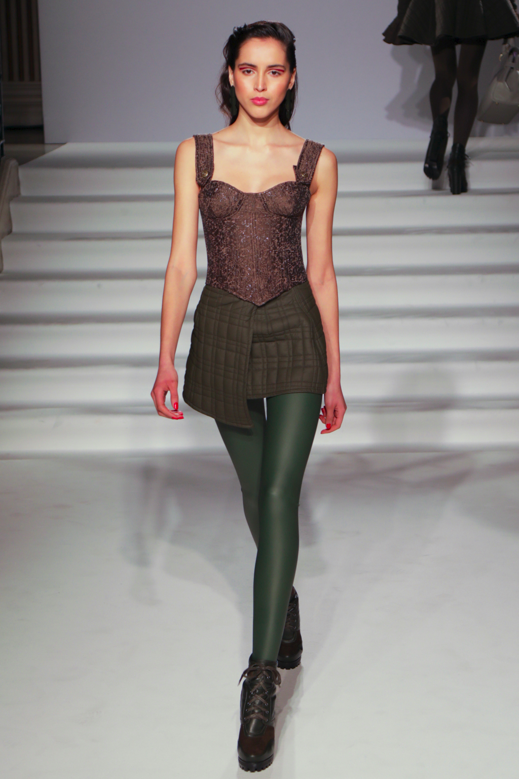 The autumn/winter 2017 was a collection bold in spirit, bringing the forceful look of the Tudor period in the centre of attention, through exaggerated, lavish sleeves. The beautiful tailoring combined with the high-quality materials embodied a dominant, contemporary visual. Beneath the dresses or skirts of diverse lengths, carmine, cobalt blue or emerald leggings made out of English latex added a vigorous glow to the collection.