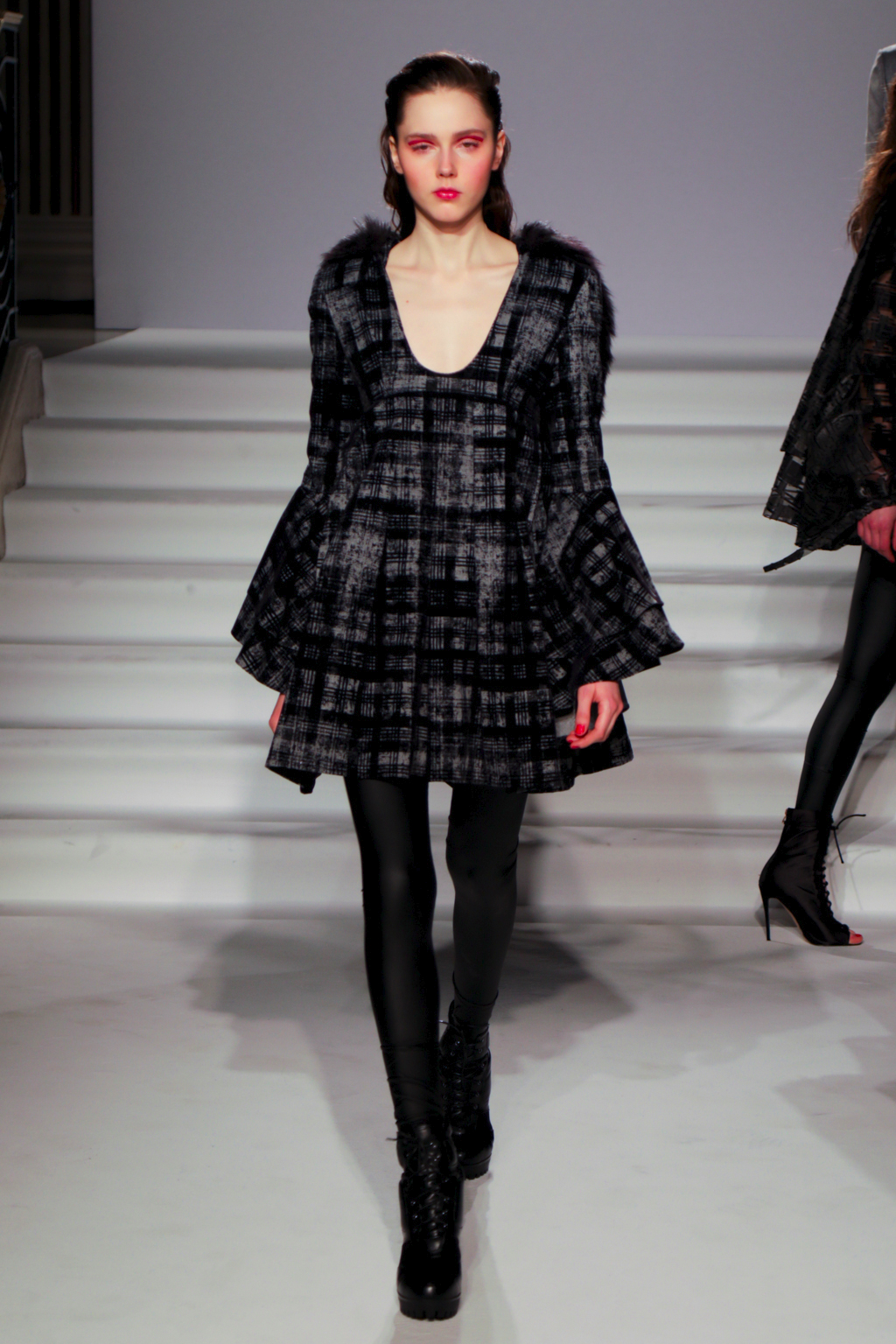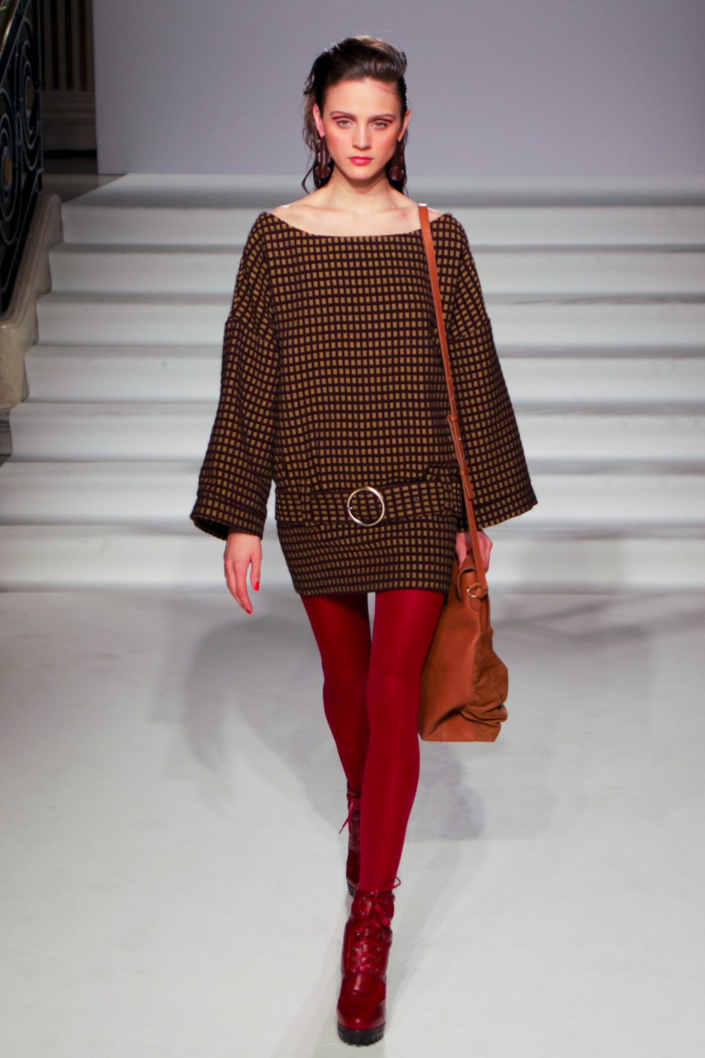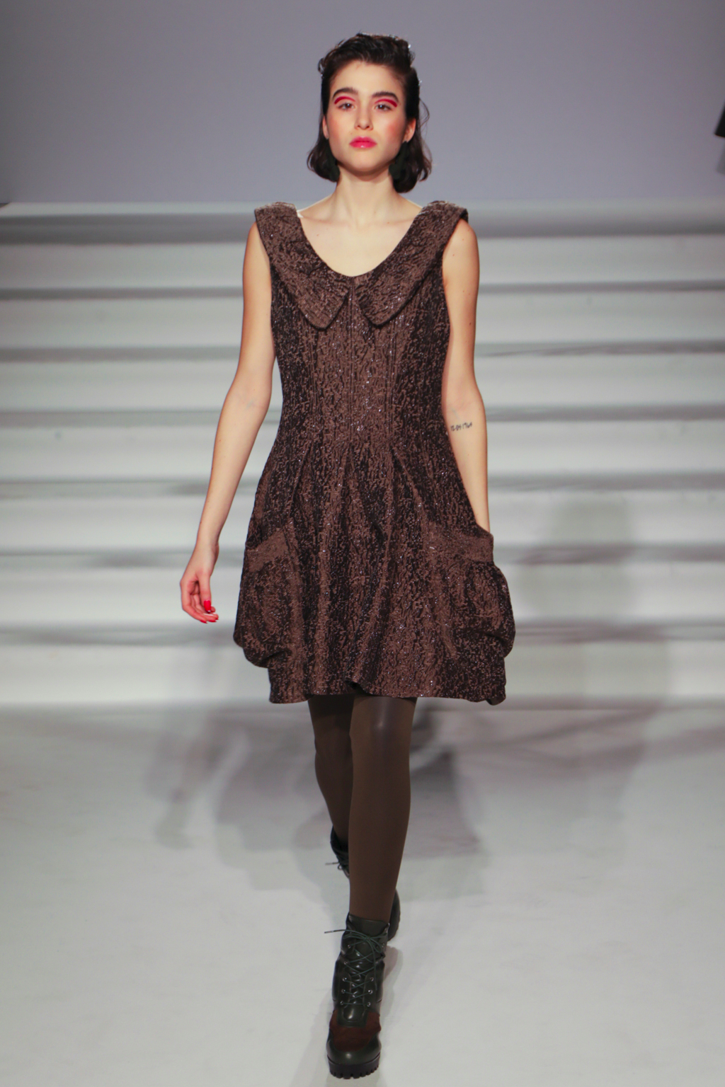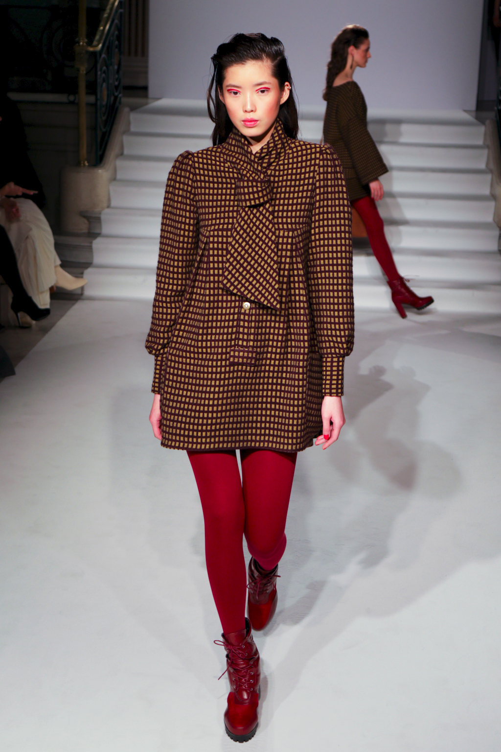 The autumn/winter 2017 was a collection bold in spirit, bringing the forceful look of the Tudor period in the centre of attention, through exaggerated, lavish sleeves. The beautiful tailoring combined with the high-quality materials embodied a dominant, contemporary visual. Beneath the dresses or skirts of diverse lengths, carmine, cobalt blue or emerald leggings made out of English latex added a vigorous glow to the collection.