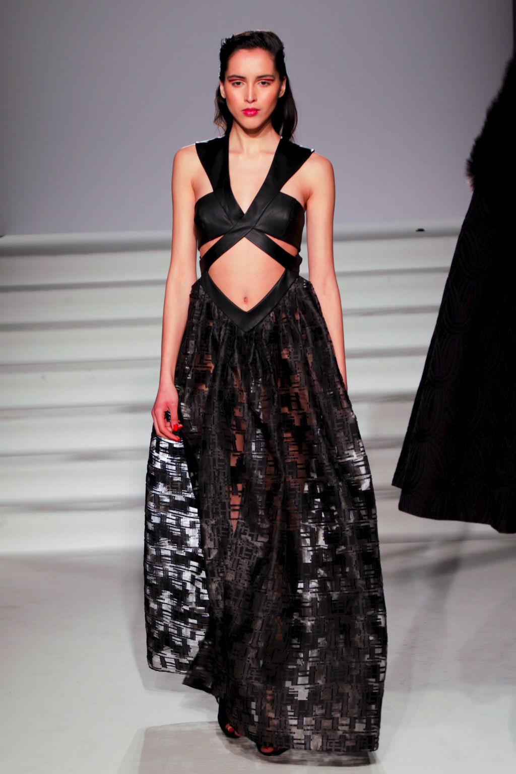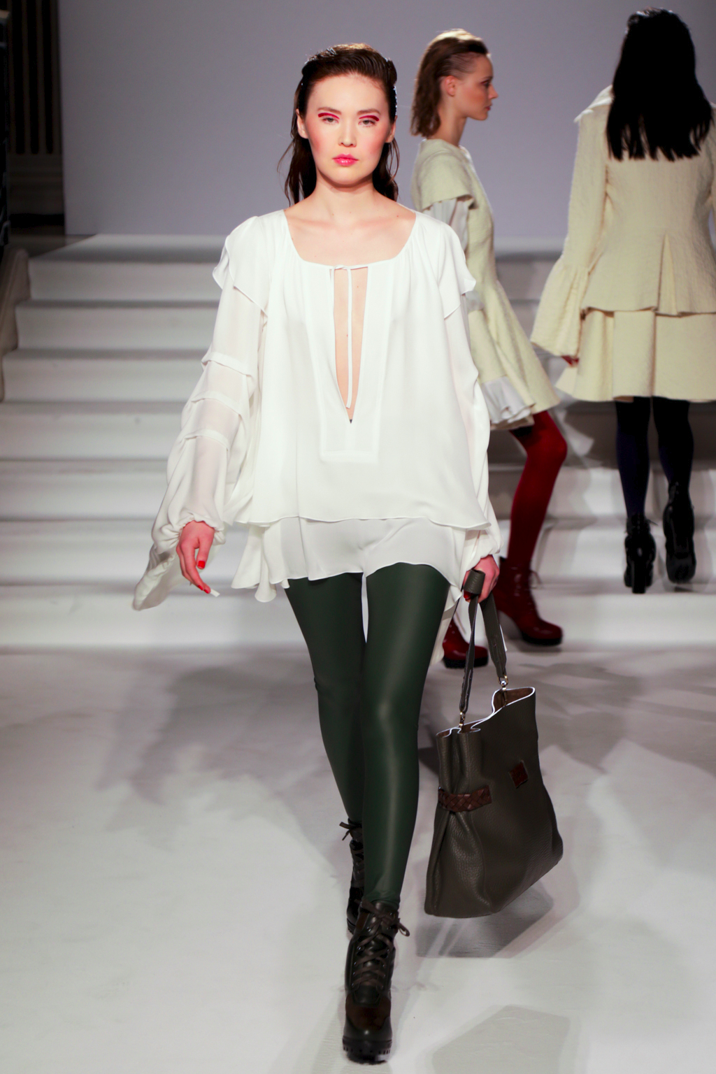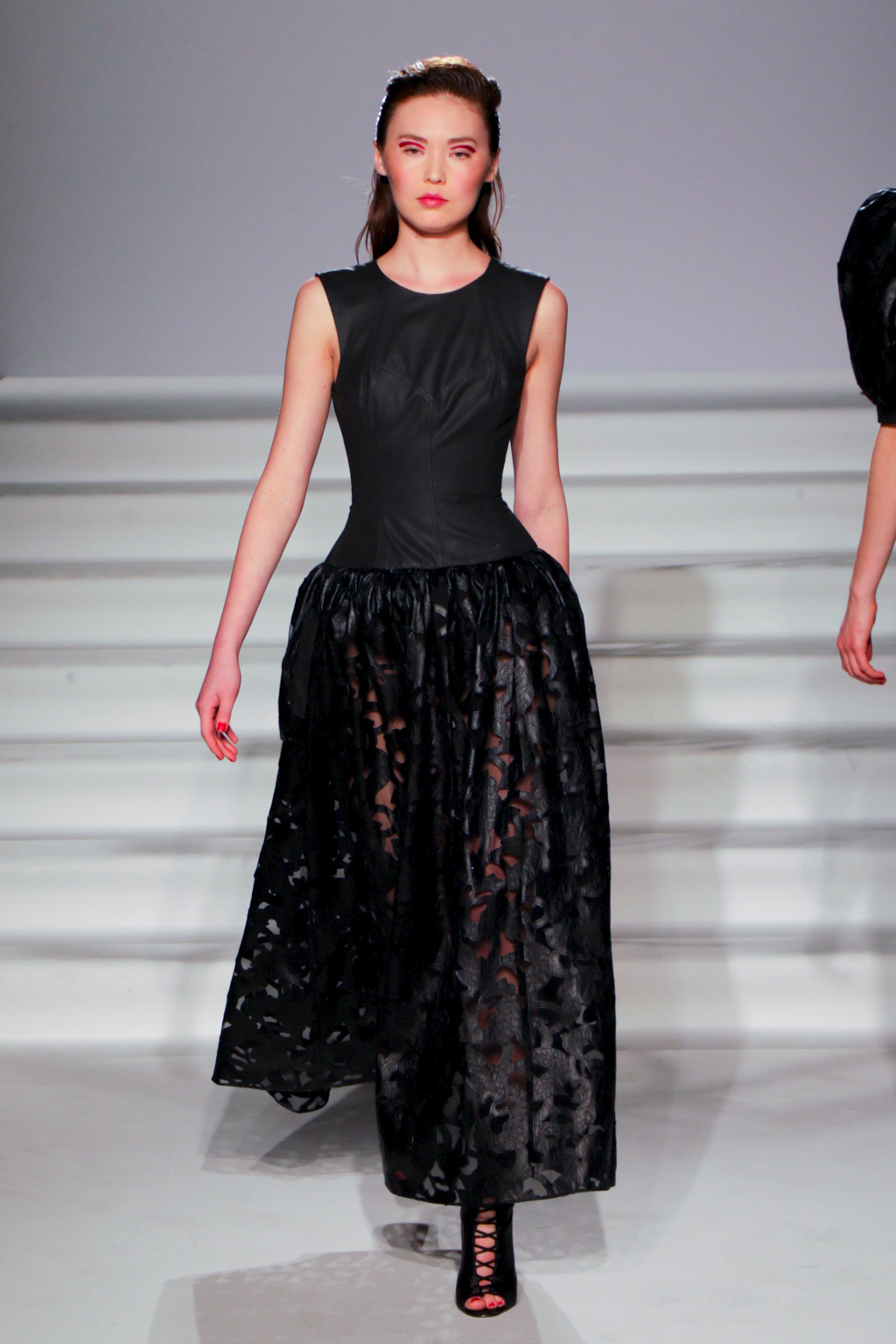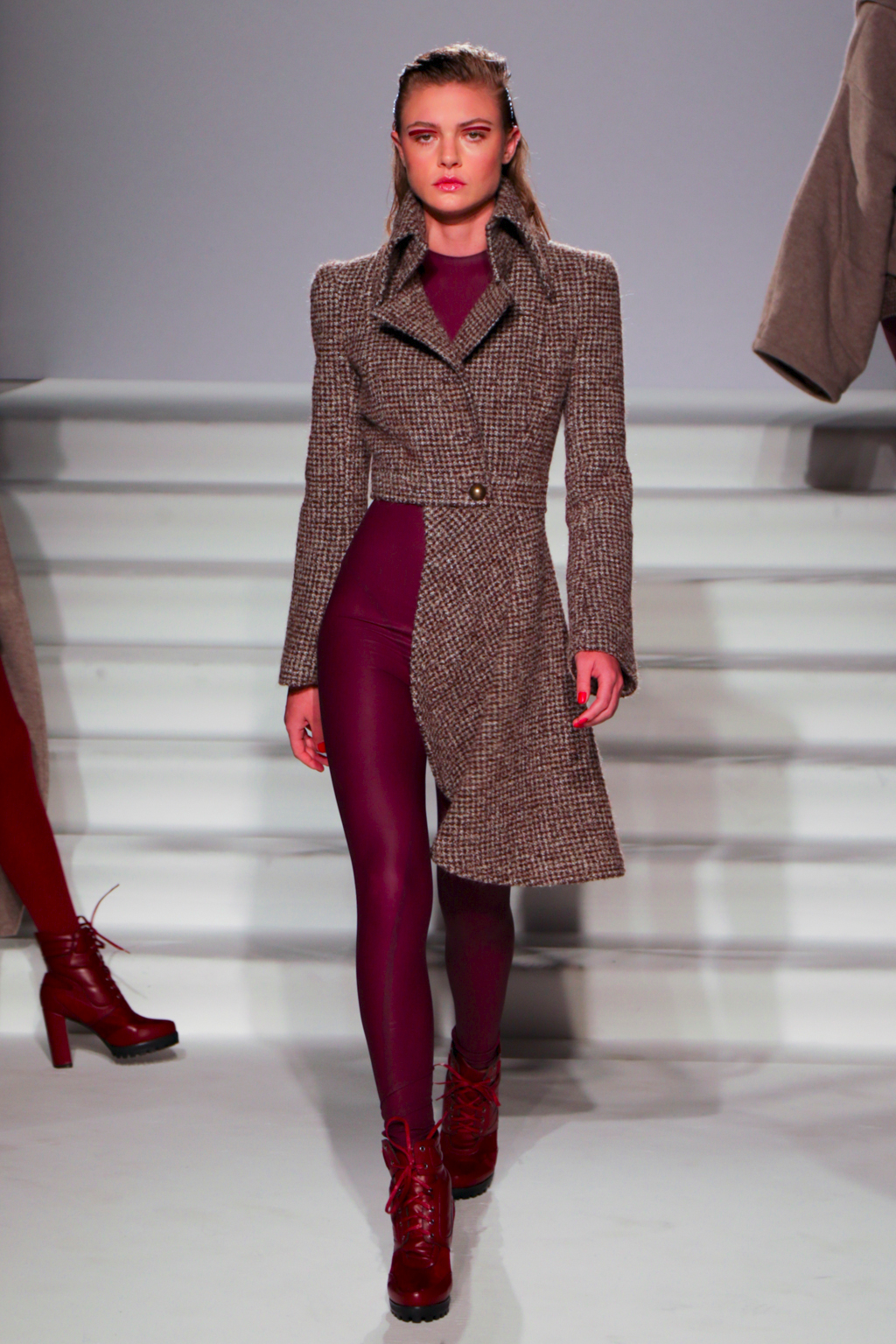 The autumn/winter 2017 was a collection bold in spirit, bringing the forceful look of the Tudor period in the centre of attention, through exaggerated, lavish sleeves. The beautiful tailoring combined with the high-quality materials embodied a dominant, contemporary visual. Beneath the dresses or skirts of diverse lengths, carmine, cobalt blue or emerald leggings made out of English latex added a vigorous glow to the collection.