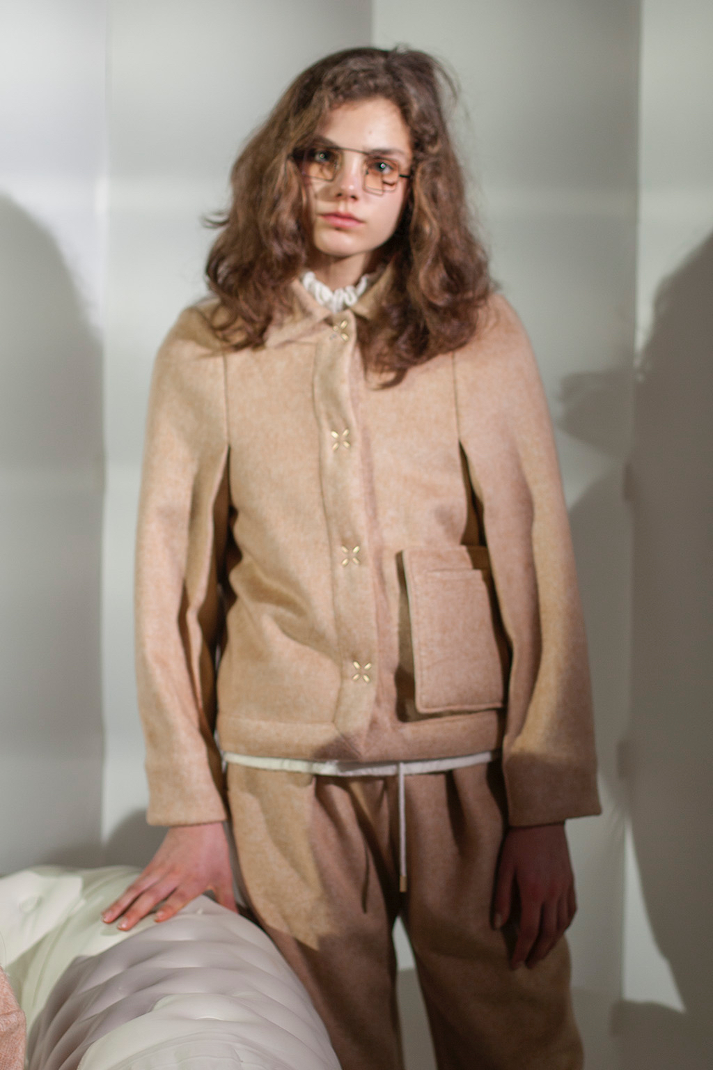 The Seventai’s collection entitled Sleep Now. Work Later, is very minimalist with an indolent feeling of winter stiffness. Teenager models, tangled in sheets and blankets or wearing pillow-leg trousers transmitted a drench of sleepiness, alluring the rest of the world into their cocoon coats, away from the frantic quotidian world.