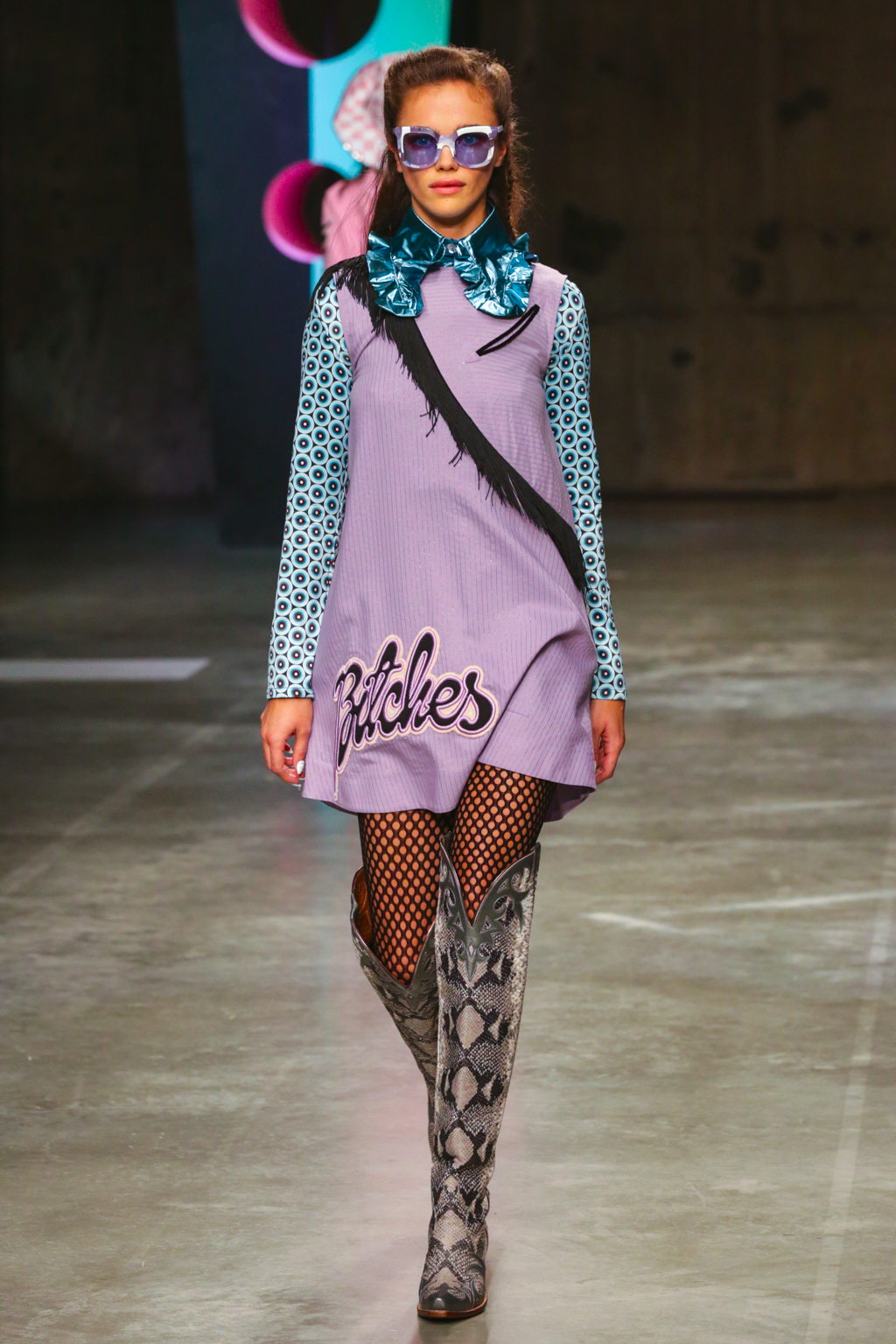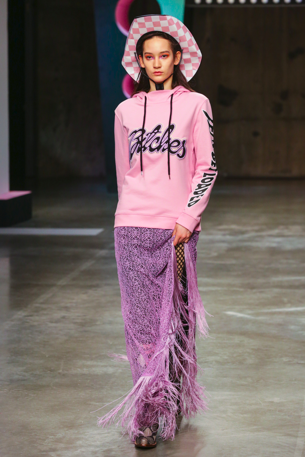 Pastel colours, cutsy cherry prints and mini tartan skirts paired with fishnets emphasised the naughty girl look while signature text “Daddy”, “Bitches: Let’s get loaded” was scrawled across hood fronts and down sleeves.