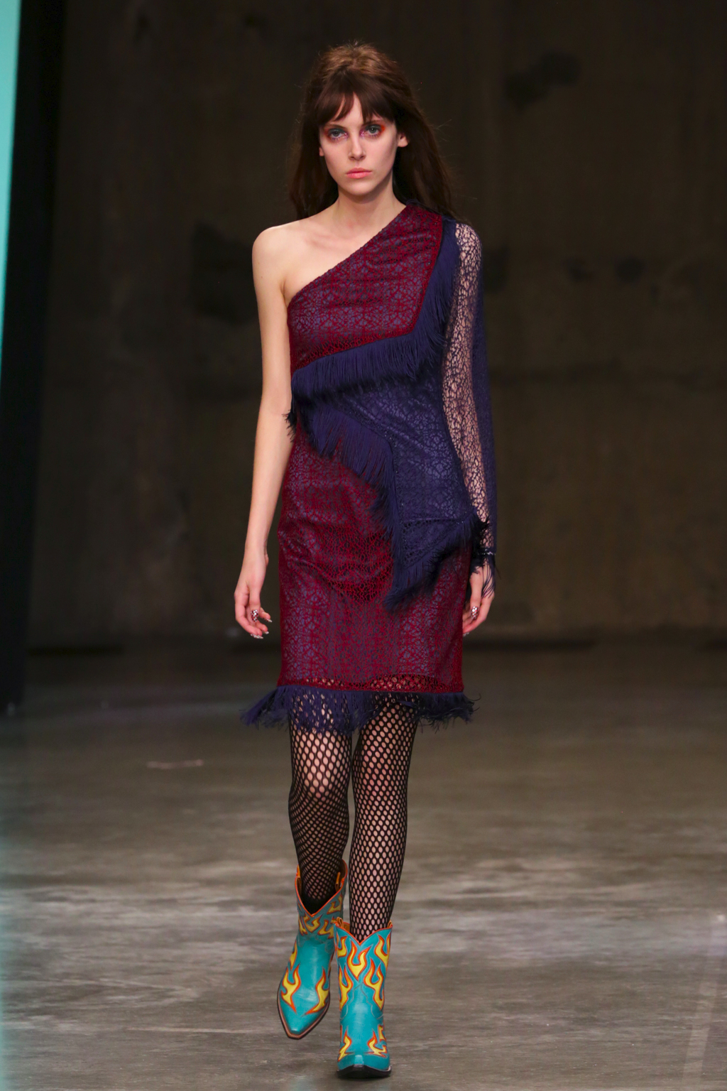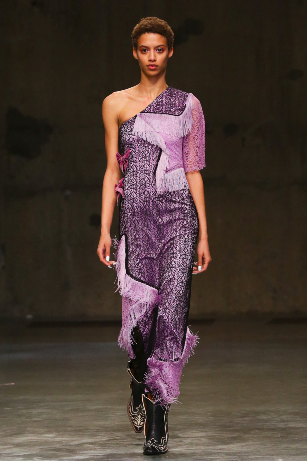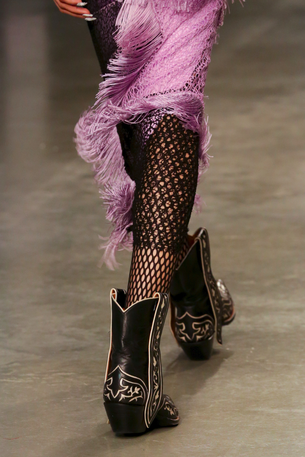 Models strutted in calf to thigh high cowboy boots, rocked cowboy hats and tassel fringing lined the back of shirts. Check, pin stripe and cartoonish stars decorated fabrics. Printed satin and denim, mohair knits, Mongolian long hair shearling and cobweb guipure lace created a whirlwind of textures.