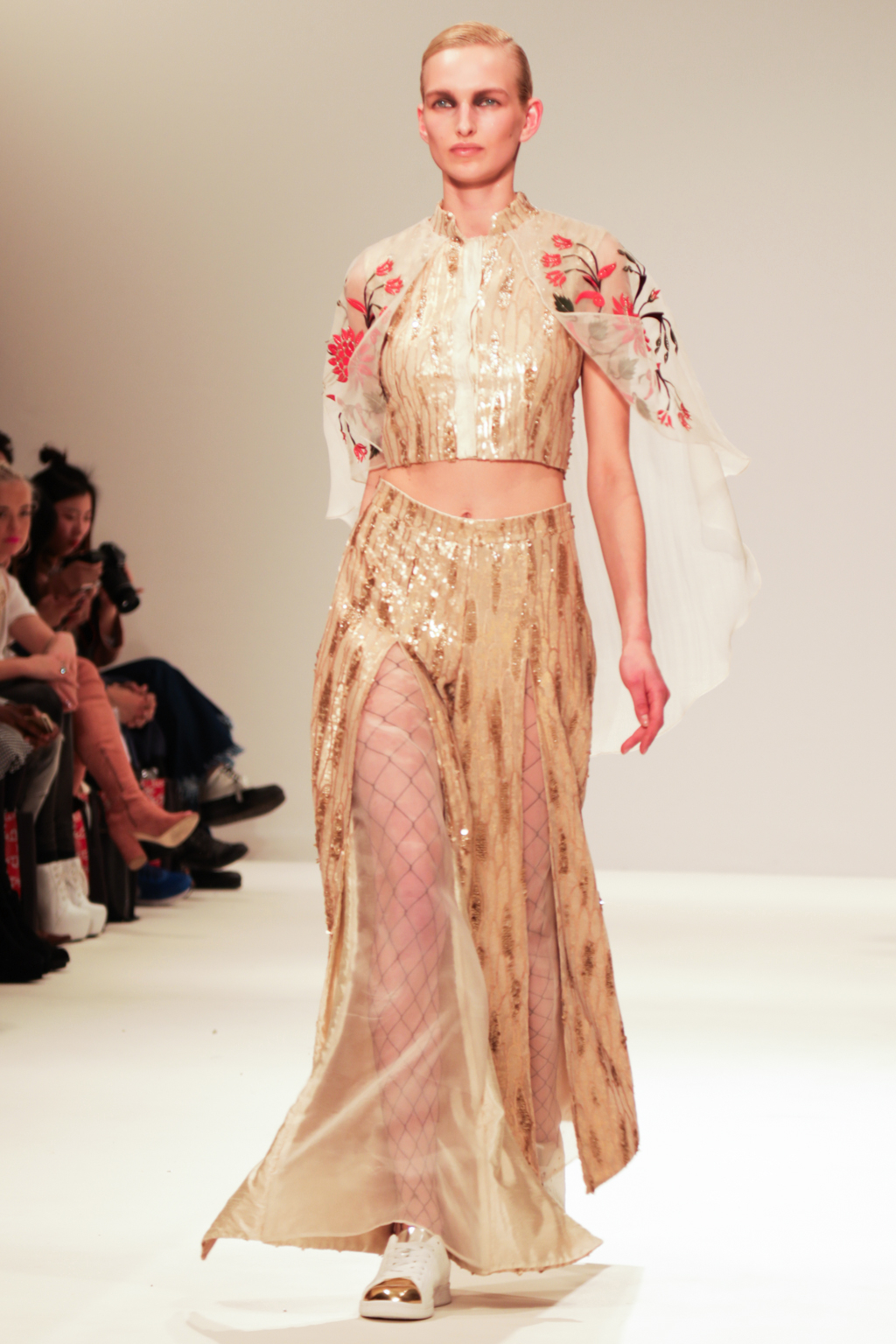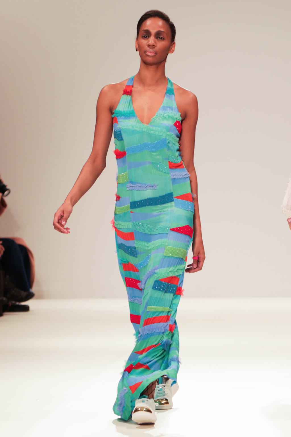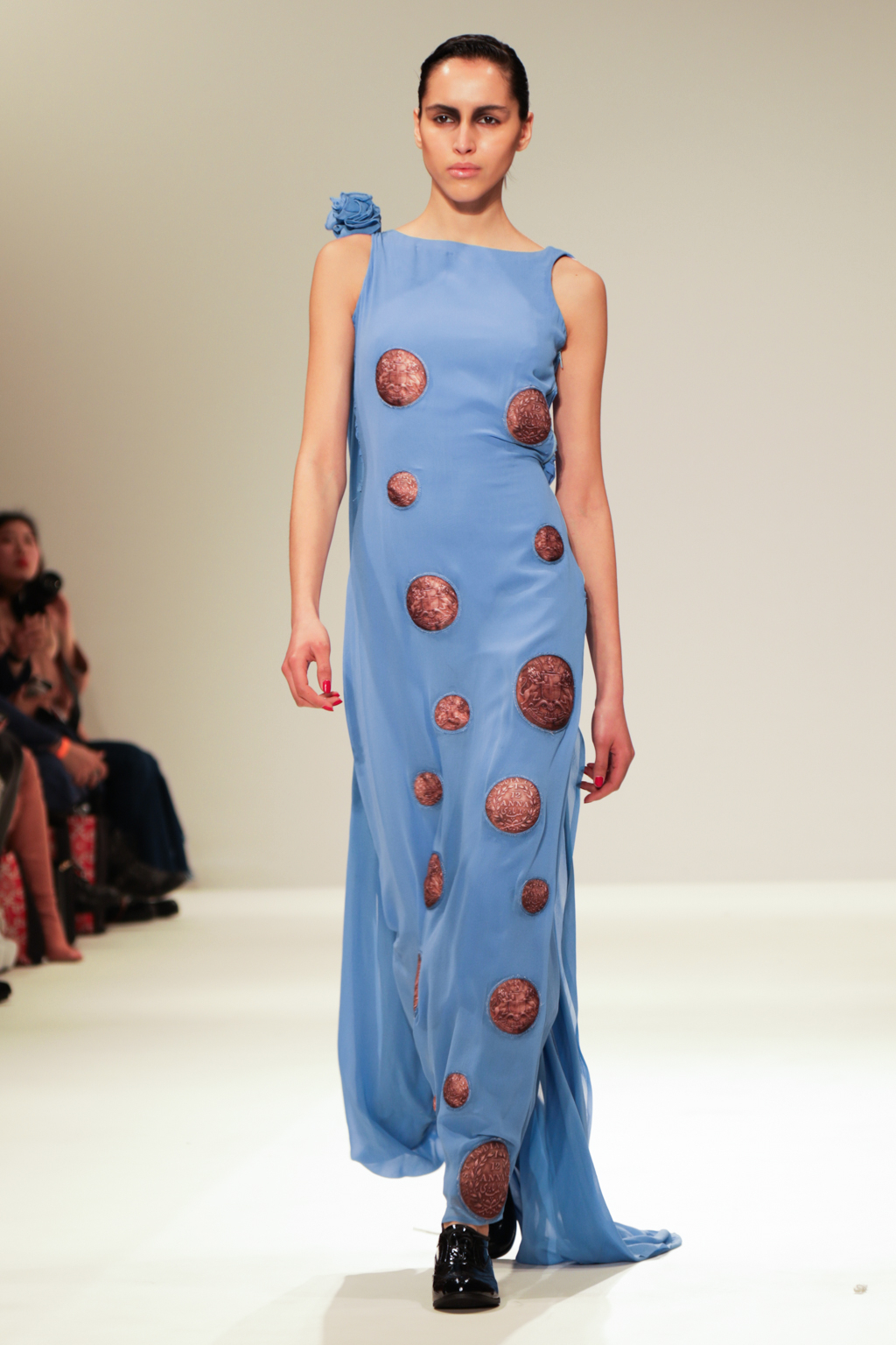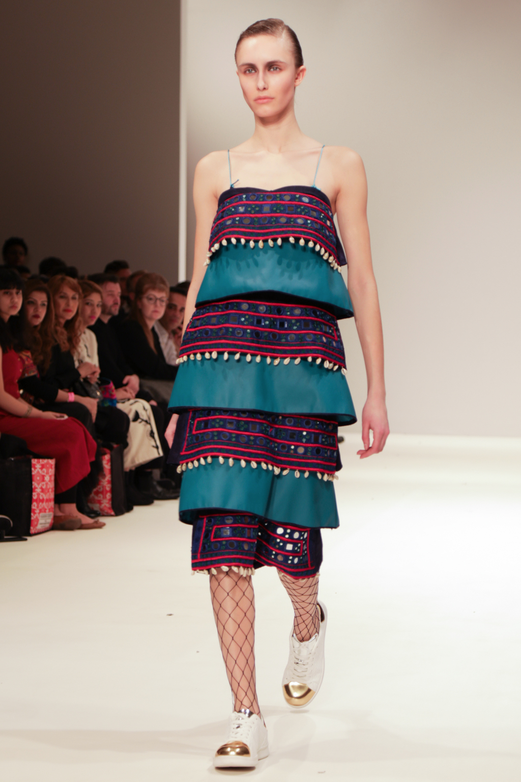 The dedication to Indian craft and fabrics was evident in the students’ take on embroidery and the predominant use of cotton and silk. Tribute was also paid to the Sari in a modern, emerald green cotton gown with delicate gold detailing.