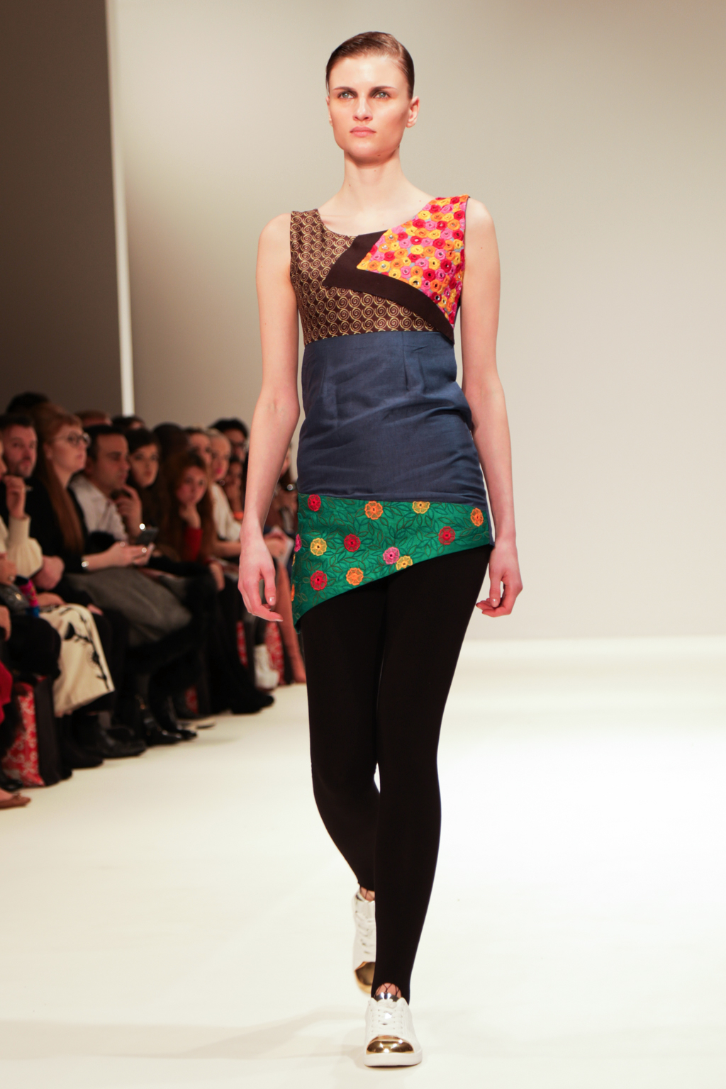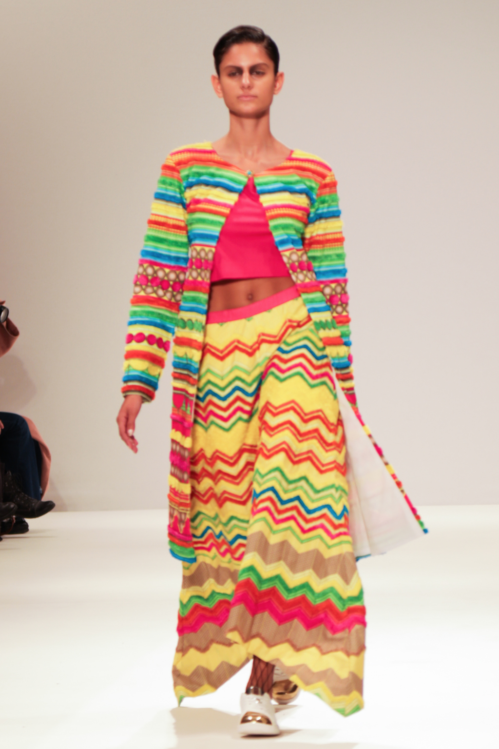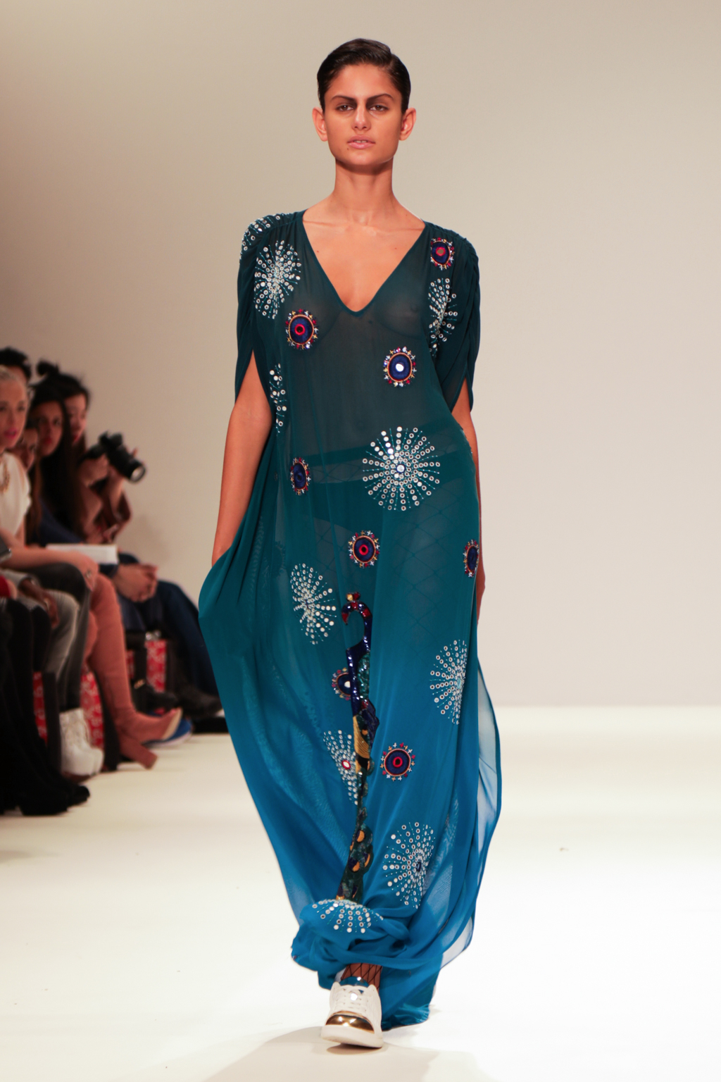 The dedication to Indian craft and fabrics was evident in the students’ take on embroidery and the predominant use of cotton and silk. Tribute was also paid to the Sari in a modern, emerald green cotton gown with delicate gold detailing.