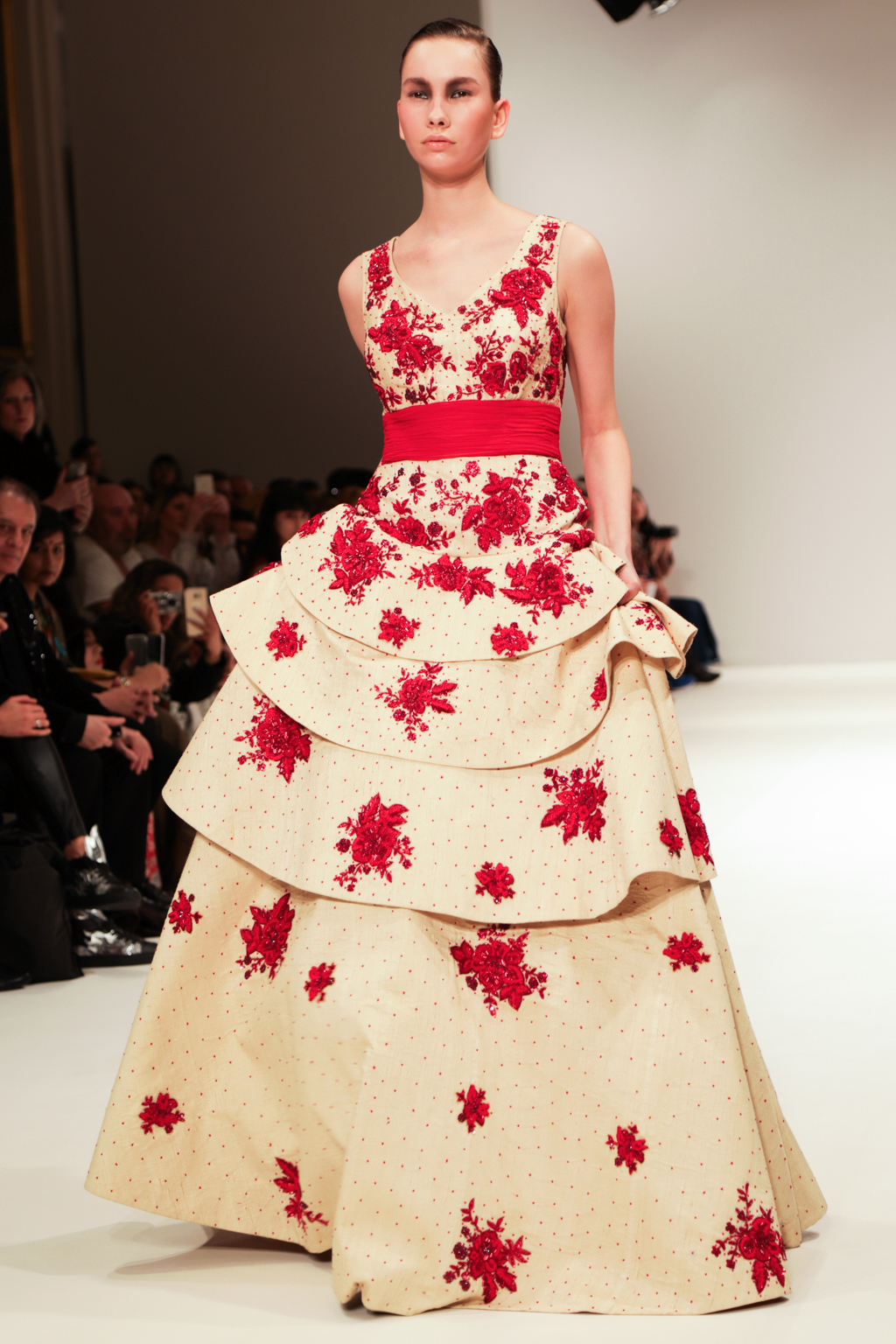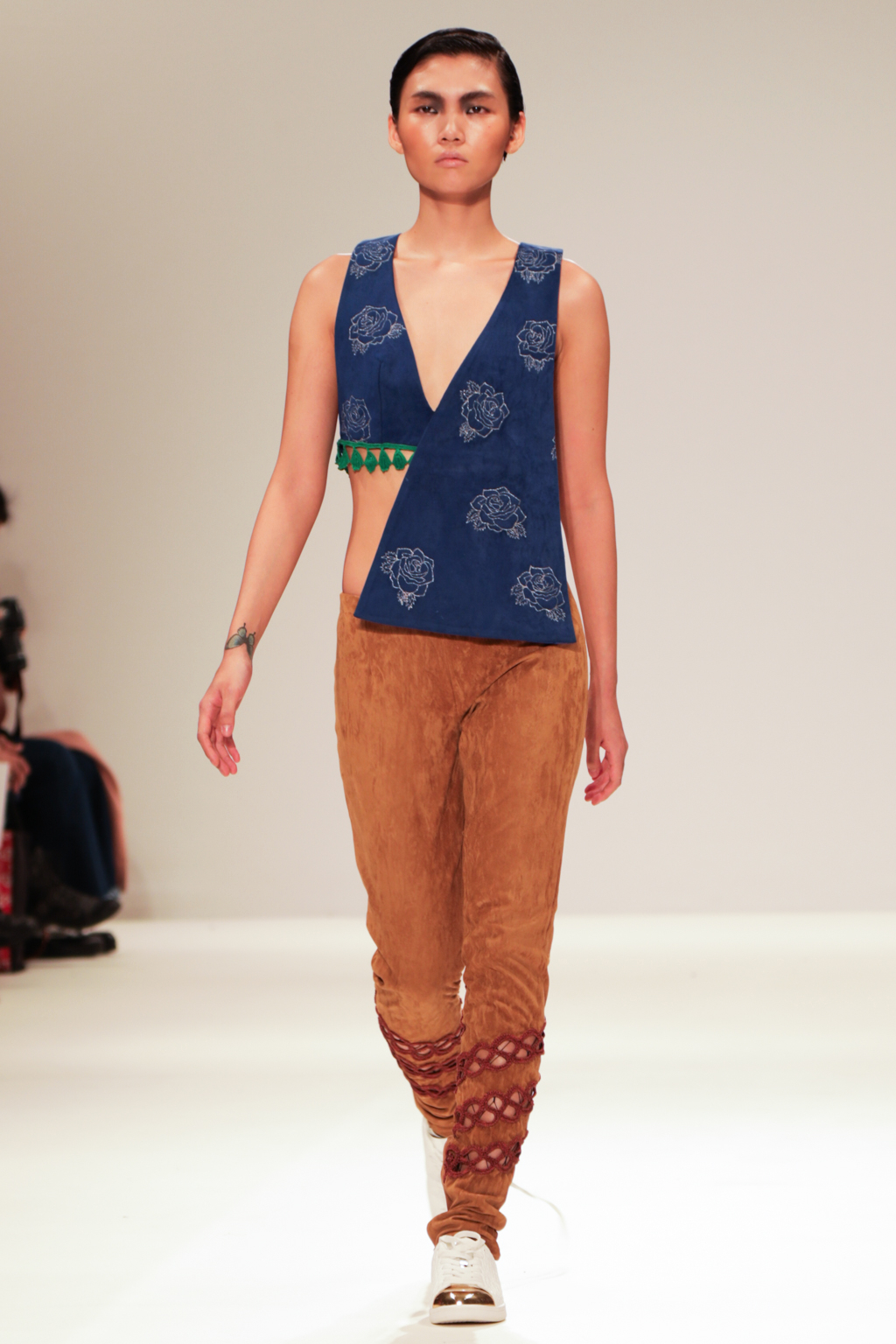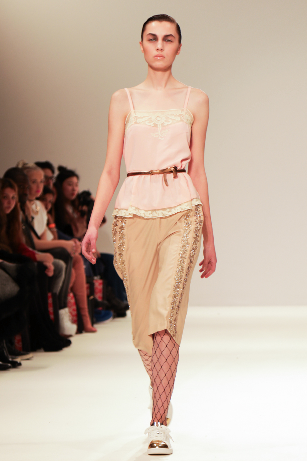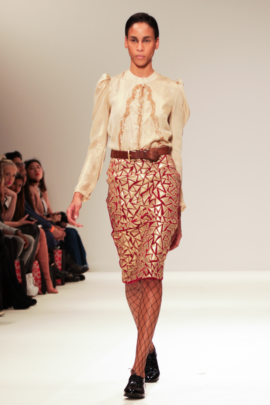 The dedication to Indian craft and fabrics was evident in the students’ take on embroidery and the predominant use of cotton and silk. Tribute was also paid to the Sari in a modern, emerald green cotton gown with delicate gold detailing.
