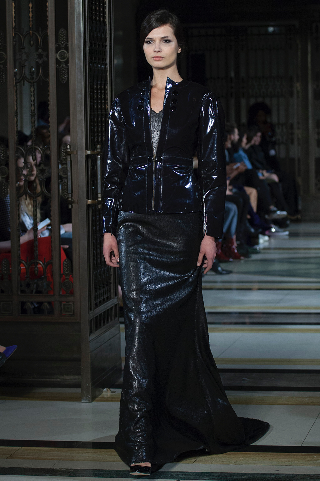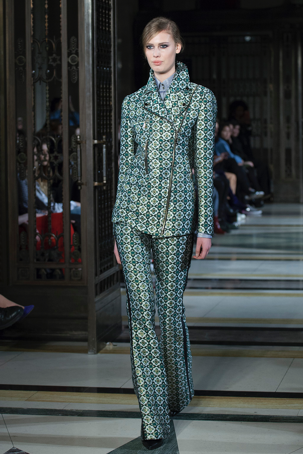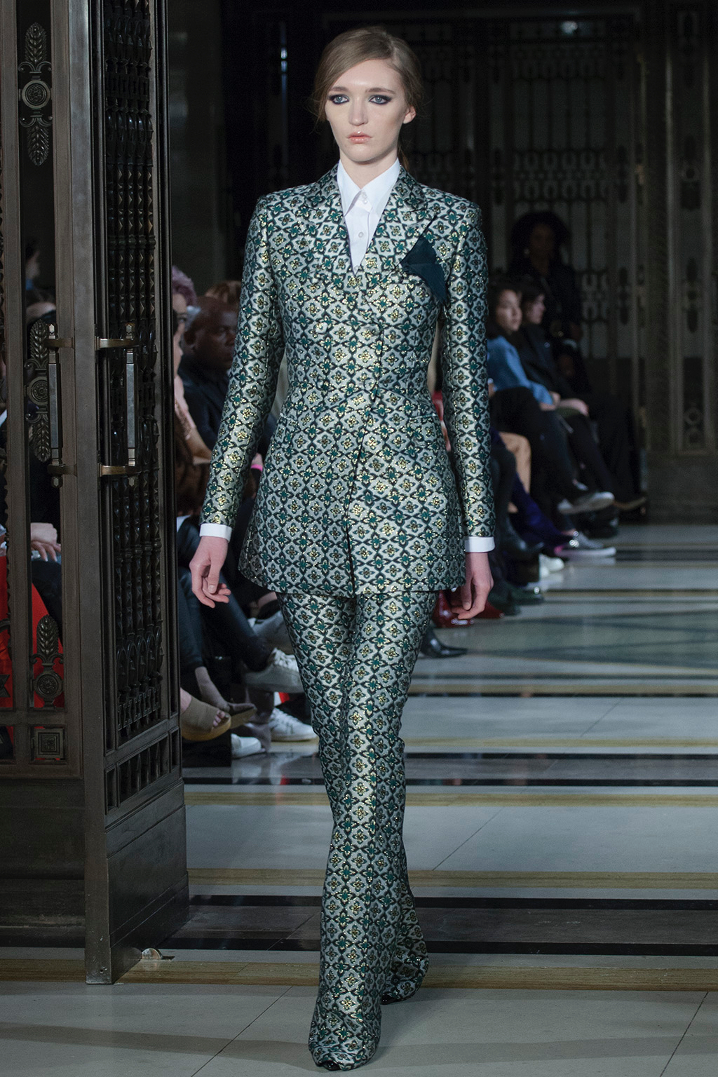 With a colour palette ranging from classic green and regal elements of pewter and apricot, the liquid fluidity of the garments nods to a futuristic display whilst still informing the theme of the film that inspired it. The composition of shapes, silhouettes and designs of suits, dresses and coats bring joy and undoubtedly left the spectators mesmerised.