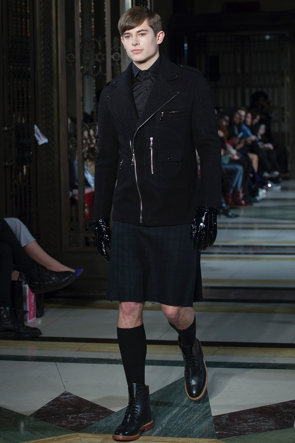 Bringing Hollywood luxe to life proved no issue for Breton, with notes of rich colours like green and gold, metallic grey and sequin embellishments that paraded to the 1930s music. Structured shirts paired with shearling style collars contrasted with the motifs of pine green and gold brocade, which were seen on printed trouser suits, hooded jackets and trench coats. Mac rain coats in black and shearling-trimmed jackets were paired with kilts for a classic heritage twist.