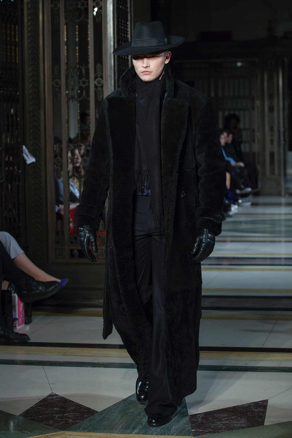 Featuring imperial prints and features reminiscent of Chinese watercolour, the collection exemplified the essence of true luxury and power. Richness was instilled through silk fabrics, brocade embellishments and angora. Velvet appeared frequently with delicate ornamentation in the form of fedora hats, acting as a re-imagination of Chaplin’s iconic bowler style.