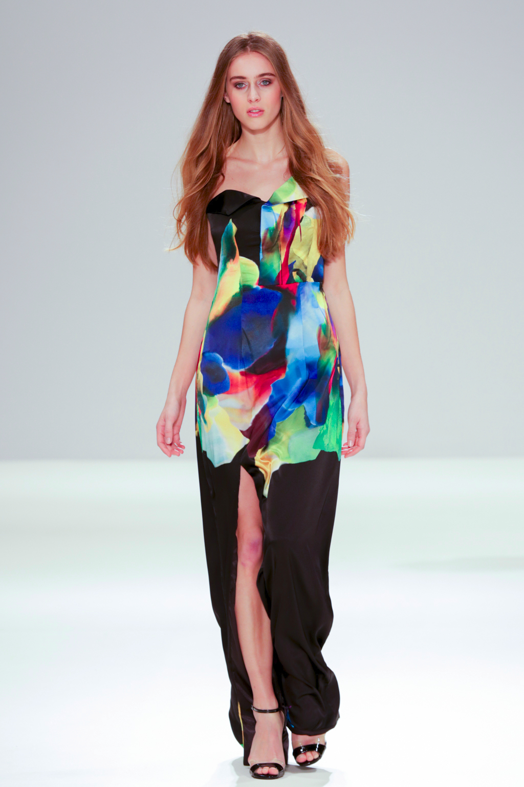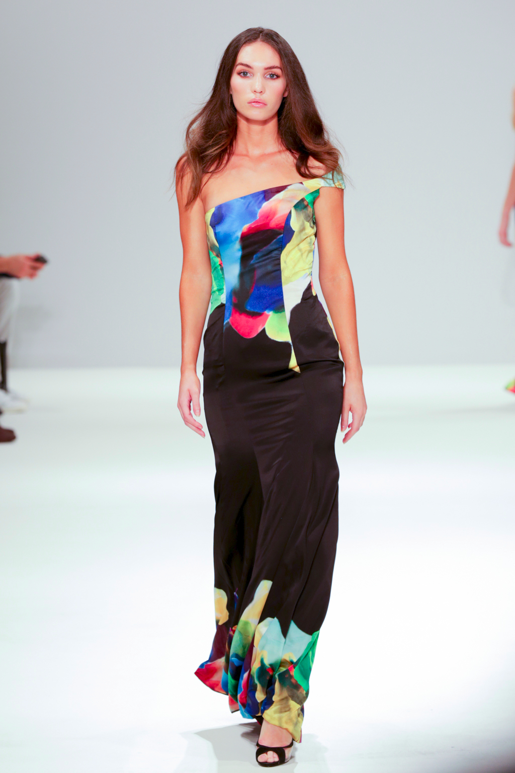 Elements of the collection strayed from the colour palette Mimi usually adapots, with pops of vibrant neons in orange, green and blues. These appeared in the form of sequinned crystal encrusted flowers and on digitally printed silk thigh-high split garments. Favourable mention goes to a dress with contrasting black skirt style which juxtaposes the sequinned sleeves in red, neon green and royal blue. The long free-flowing natural hair did little to distract from these details and instead brought further attention to the sheer elements and tulle trains. The black – gold and neon – decorated garments resonated the vibe of girl power that the up beat music preached.