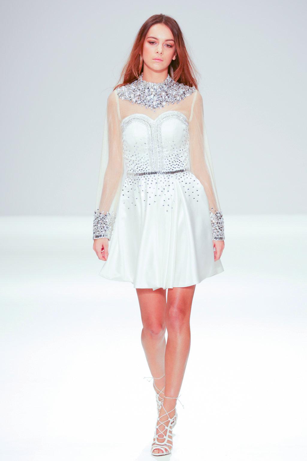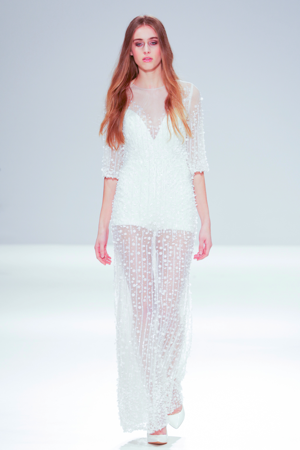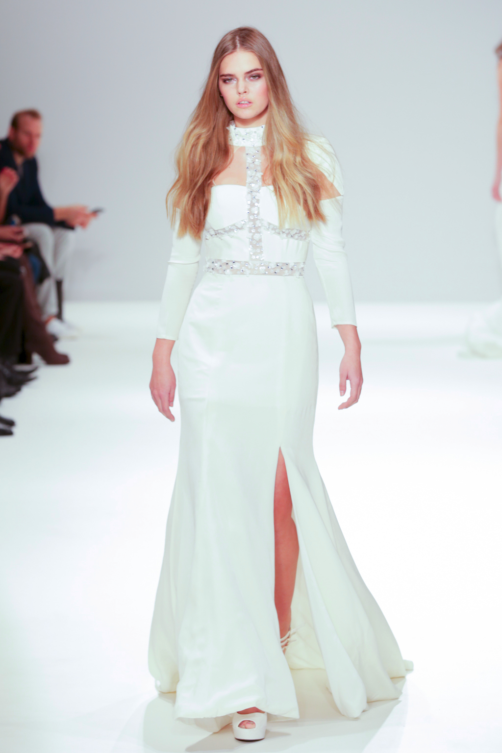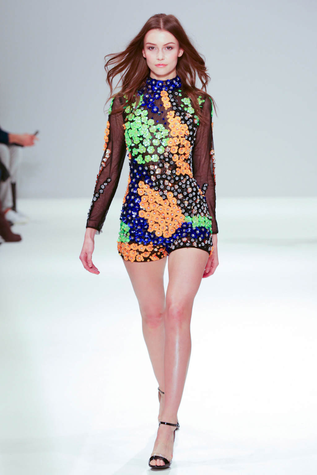 As the antithesis of this, a haunting rendition of Immortal by Marina and the Diamonds filled the Freemason’s Hall whilst models flaunted Grecian-looking dressed. The sequinned encrusted flowers featured here too in silver and white, contrasting to the earlier bright neons. Recurring ideas of purity, glamour and immortal life were evident in the song choice and the looks with jewels, pearls, sequins and lace. The star of the show was the final look of a floral appliqué mid-sleeve ball gown-style dress, complete with large glittering crown. Coupled with the floral motifs that appeared through the collection, the jewelled crown stole the eye of the audience.