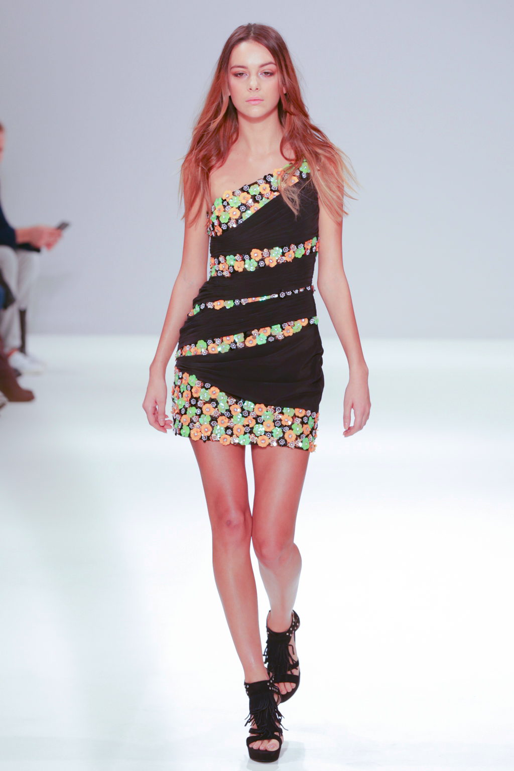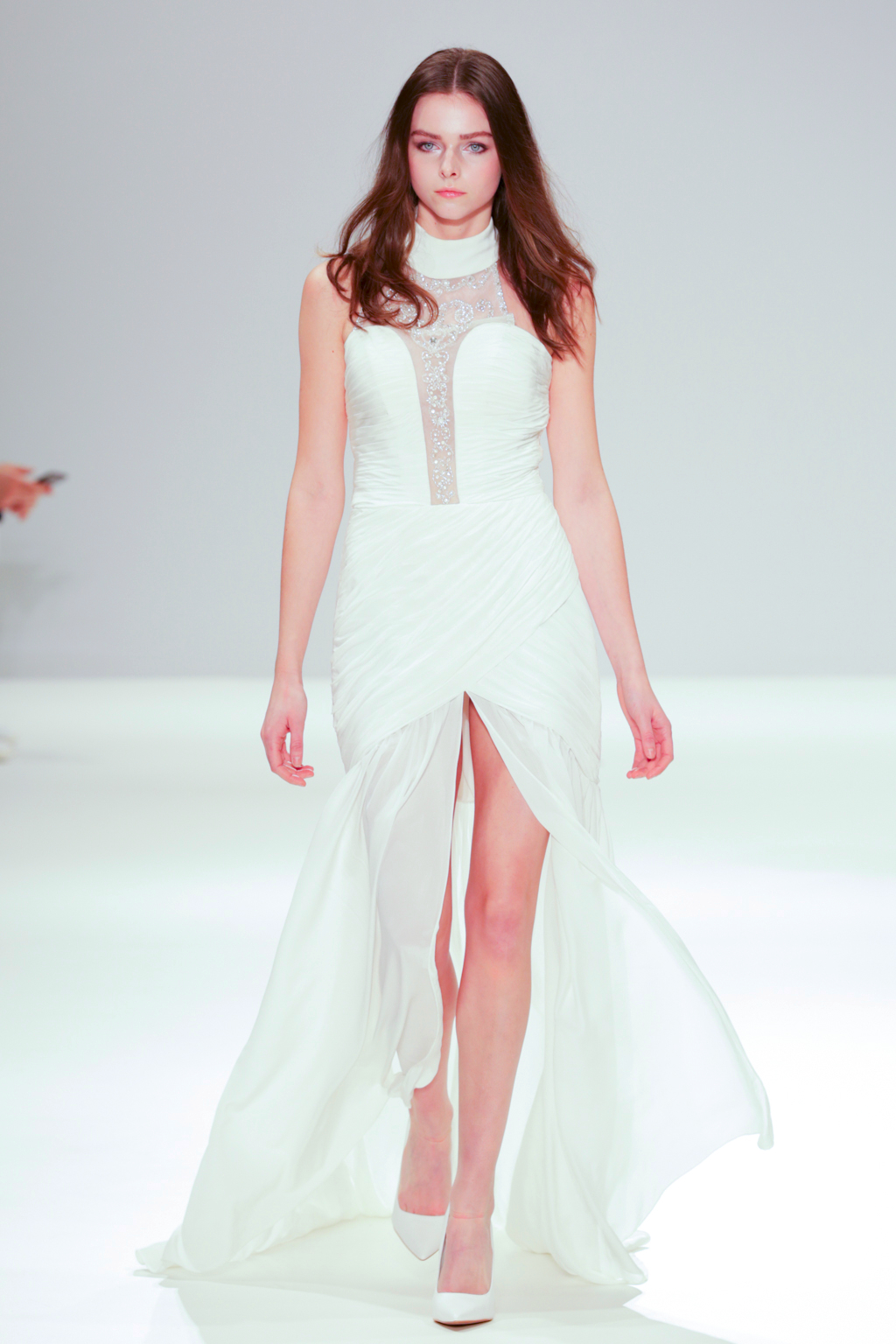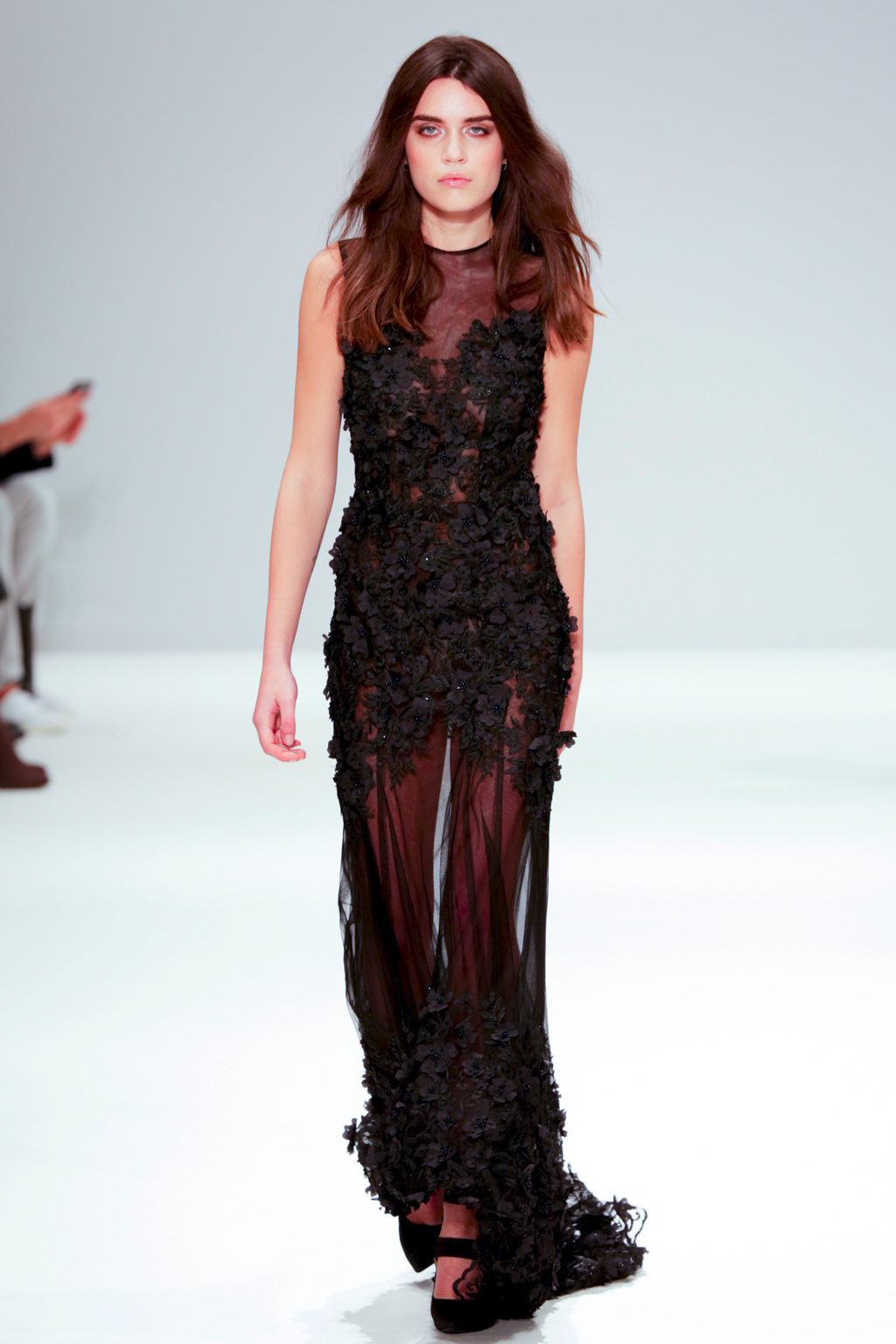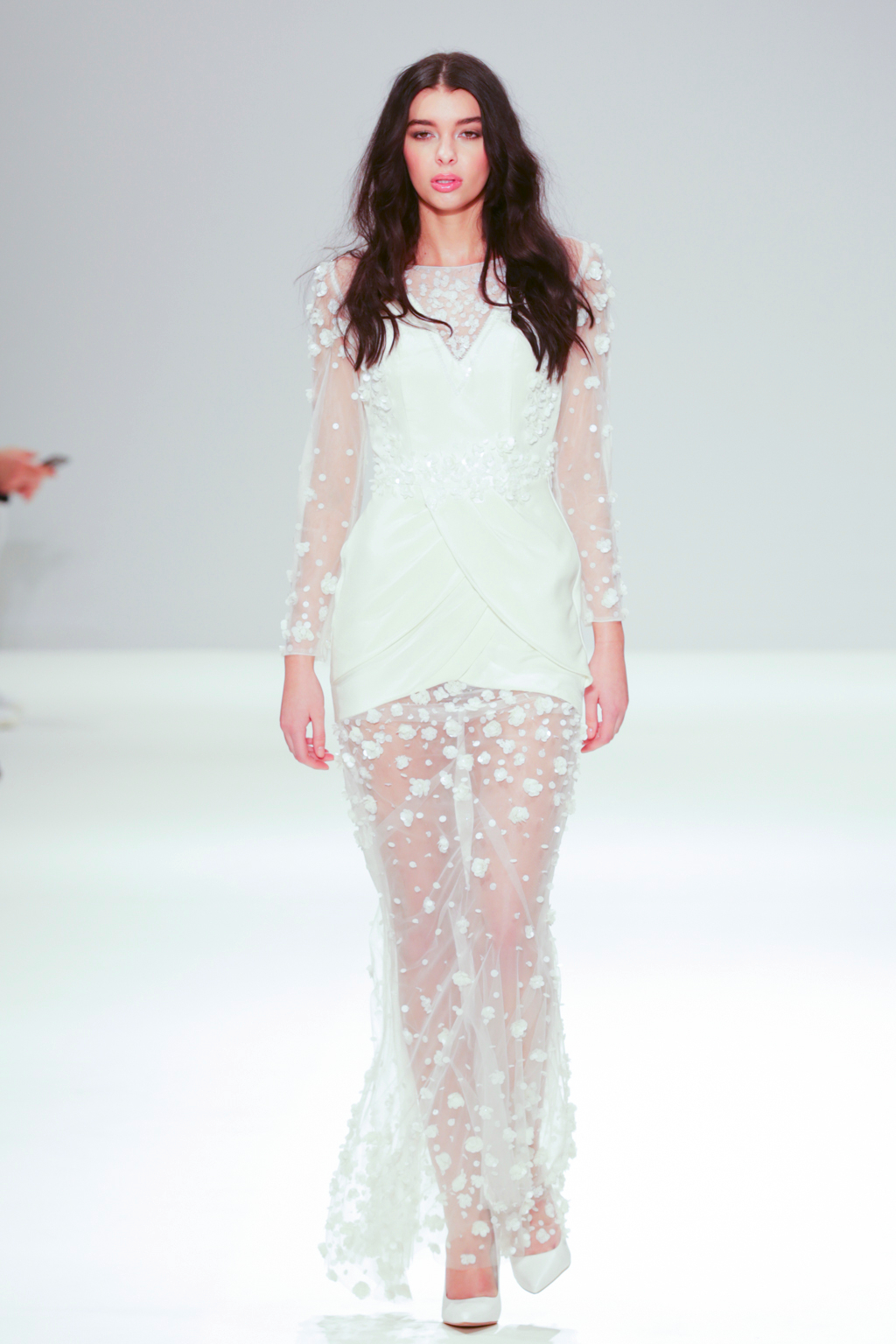 As the antithesis of this, a haunting rendition of Immortal by Marina and the Diamonds filled the Freemason’s Hall whilst models flaunted Grecian-looking dressed. The sequinned encrusted flowers featured here too in silver and white, contrasting to the earlier bright neons. Recurring ideas of purity, glamour and immortal life were evident in the song choice and the looks with jewels, pearls, sequins and lace. The star of the show was the final look of a floral appliqué mid-sleeve ball gown-style dress, complete with large glittering crown. Coupled with the floral motifs that appeared through the collection, the jewelled crown stole the eye of the audience.