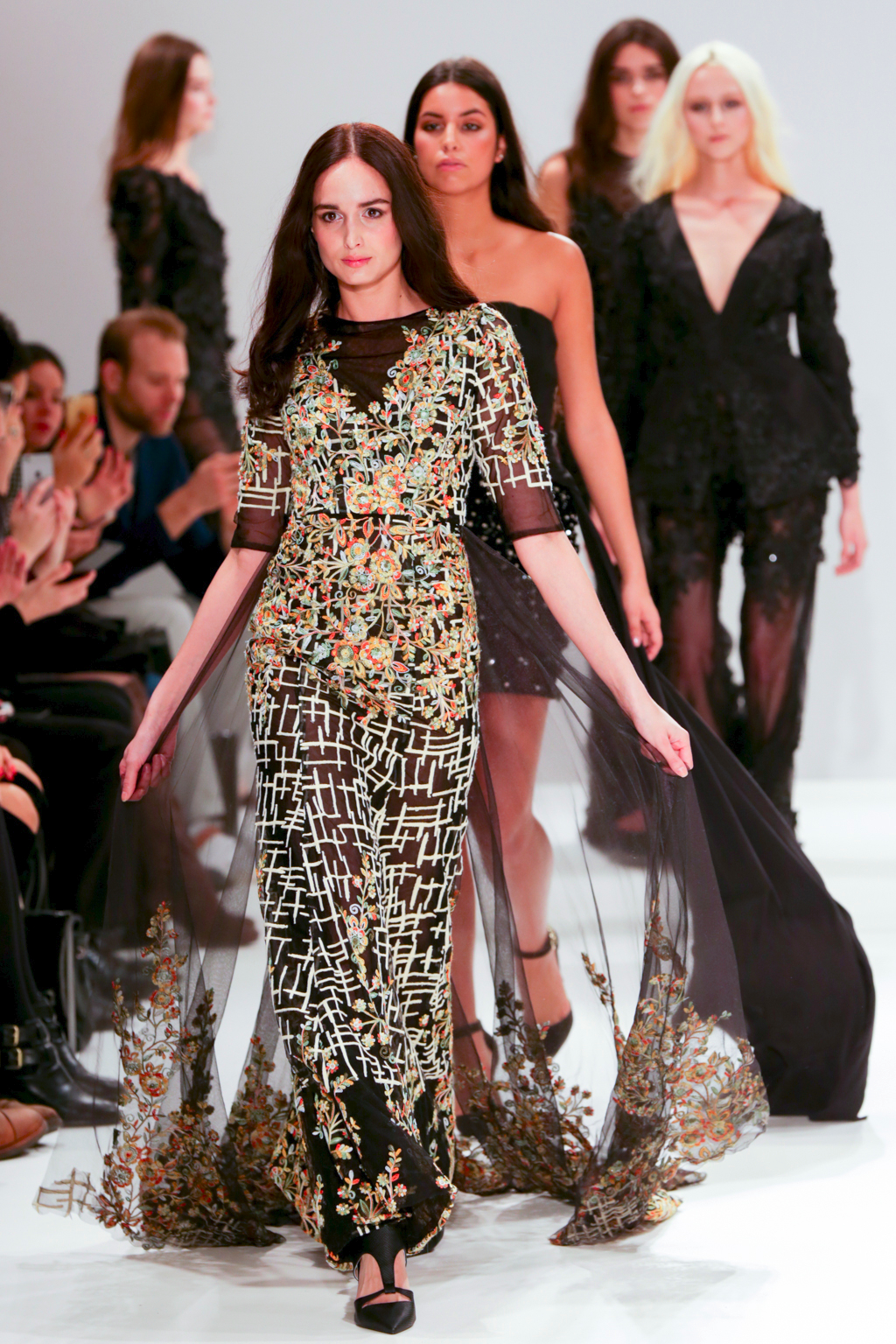 Rich fabrics like 3D lace and digitally printed silk were used to celebrate beauty and femininity with form-fitting midi dresses and flowing maxi dresses. Off the shoulder, one shoulder and long sleeves could be seen accentuating sensuous feminine curves. Luxuriant materials like silk and gold hand crafted ornamentation made the collection sensuous, exclusive and unforgettable.