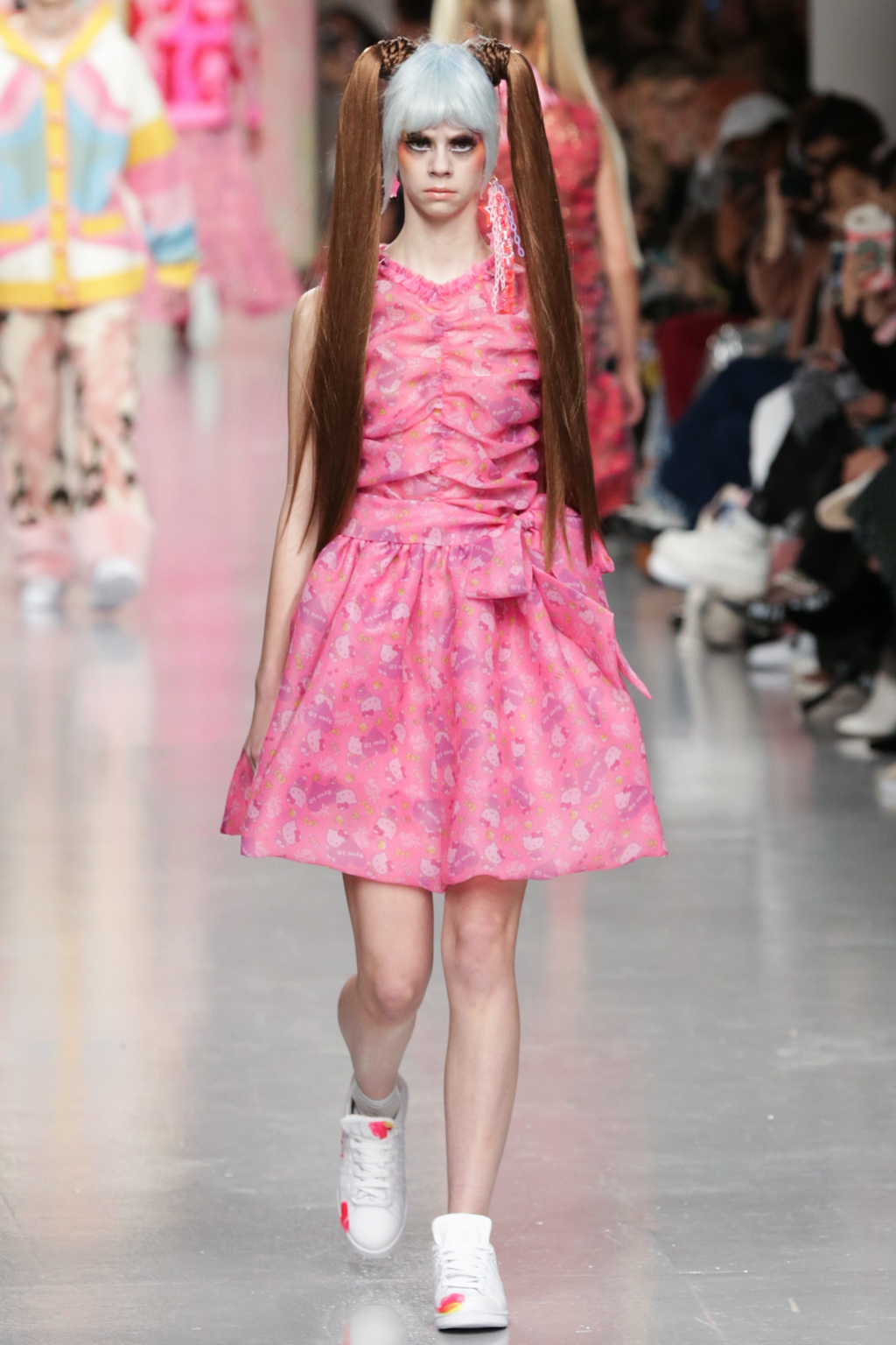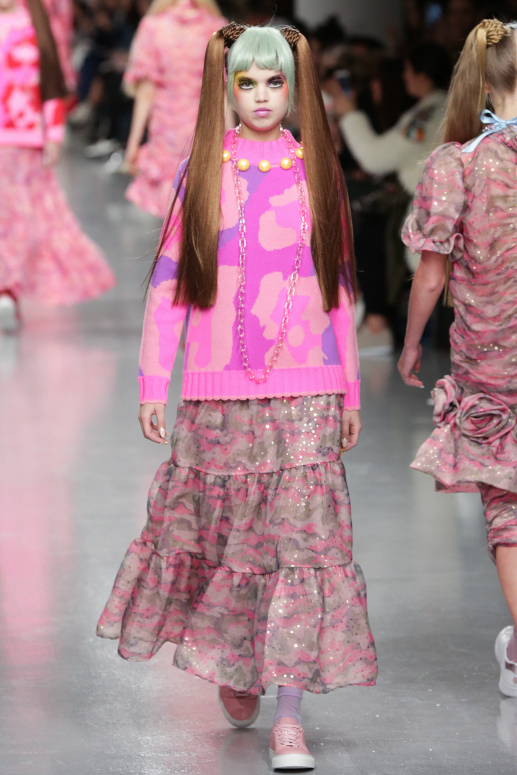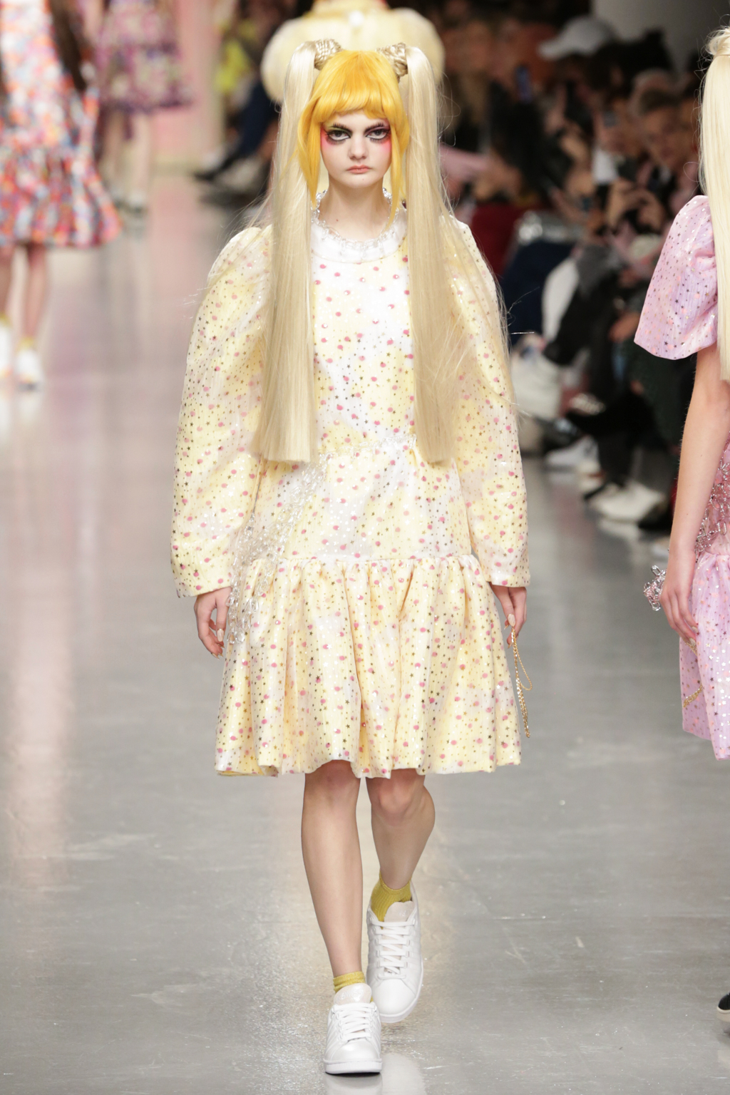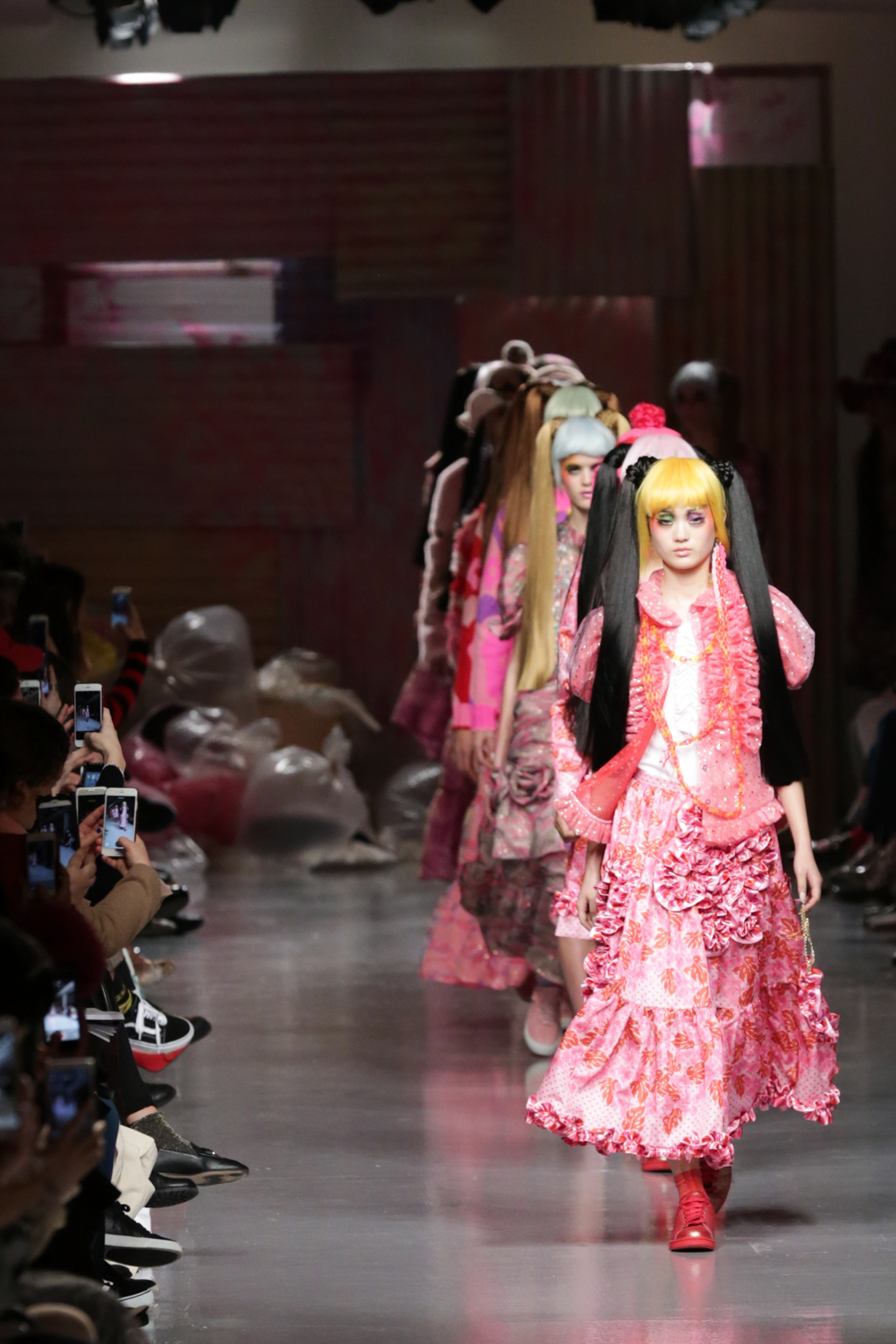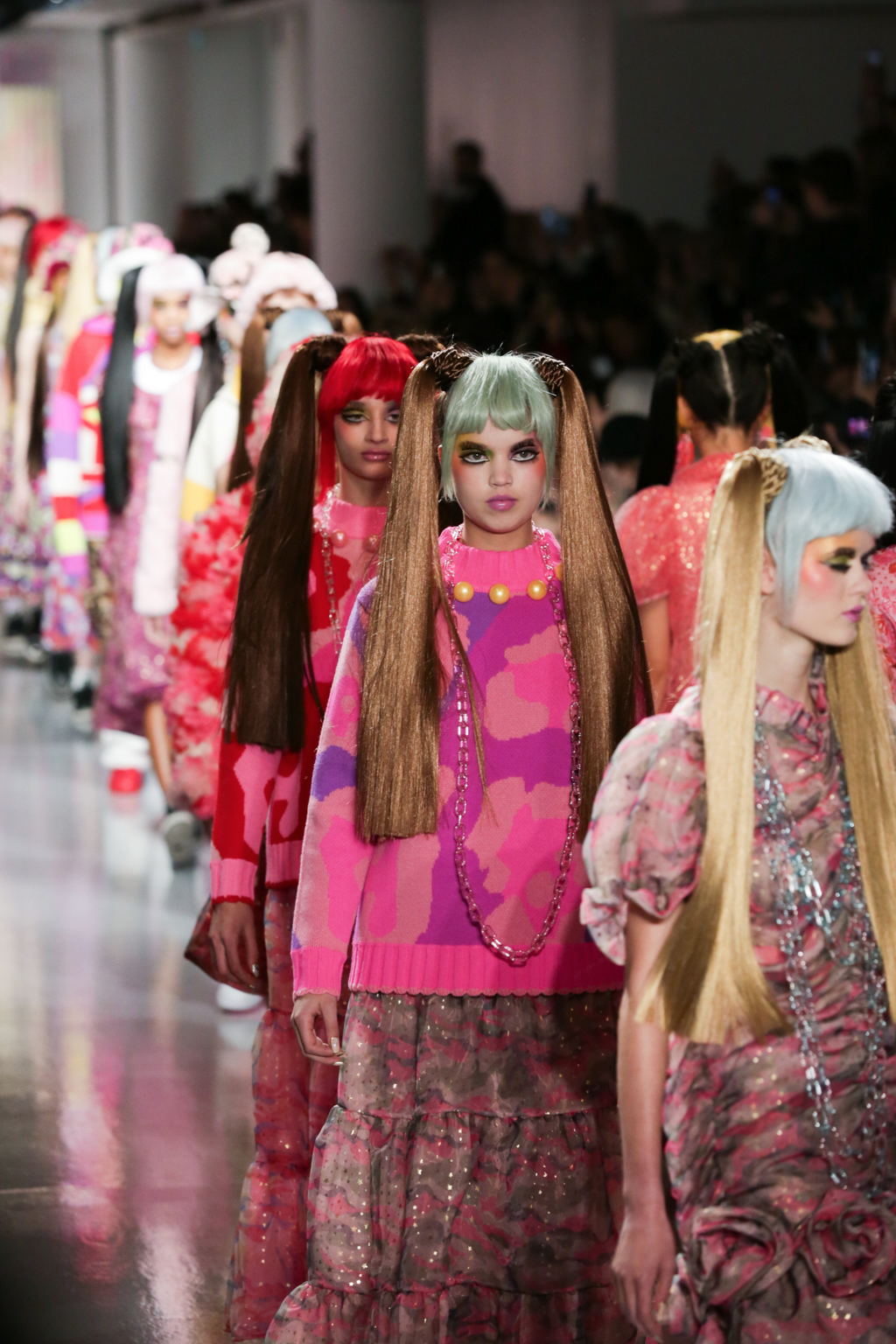 Adolescent-looking models wore waist length pigtails with pastel-tinted fringes and doll-like eyelash extensions.
