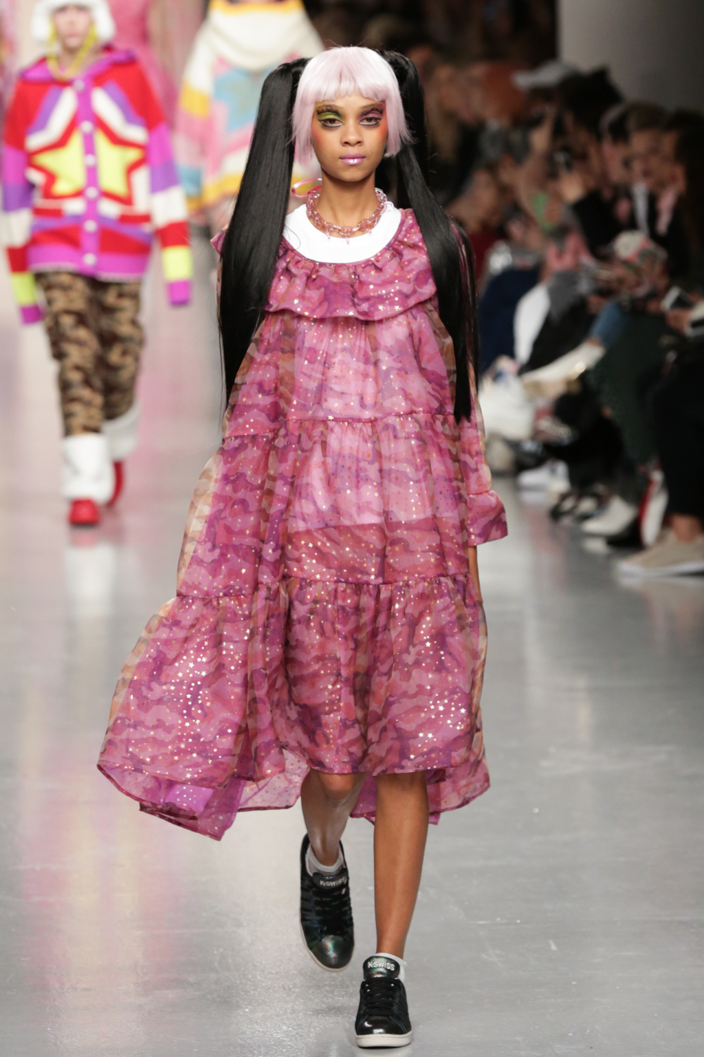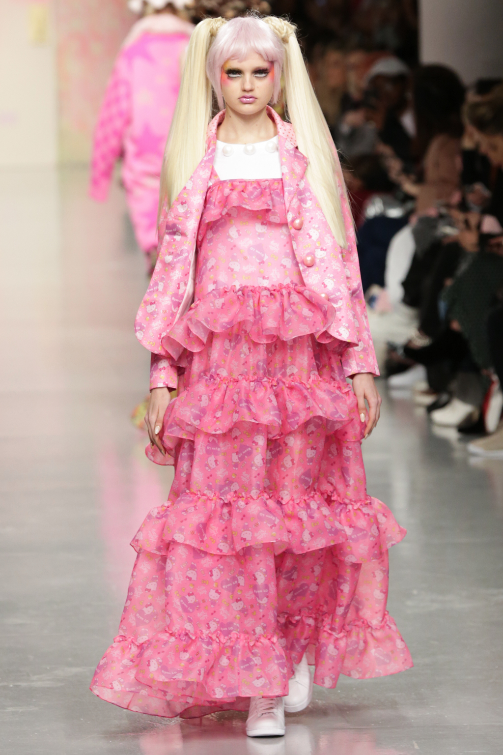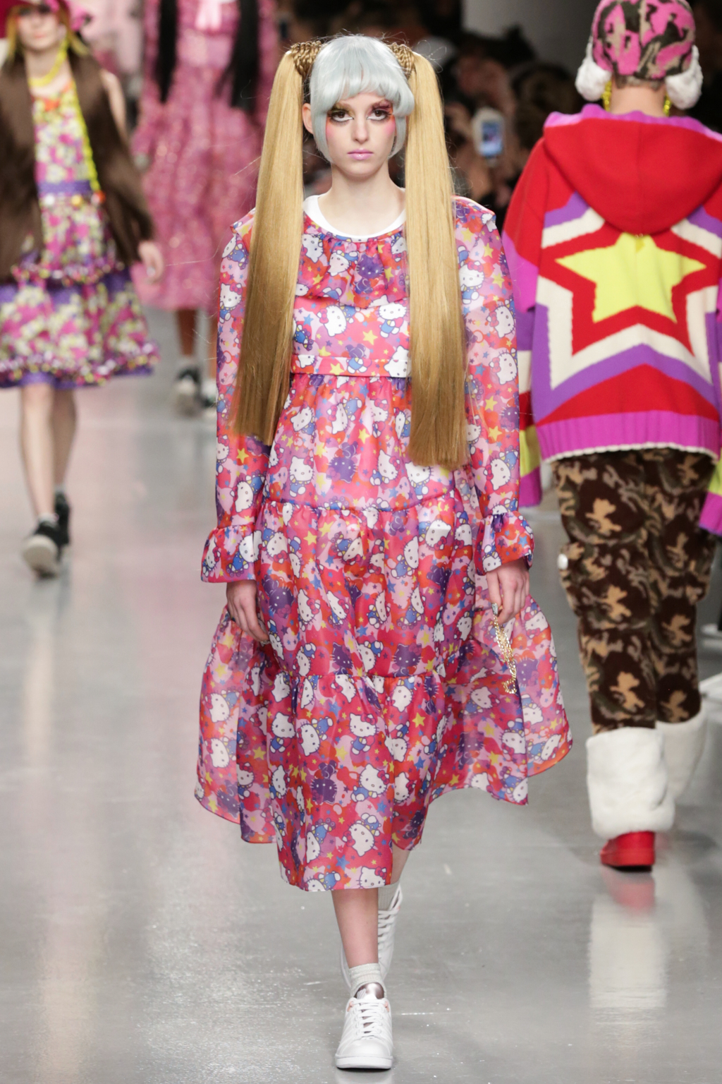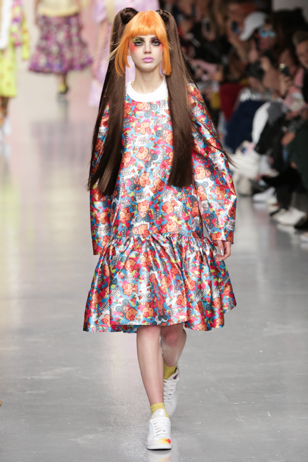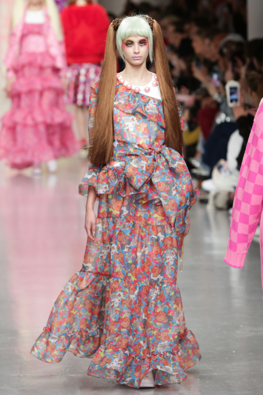 Adolescent-looking models wore waist length pigtails with pastel-tinted fringes and doll-like eyelash extensions.