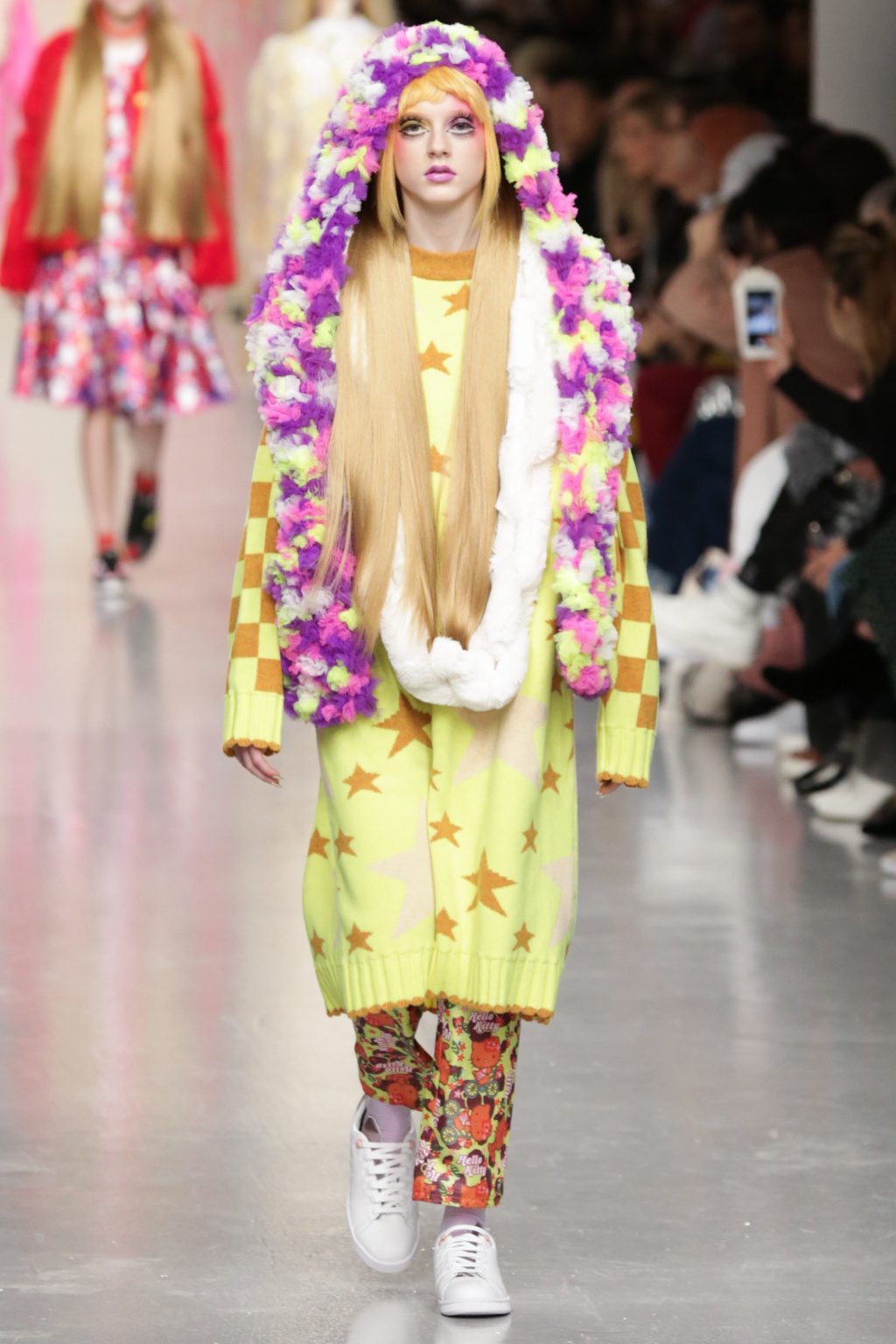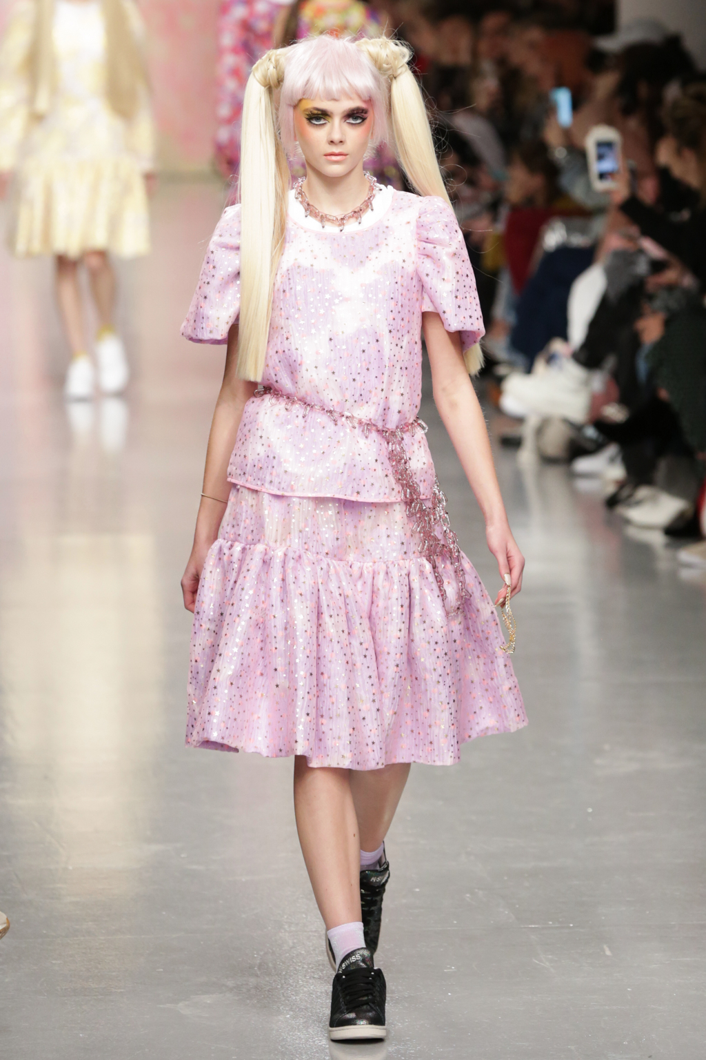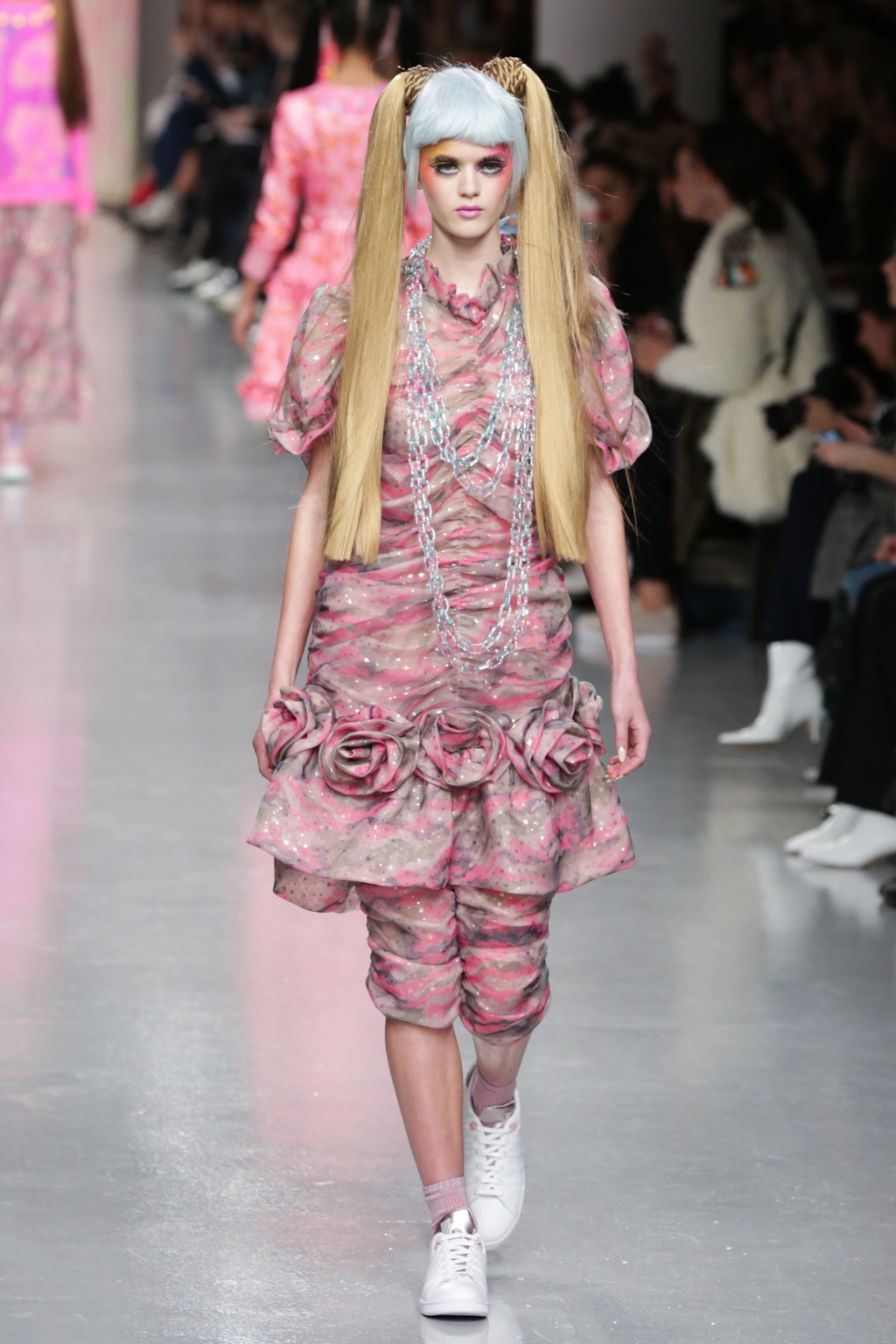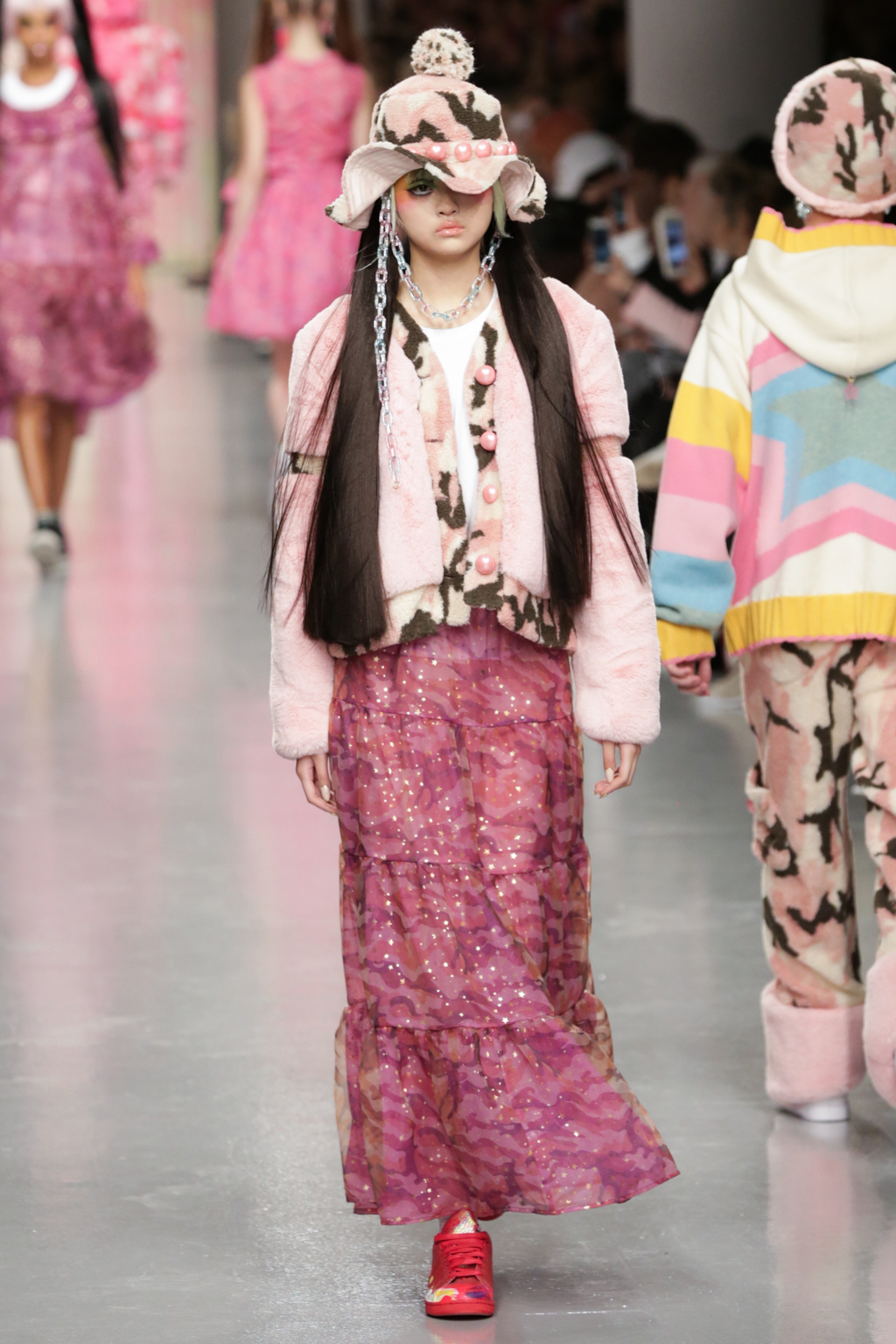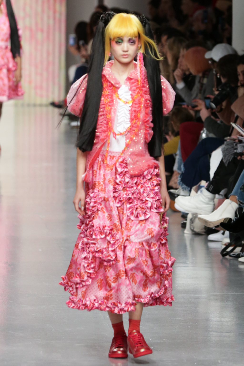Adolescent-looking models wore waist length pigtails with pastel-tinted fringes and doll-like eyelash extensions.