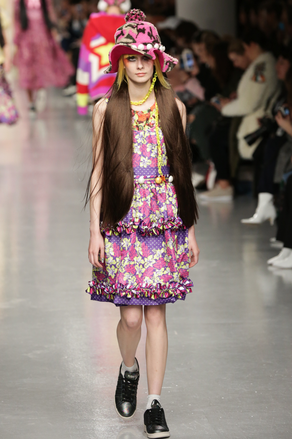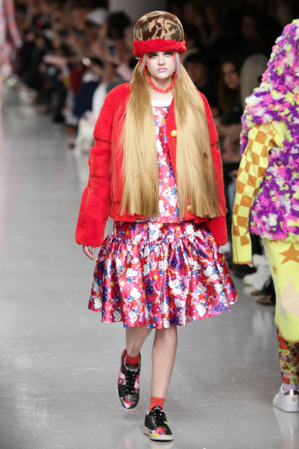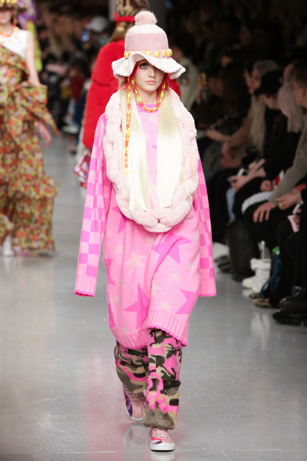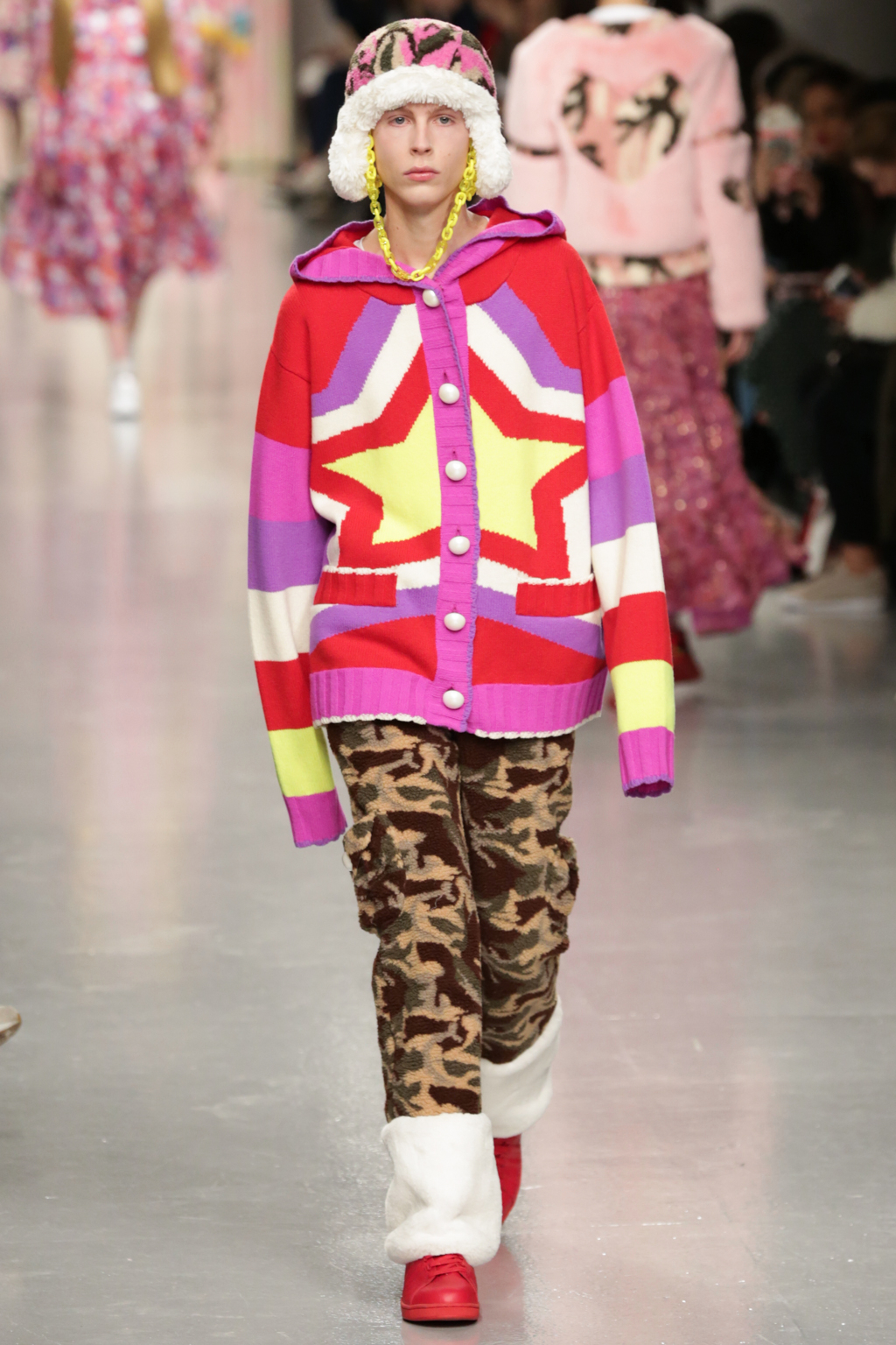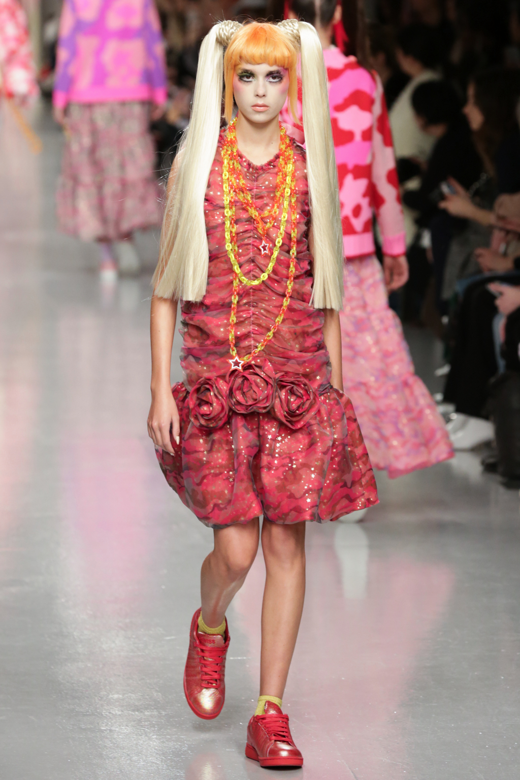 Signature ruffled organza dresses were displayed in candy and hot pinks, brilliantly clashing reds, cartoon-like camouflage and polka dots. Unisex combat trousers and heavy jumpers in unexpected brash shades and universally worn pump style trainers brought a contrasting boyish edge. Caricatured skater headgear, created in collaboration with Stephen Jones, plastic neon chains and giant pearls completed the sassy girl look.