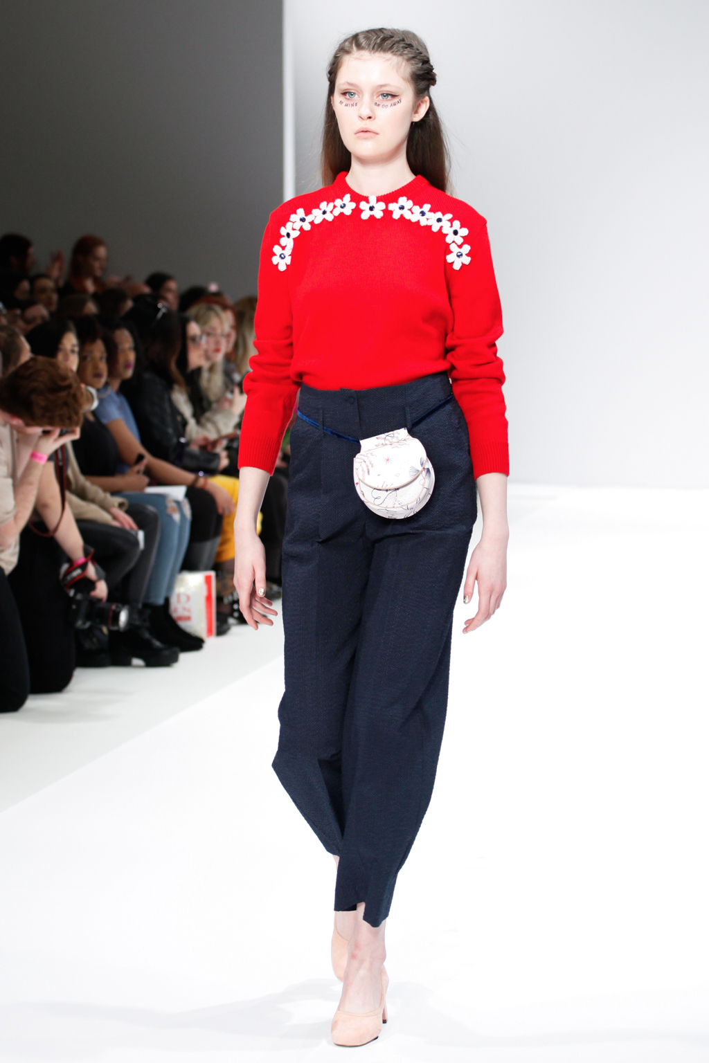 The show opened with music reflective of a lullaby or child’s nursery rhyme evoking the idea of nostalgia and school-ground style, cleverly shown in the eclectic mix of belt bags, velvet style dungarees coupled with a chunky cowl neck jumper and pops of colour in the form of collars, buttons and floral belts. The music then became an eclectic upbeat mix that married together with the colour palettes of navy, white, mint green, pink and burgundy.
