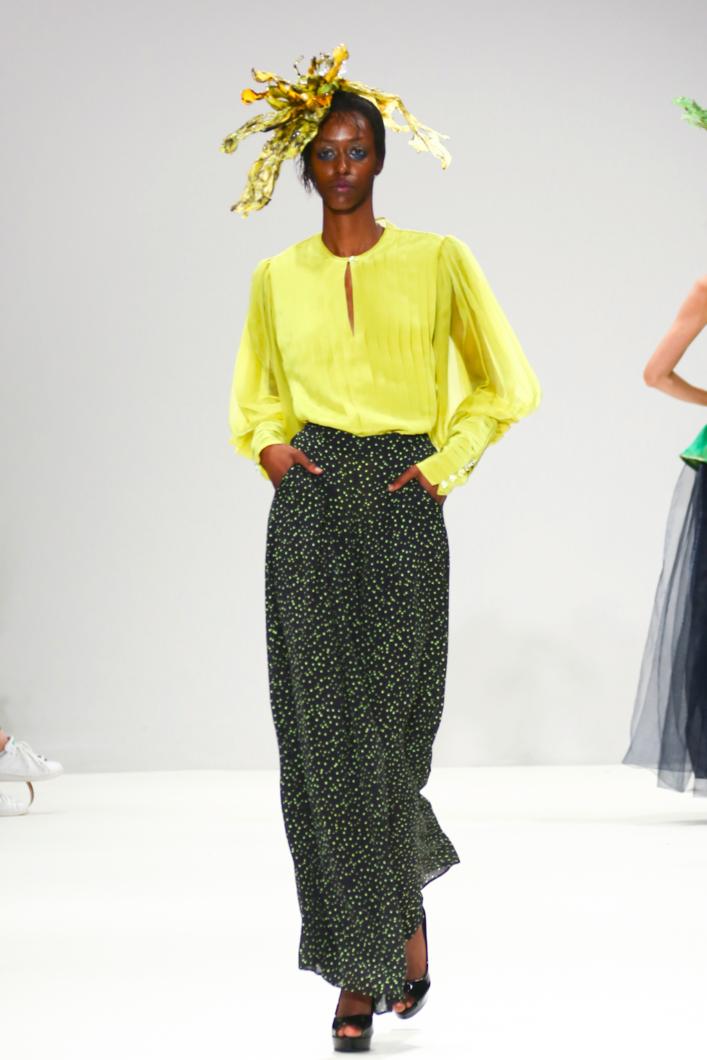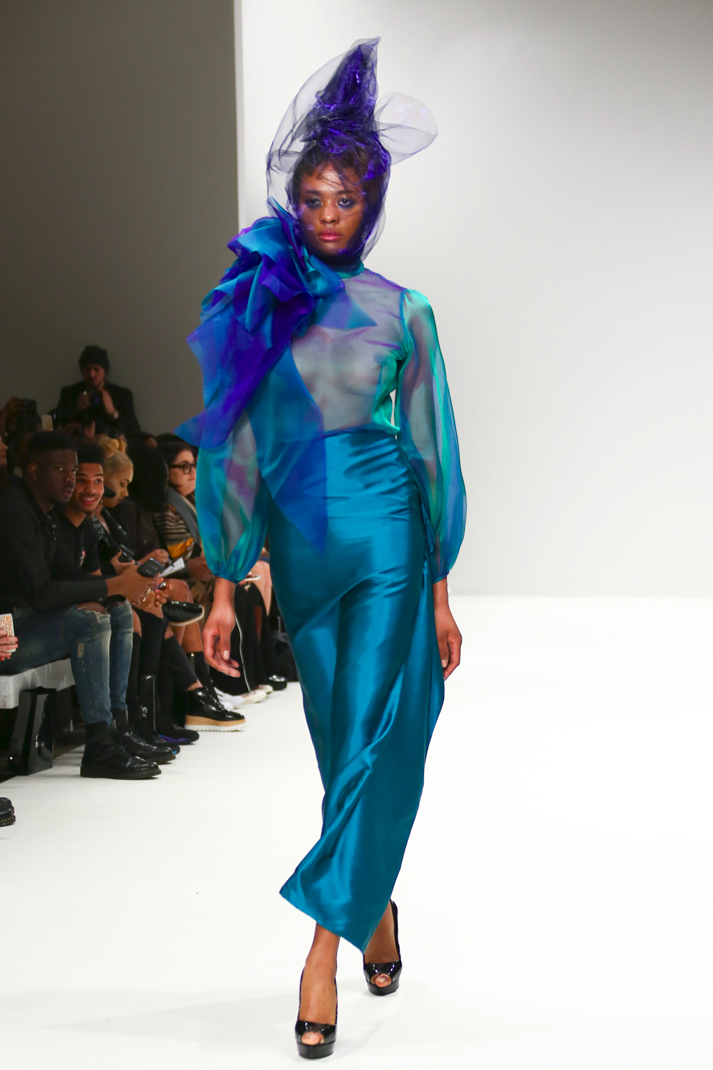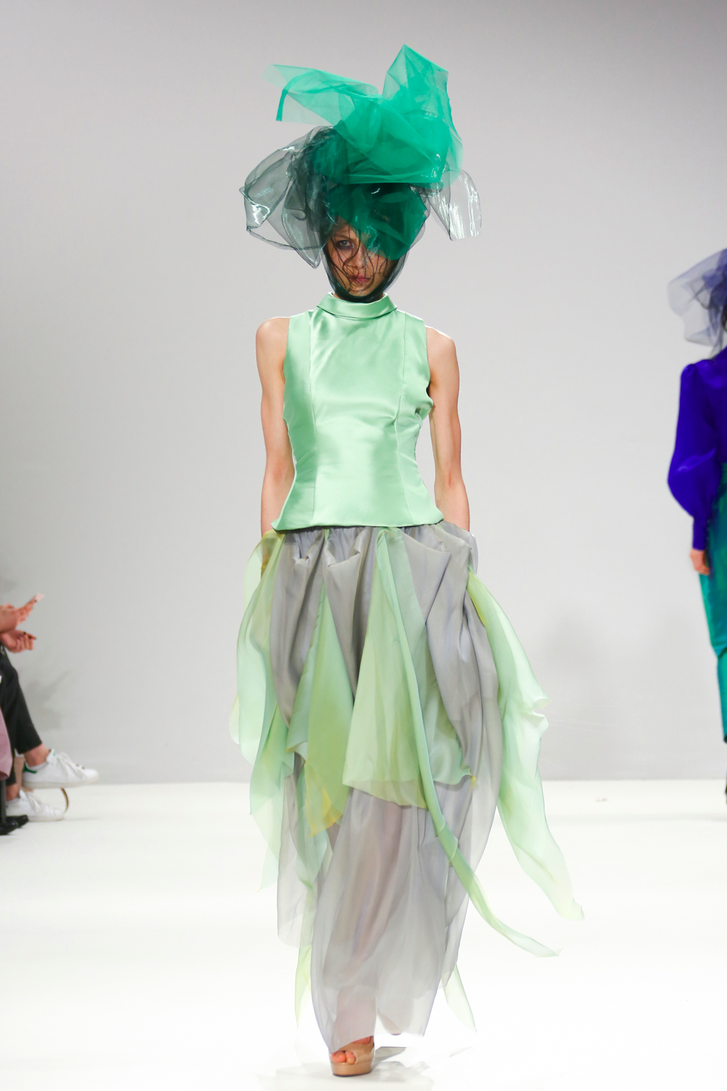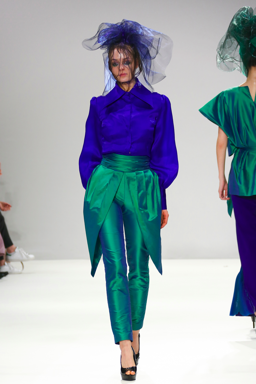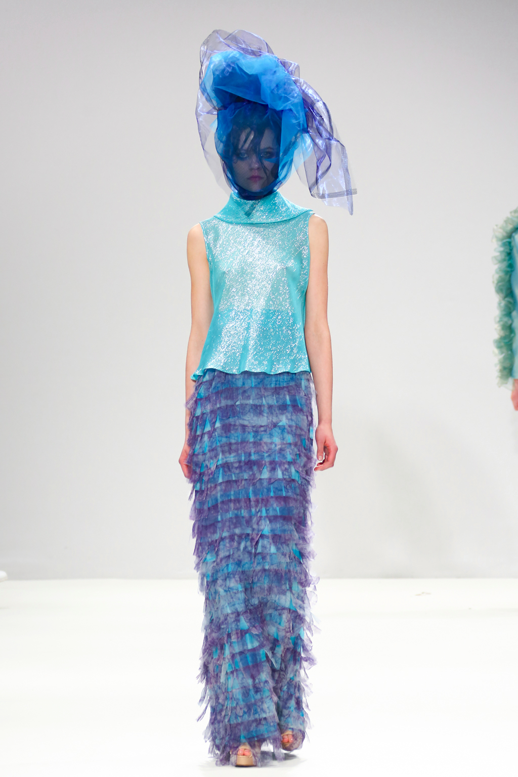 It was an explosion of shiny ruffled blazers in turquoise, maxi skirts resembling seaweed, sculptural headdresses and translucent capes which created a dreamy and deep effect. The gowns presented here were ones that could be worn by musicians with theatrical performance and on red carpet.