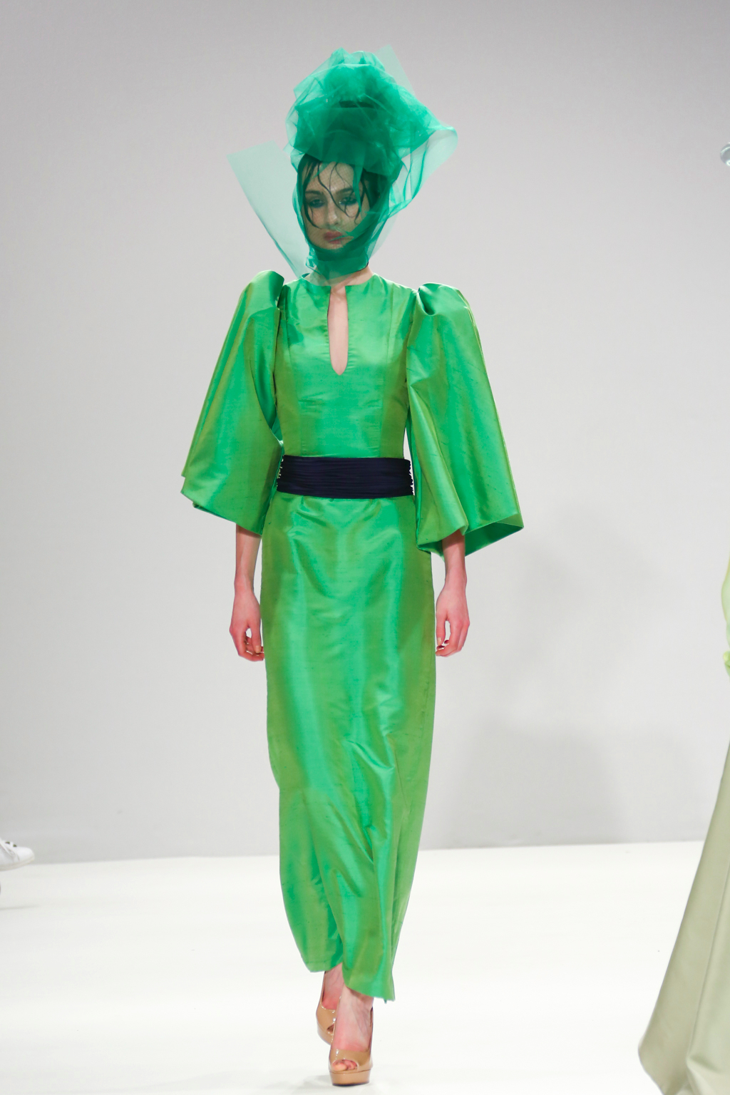 Through her signature draping of gossamer fabric she creates voluminous sleeves and skirts, in occasionally asymmetric shapes. The algae motifs throughout the collection tie the whole collection together with the underwater theme, and the title of the show Unbound represents the free spirited nature of the garments and the people who wear them.