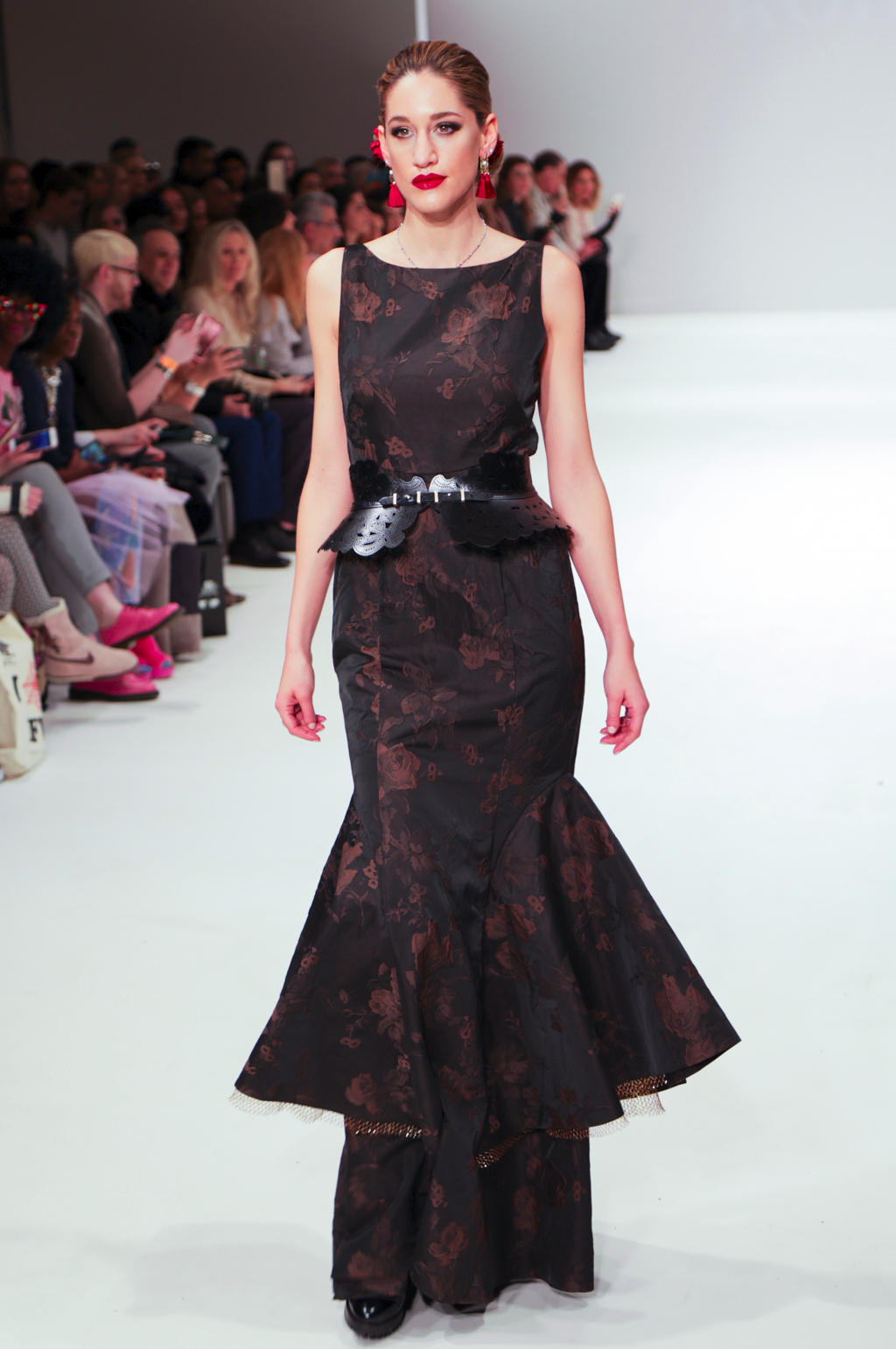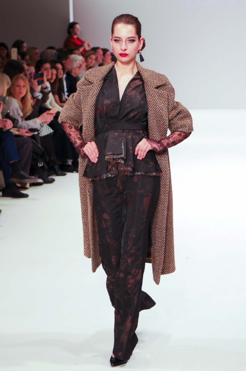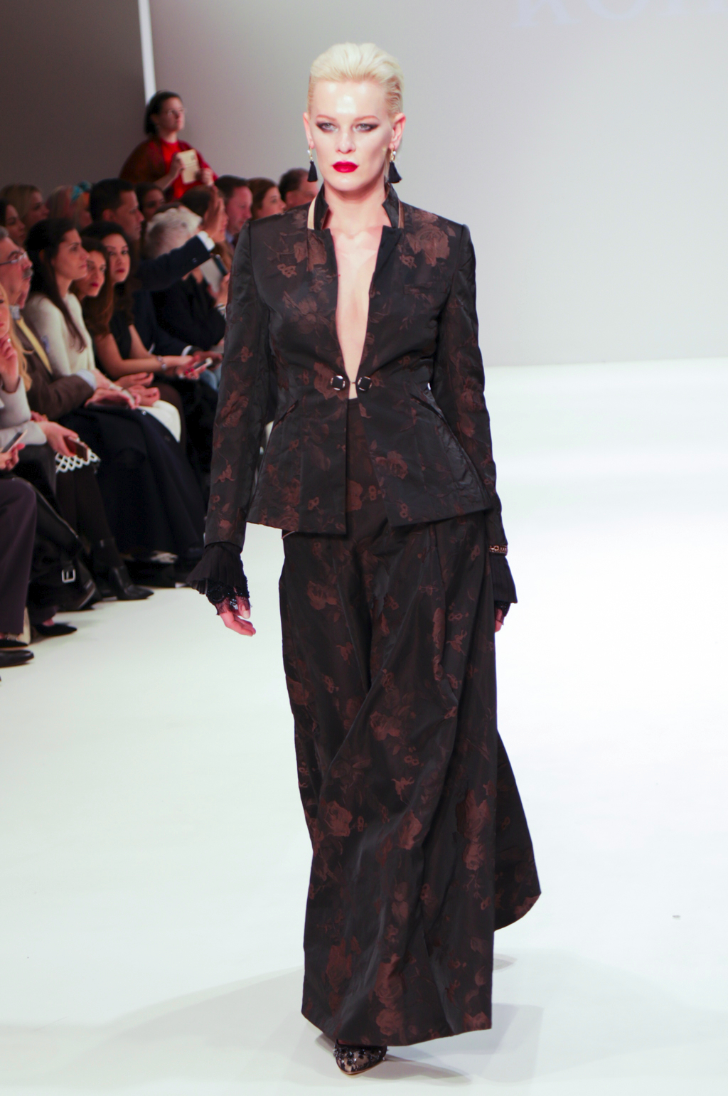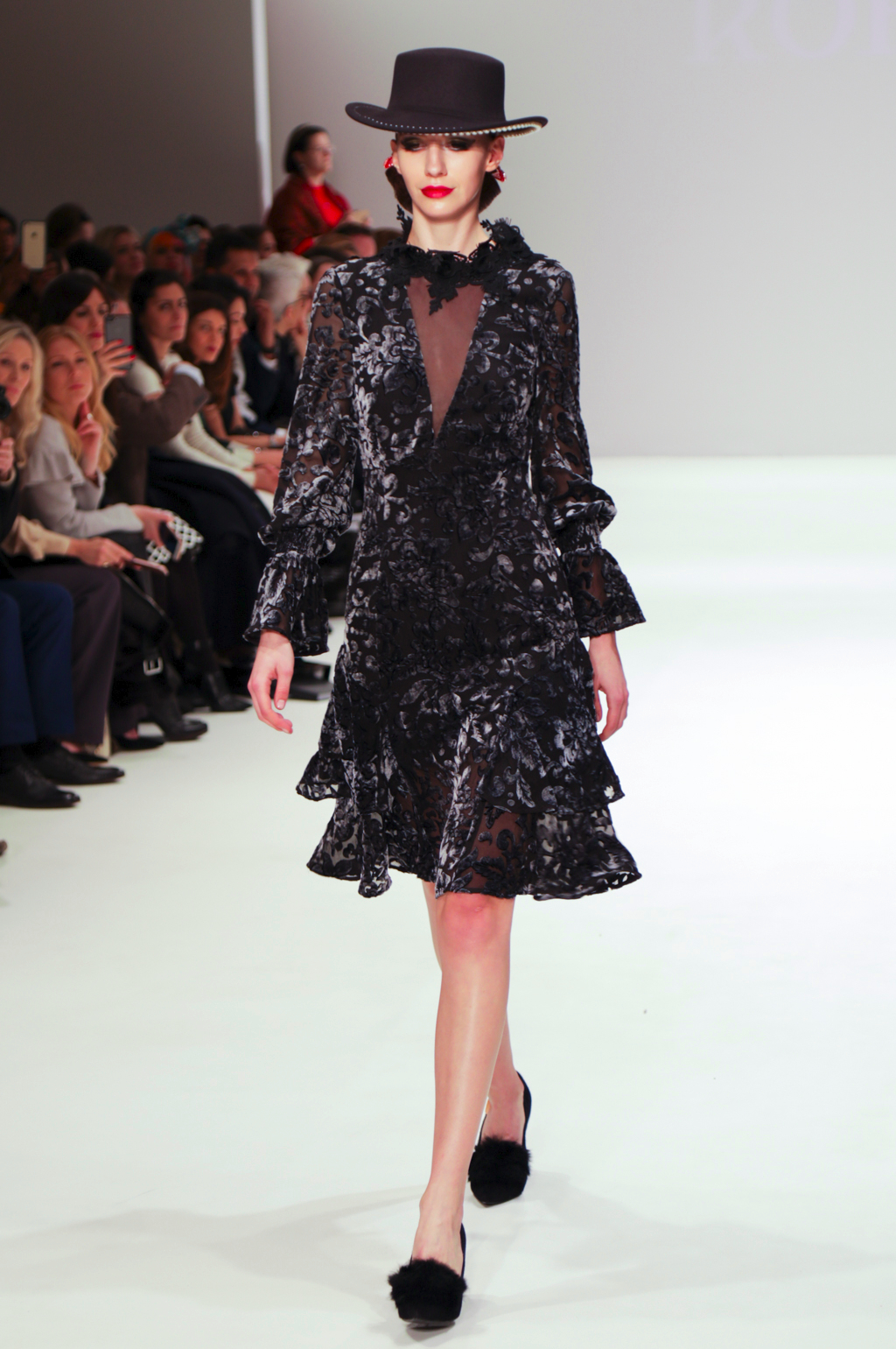 Rohmir’s AW17 show is titled El Castillo Secreto: this magical journey was an exploration of Spanish-inspired clothing through flamenco. The show included a mesmerising flamenco performance, followed by a sea of metallic brocade coats and dresses, black matador hats, velvet prints, pussy bows, puffed pirate shirts, red fur linings and fringing. It was a new take on traditionally Spanish clothing, and could be seen worn by contemporary women.