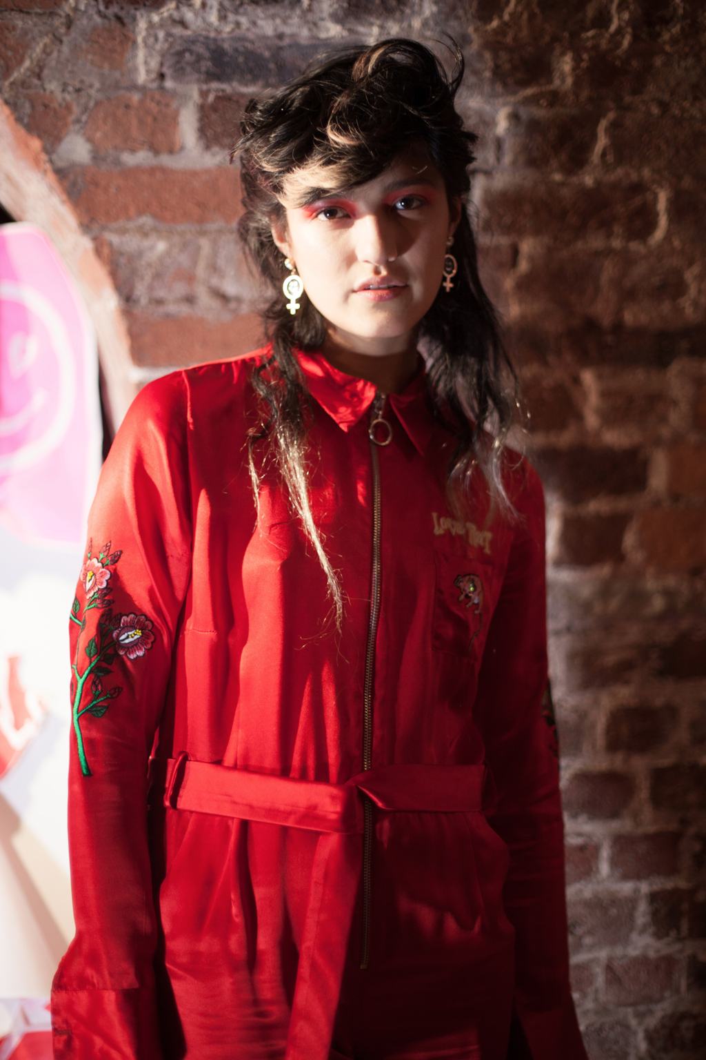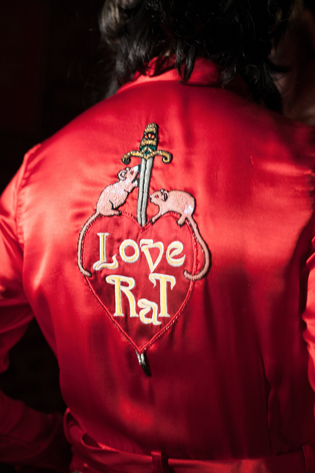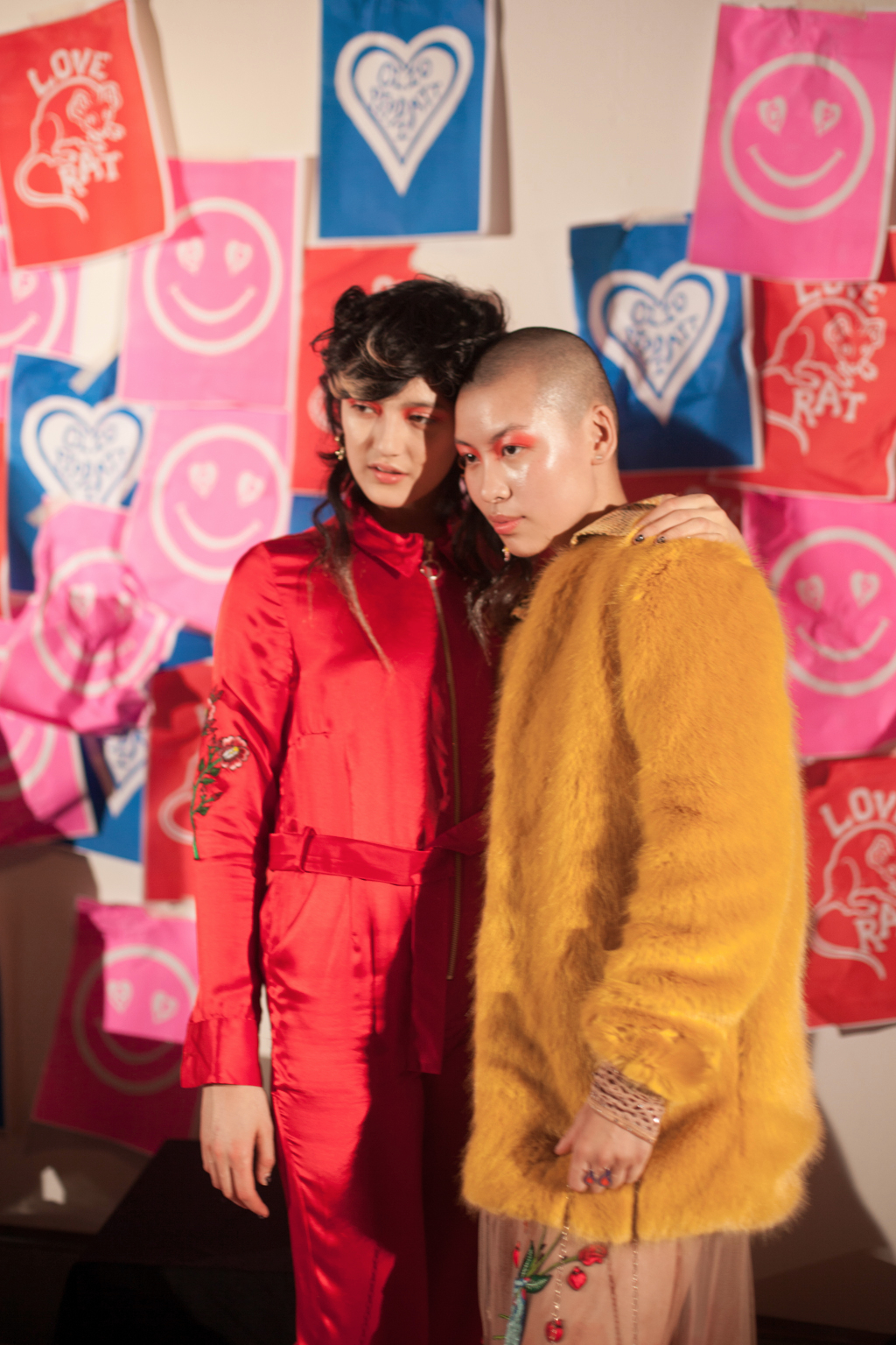 Signature embellishments and embroidery featured, such as on a Chinese inspired red silk jumpsuit zipped up to a collared neck with “love rat” sewn on the front and back.