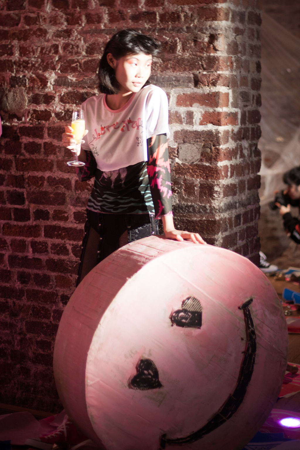 Tongue-in-cheek giant hand painted pink smiley faces were rolled around, glitter balls thrown in the air, and shapes thrown to a heavy beat by the rebelliously styled youthful models.
