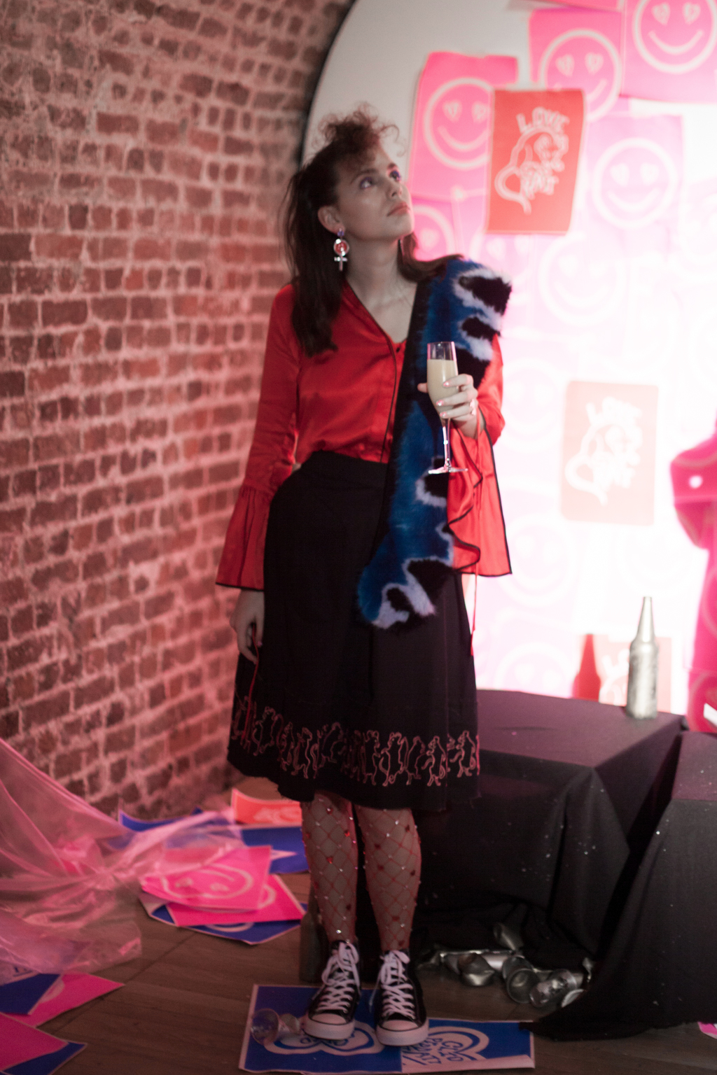 Floaty skirts with cartoon graphics were paired with embroidered streetwear jumpers and fishnets while a purple velvet dress was worn with a black printed blouse underneath. Faux fur was made edgy appearing in star pattening as a hooded coat and an outlandish blue, black and grey stole.