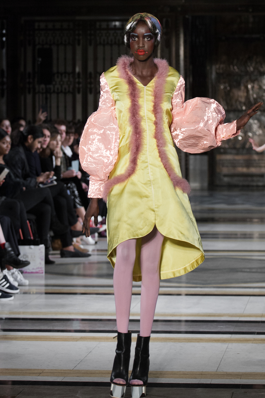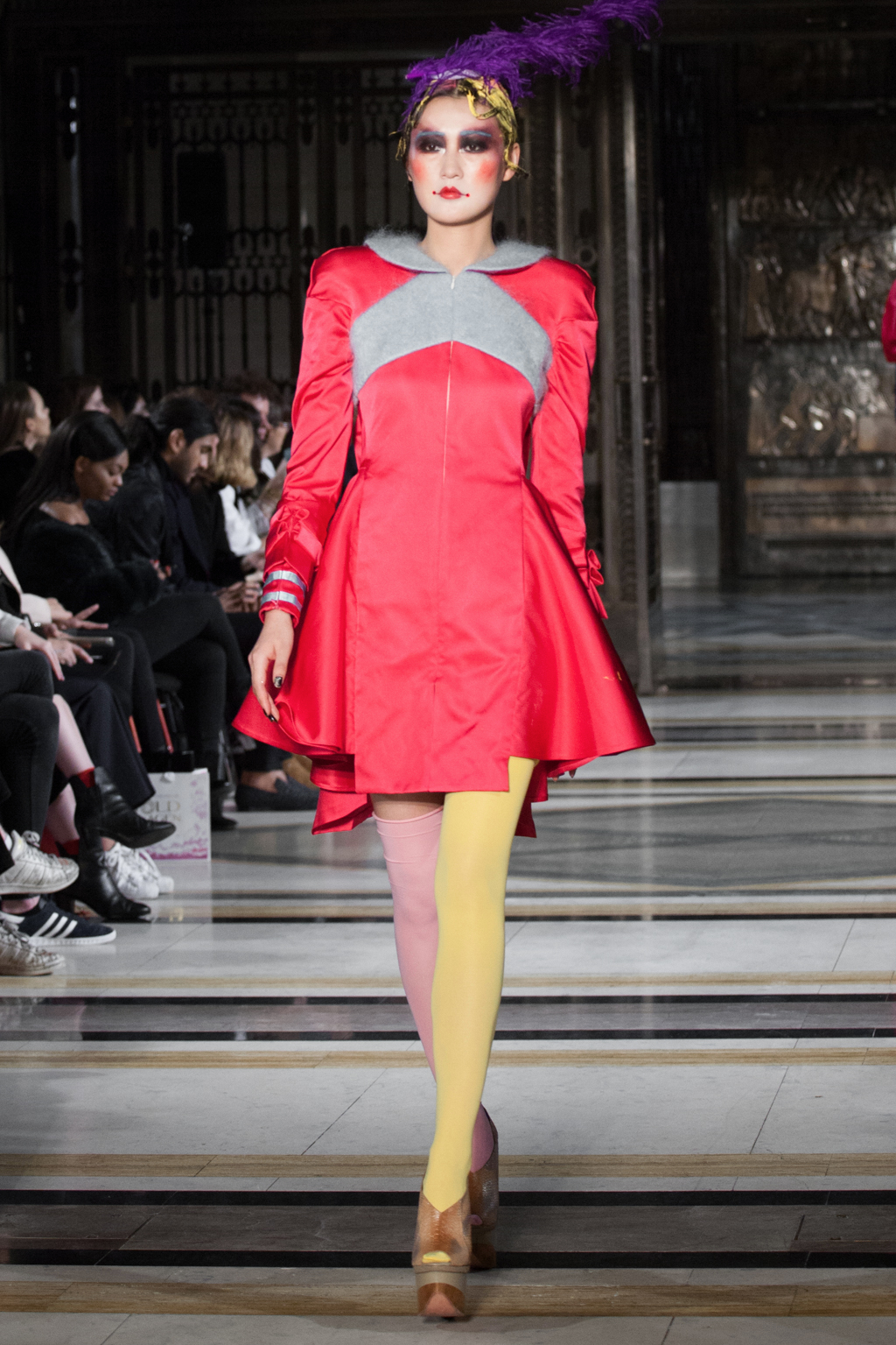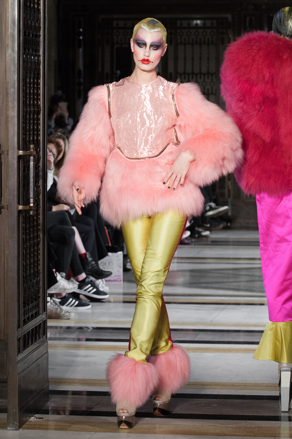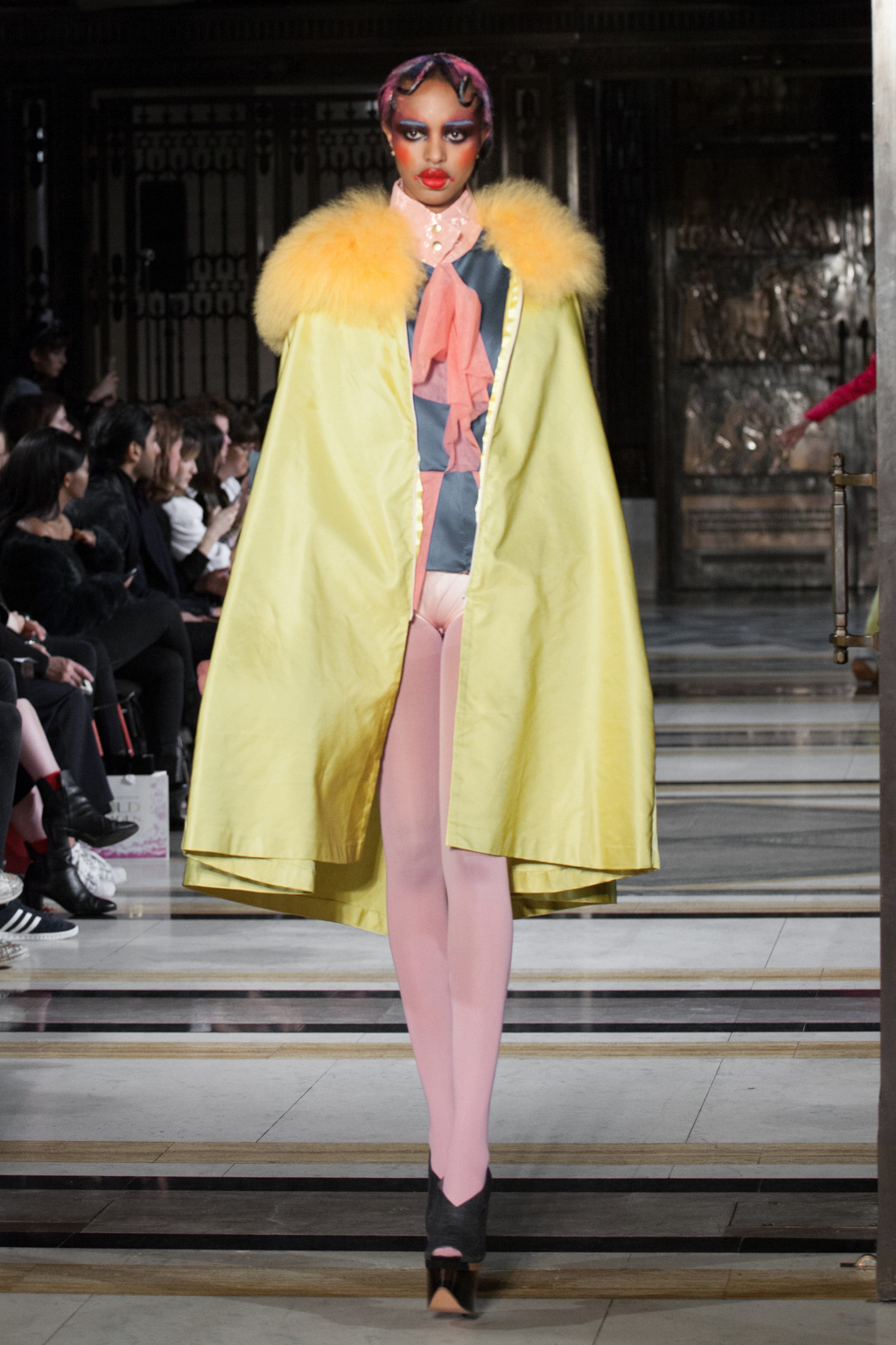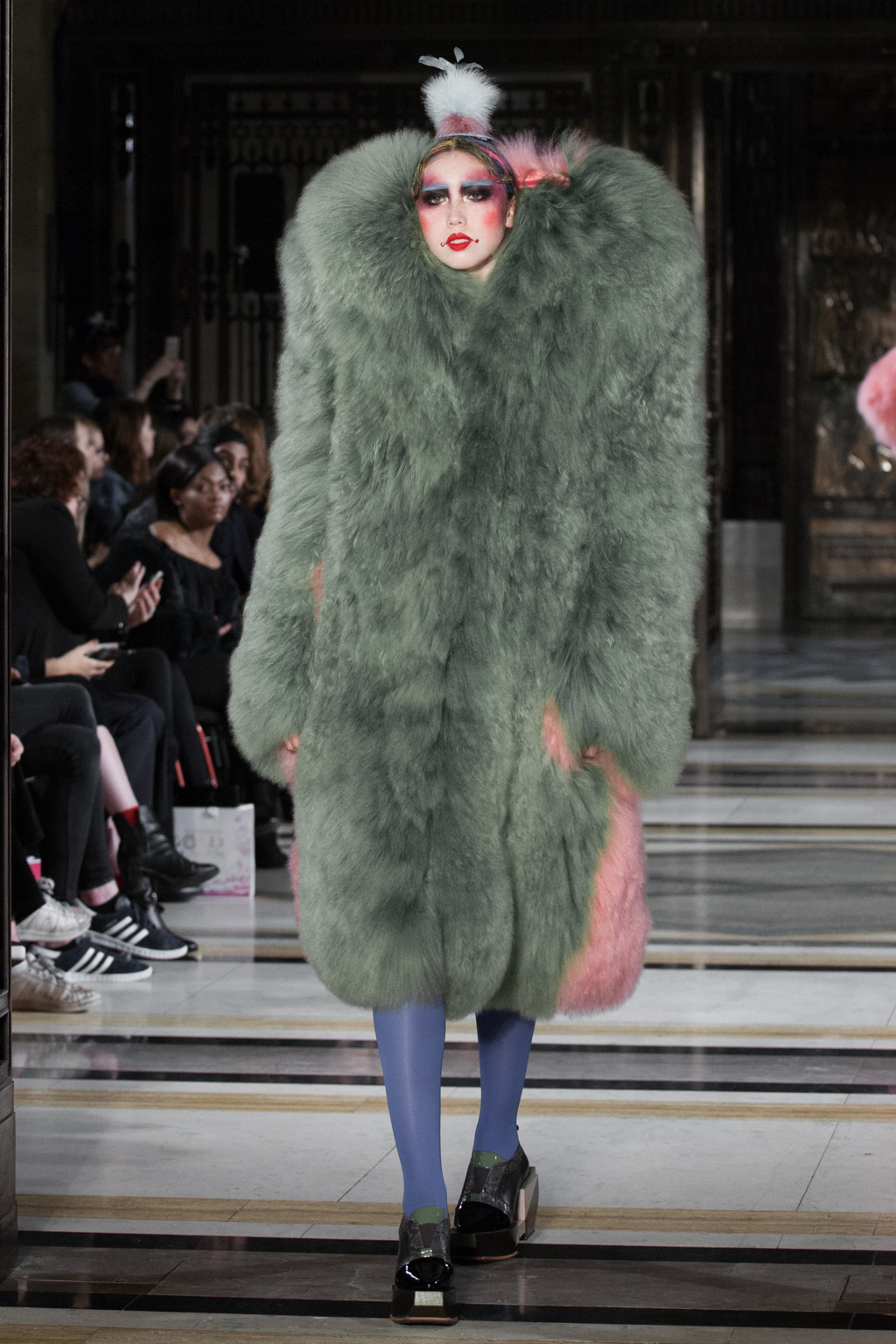 Clown-like makeup enhanced the models’ peculiar other-worldliness. Many of them were furry creatures; one fur coat was off the shoulder, whilst another model was cocooned in fur which extended to the level of the model’s head, creating an enormous silhouette that was hard to ignore, even for those sat in the back rows.